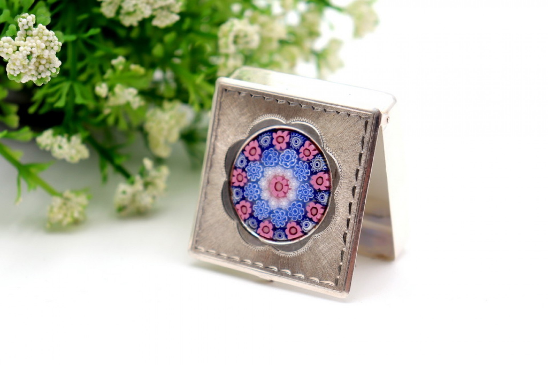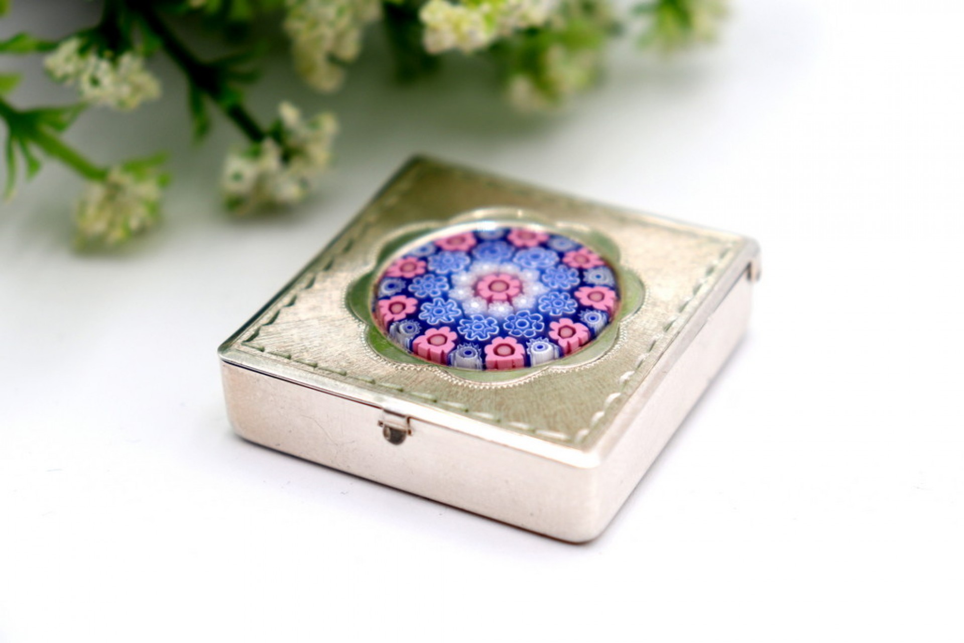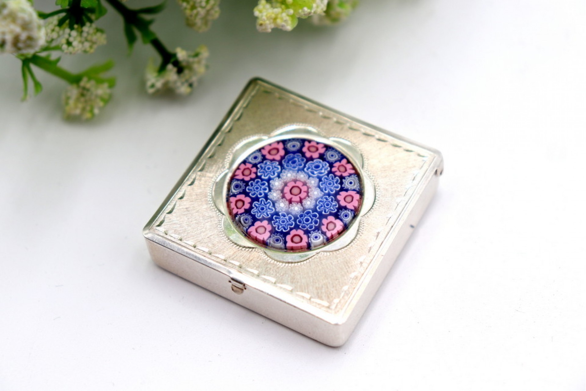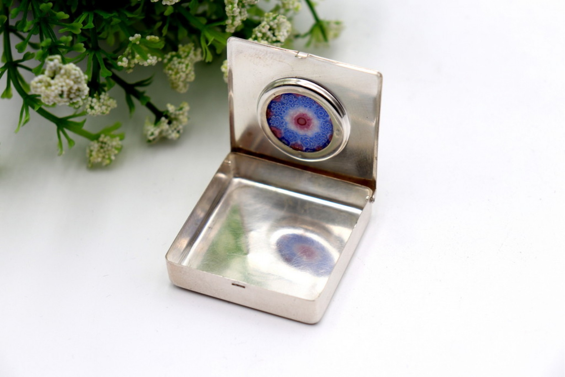 • Descrição: Caixa de comprimidos em prata quadrada com aplicação de vidro de Murano na tampa.