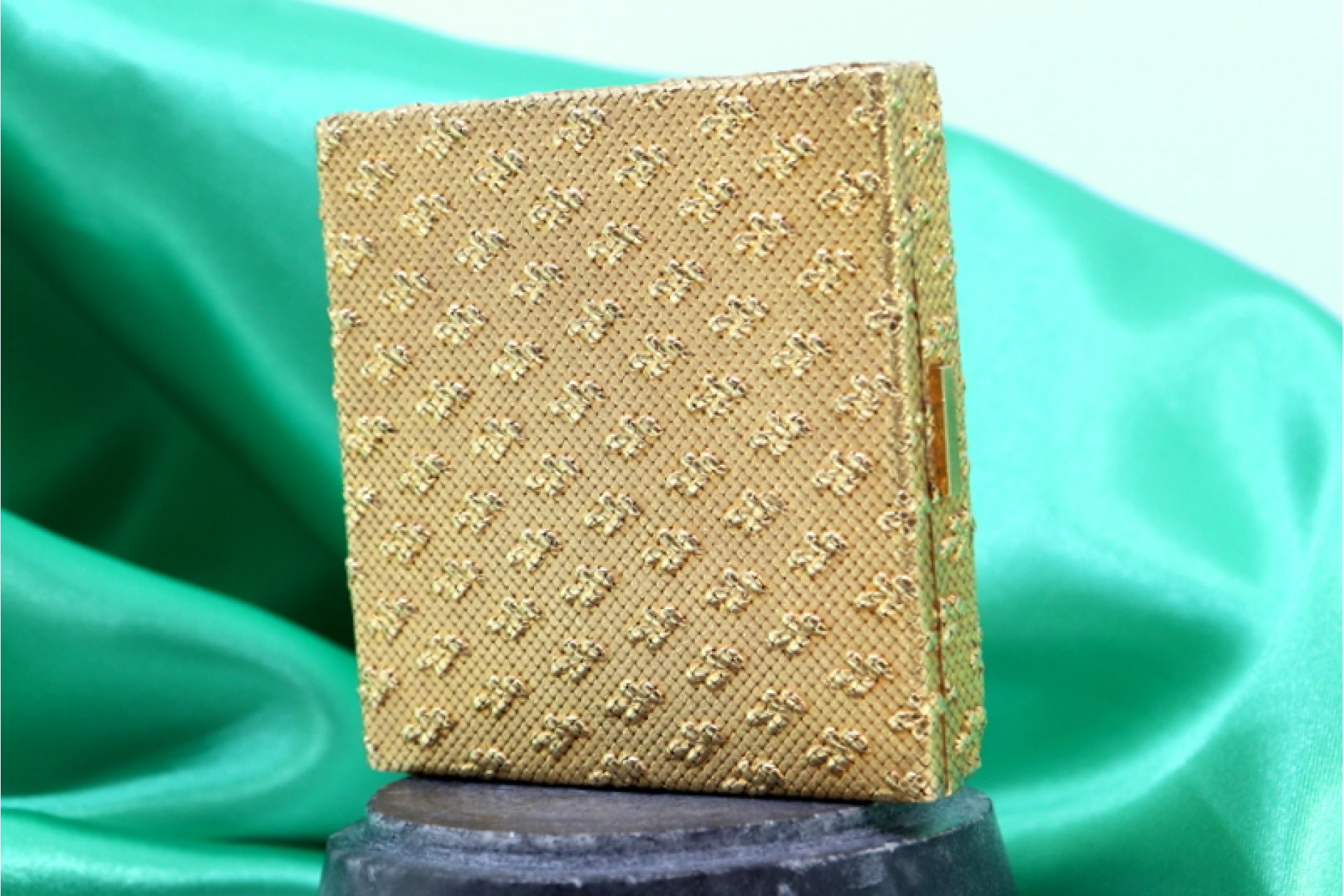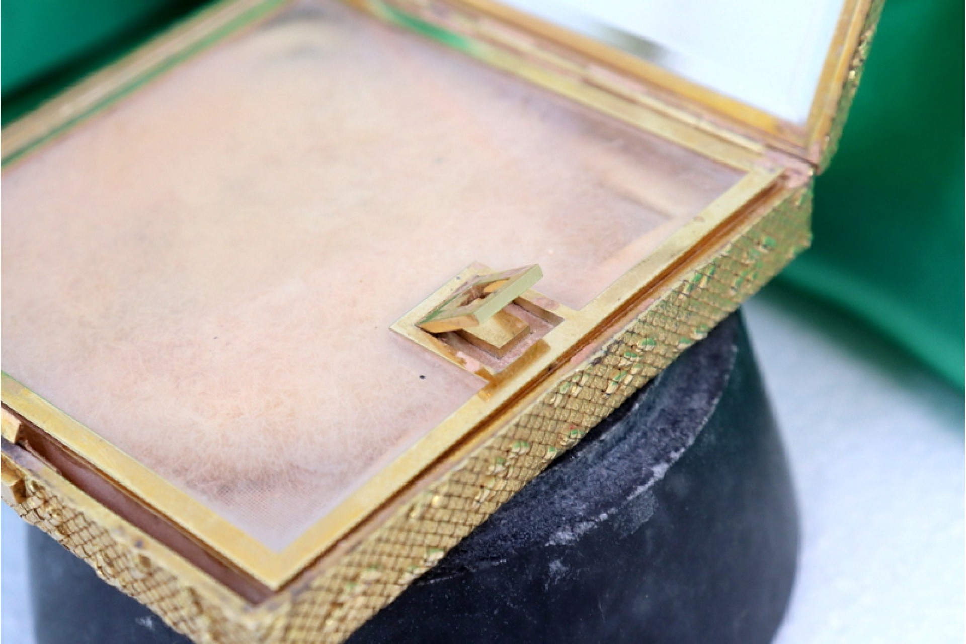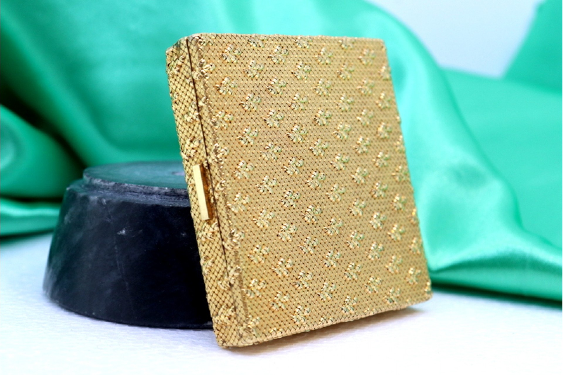 • Descrição: Caixa de toilette em ouro com flores relavadas, espelho no interior, deposito para pó de arroz e tampa basculante,