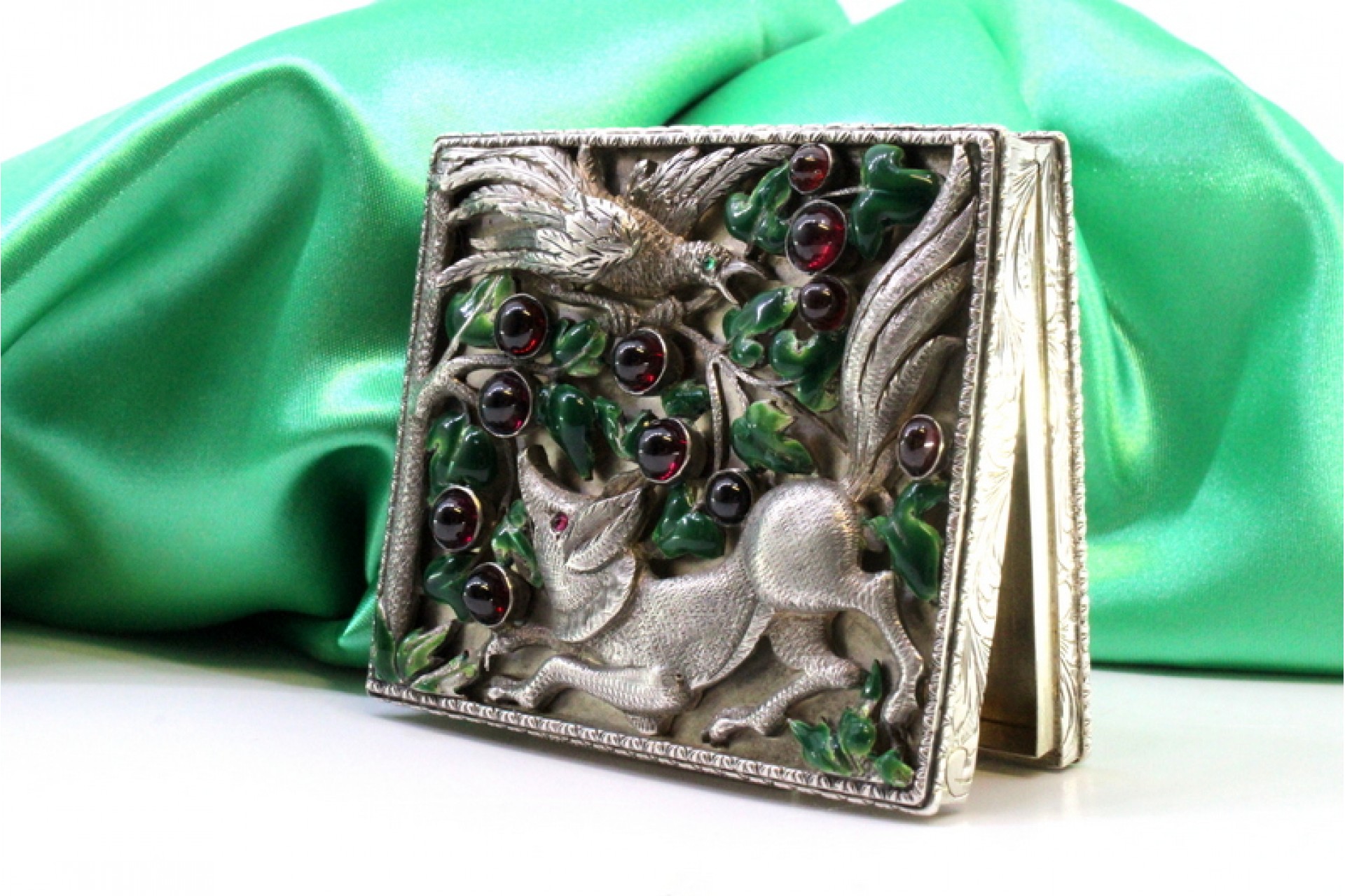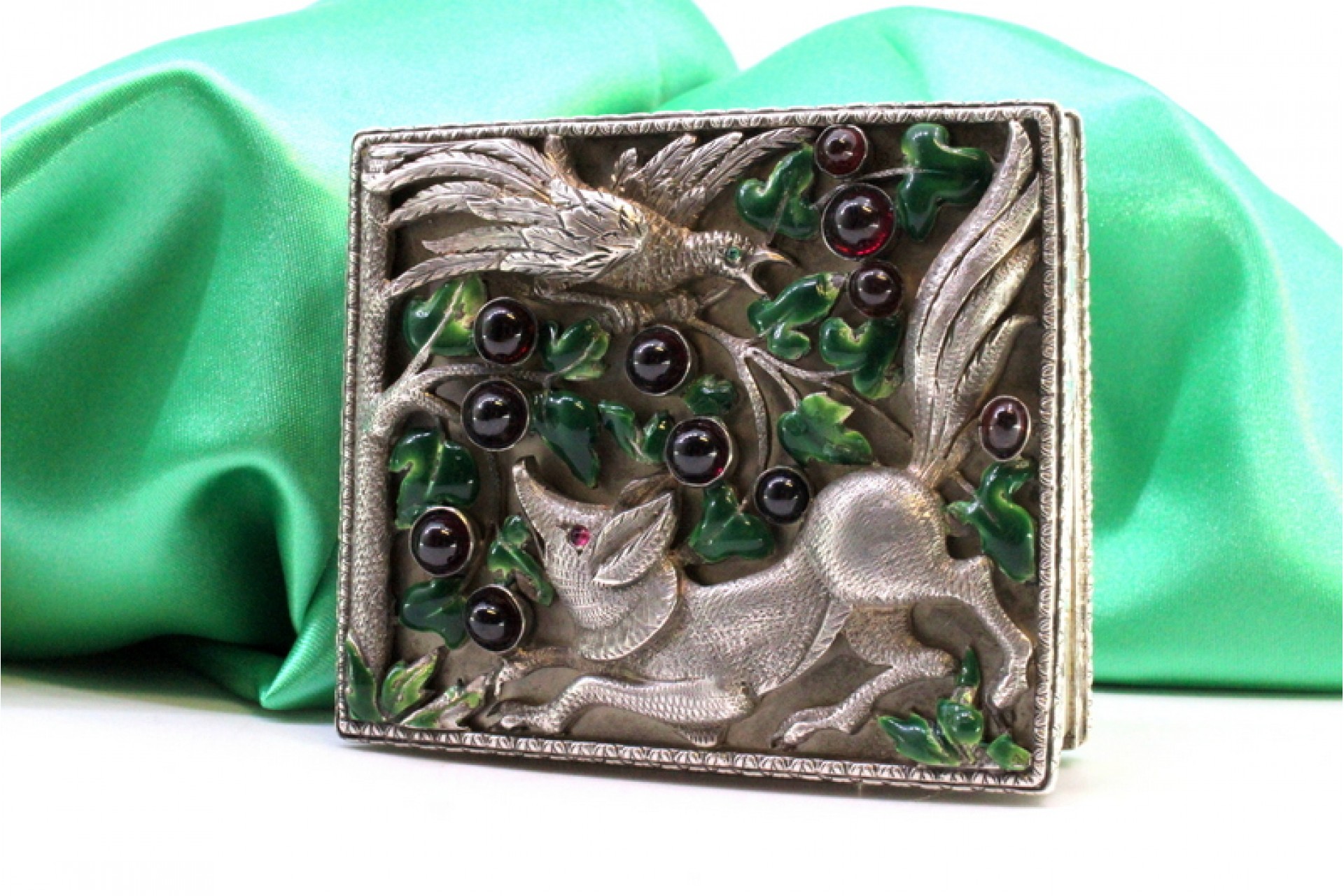 • Descrição: Caixa de Toilette em prata com alto relevo de raposa e ave, com pedras não preciosas em tampa basculante esmaltada.