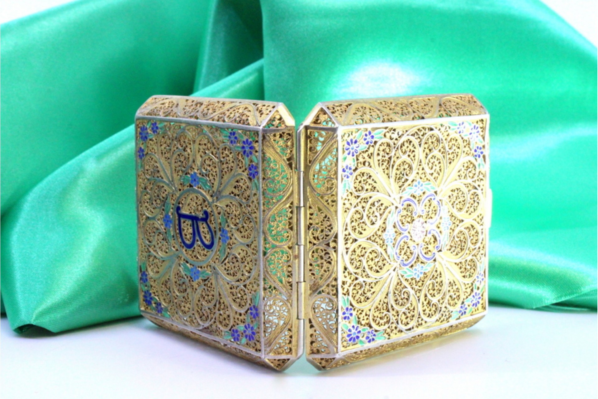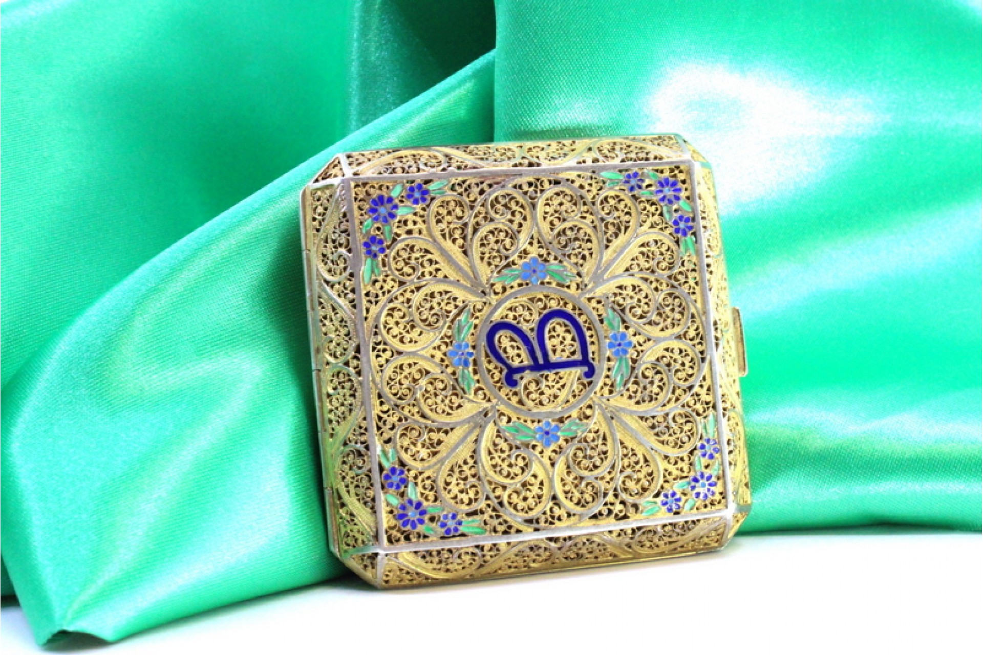 • Descrição: Caixa de Toilette em prata filigrana dourada com apontamentos florais coloridos e tampa basculante com espelho no interior.