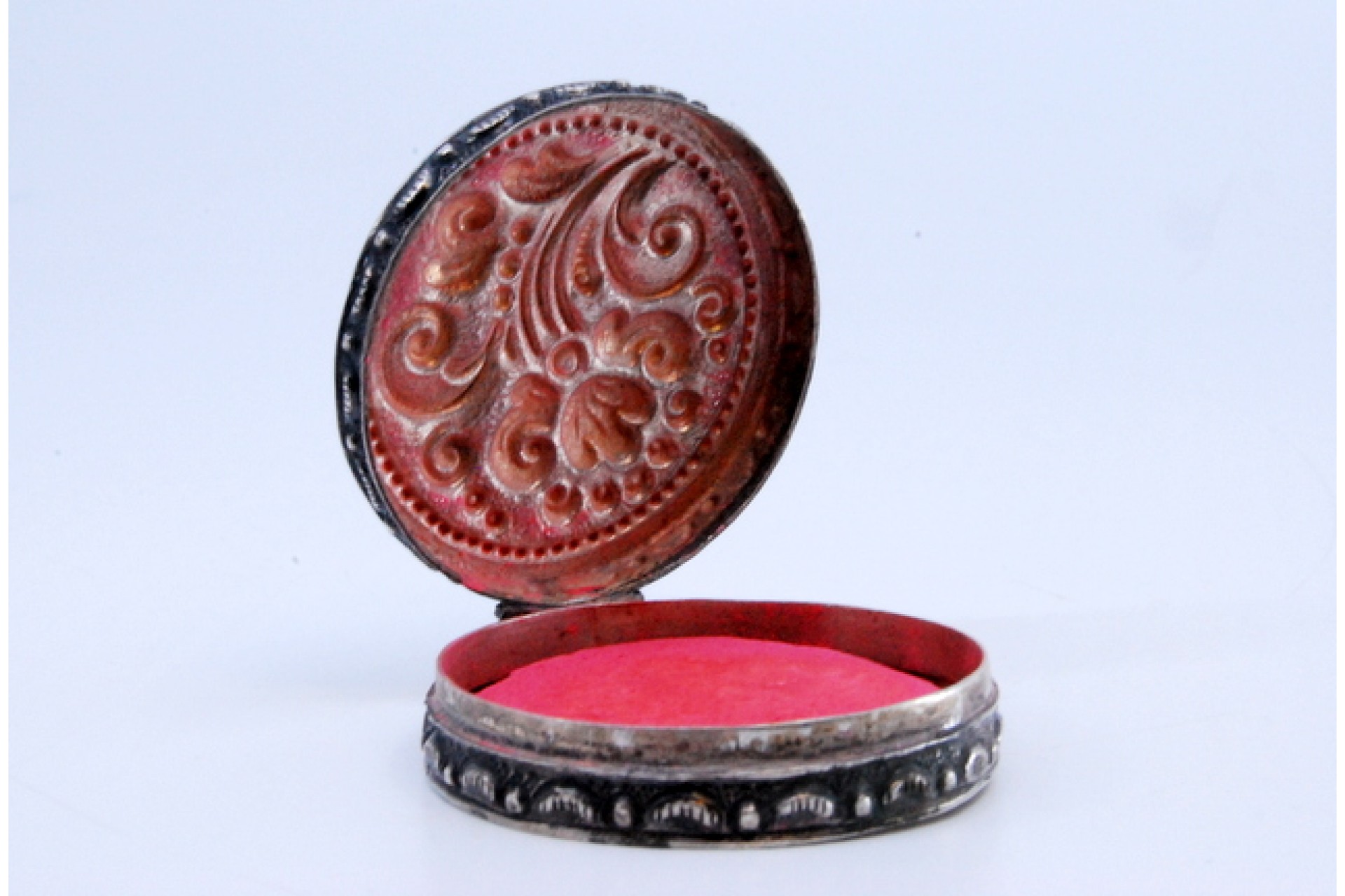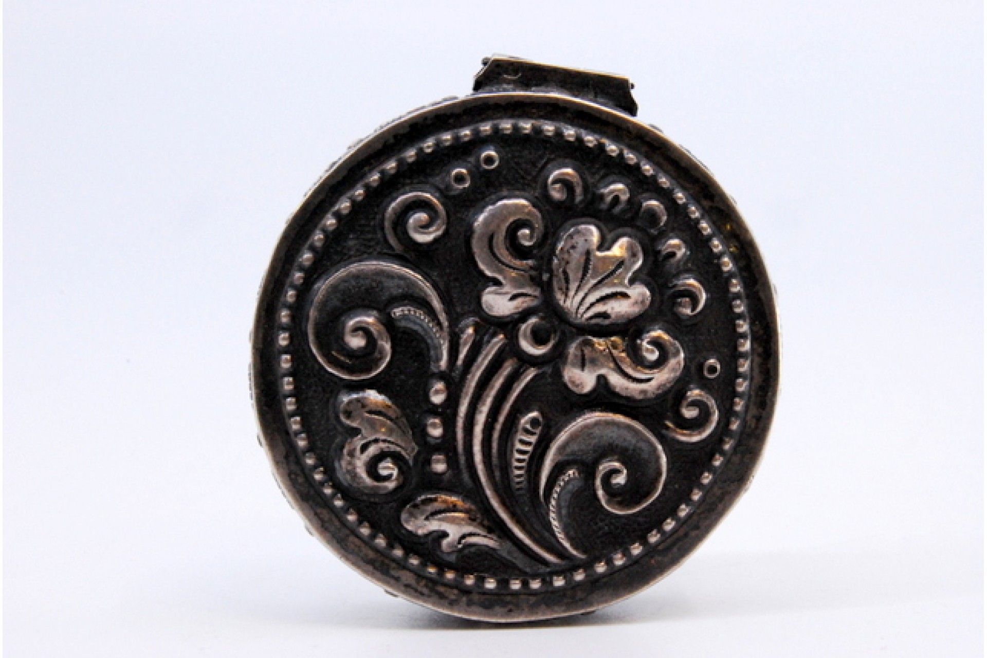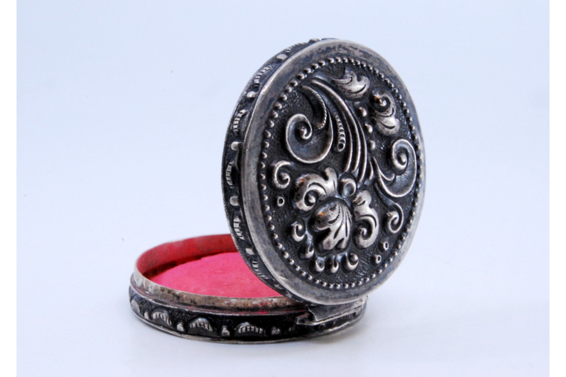 • Descrição: Caixa de toilette em prata para "rouge" relevada com motivos na tampa basculante.