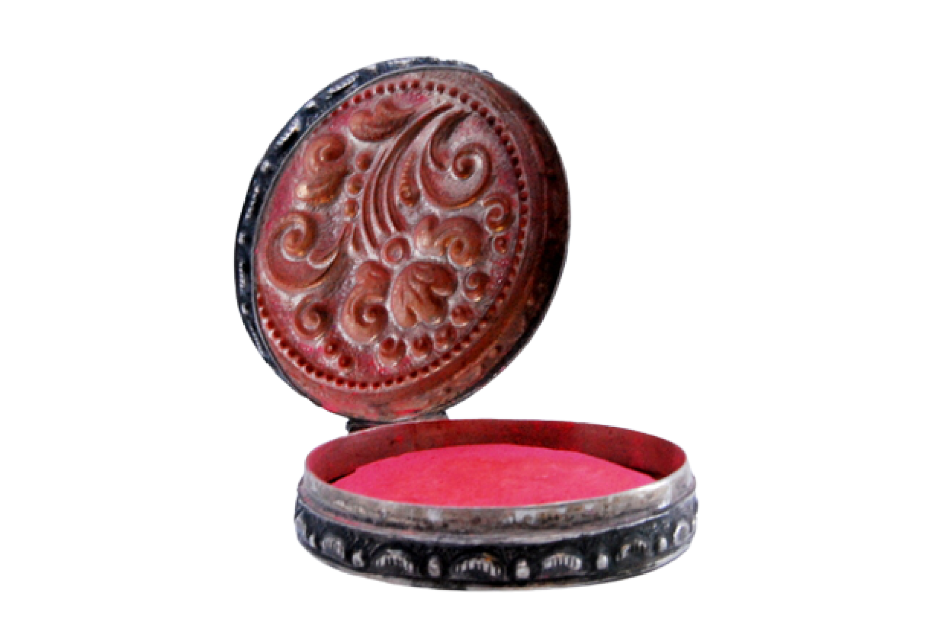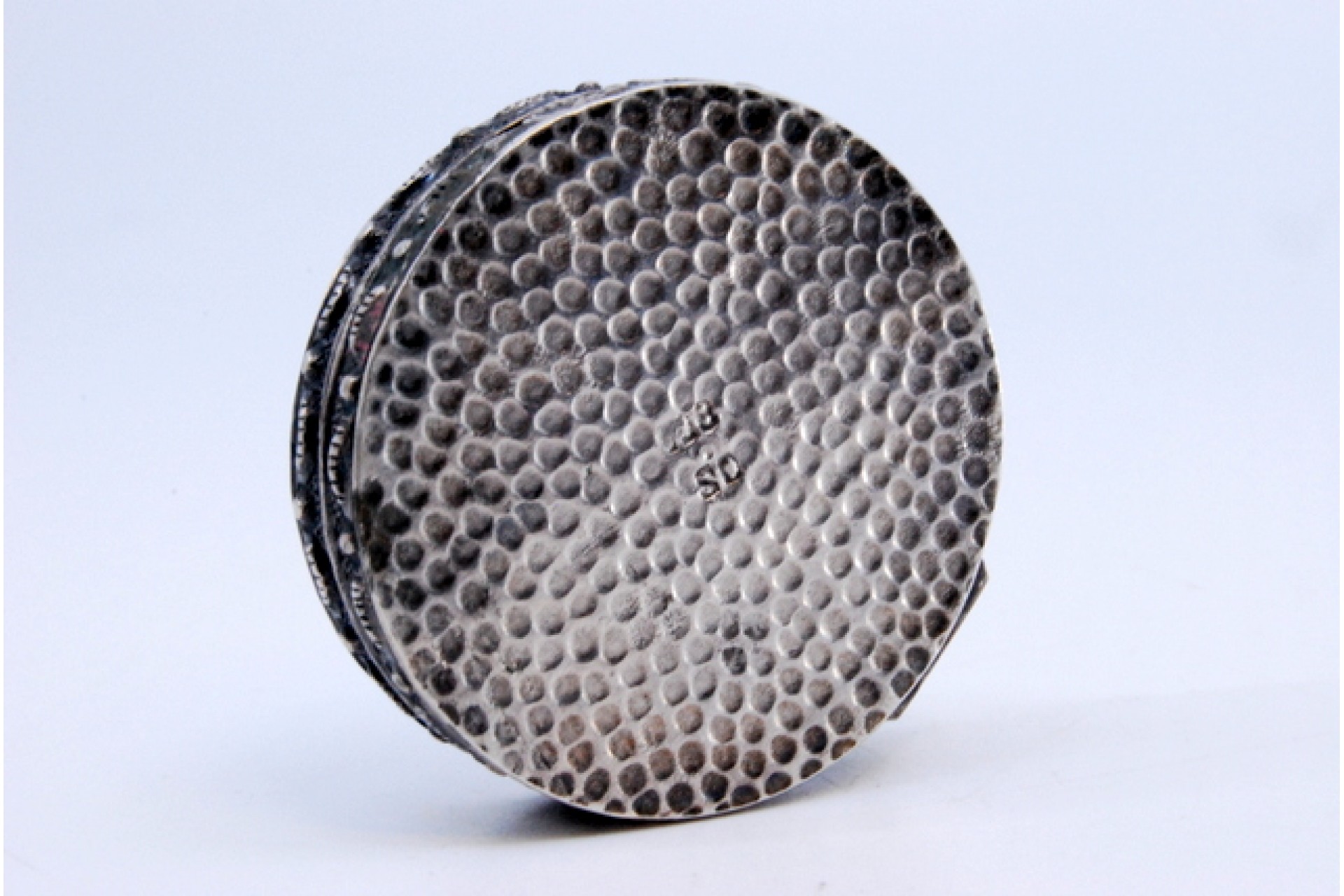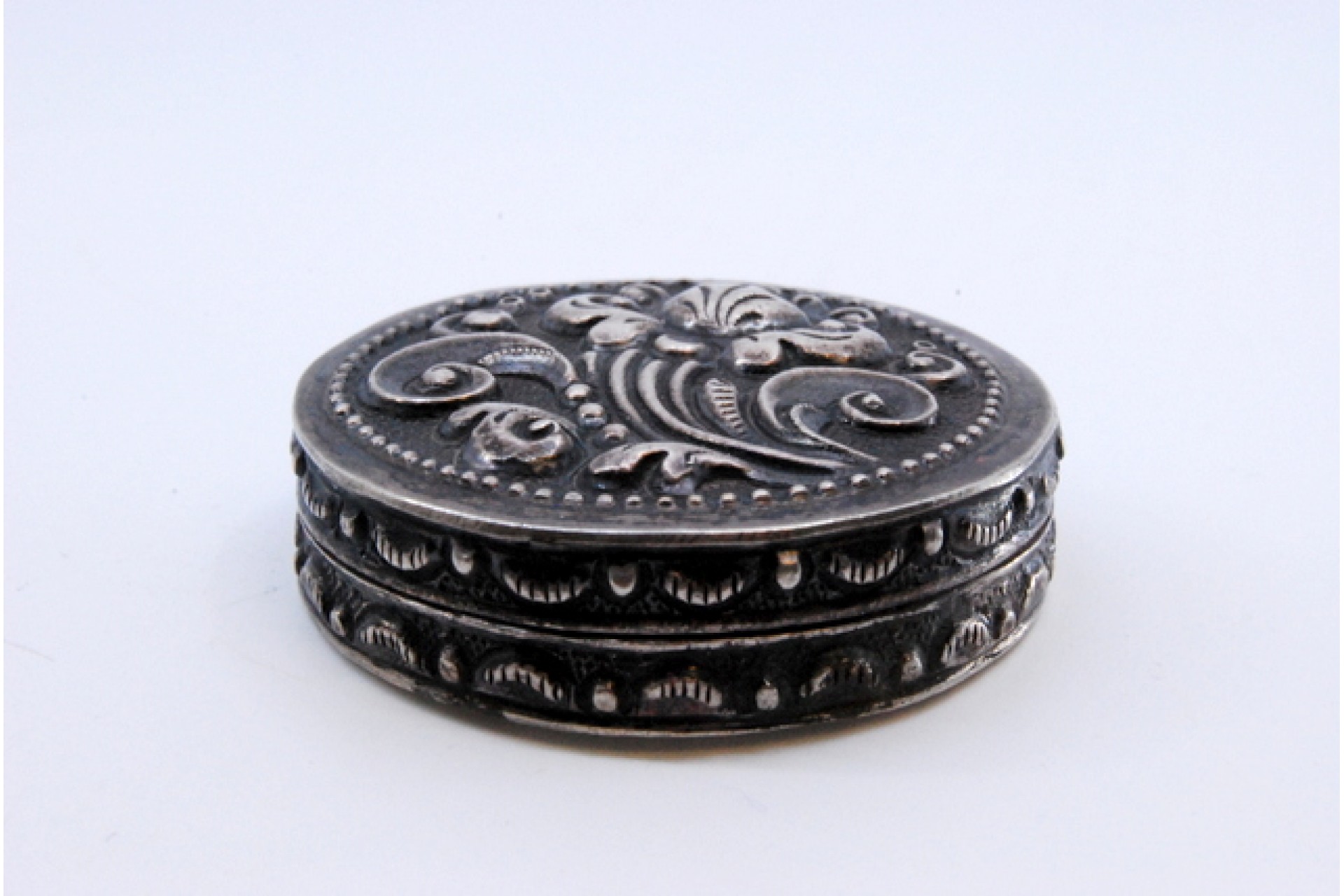• Descrição: Caixa de toilette em prata para "rouge" relevada com motivos na tampa basculante.