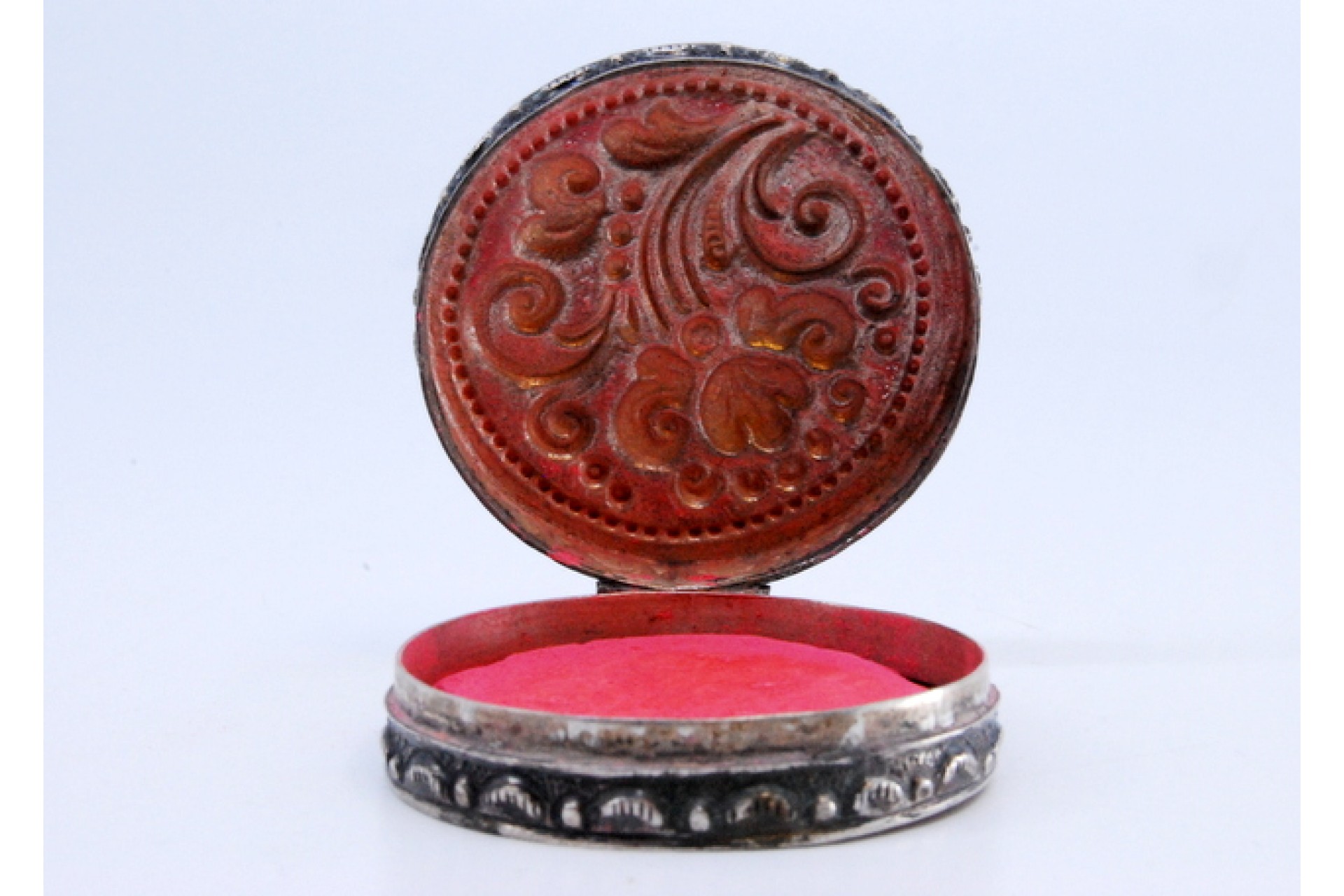 Caixa de toilette em prata para "rouge" relevada com motivos na tampa basculante.