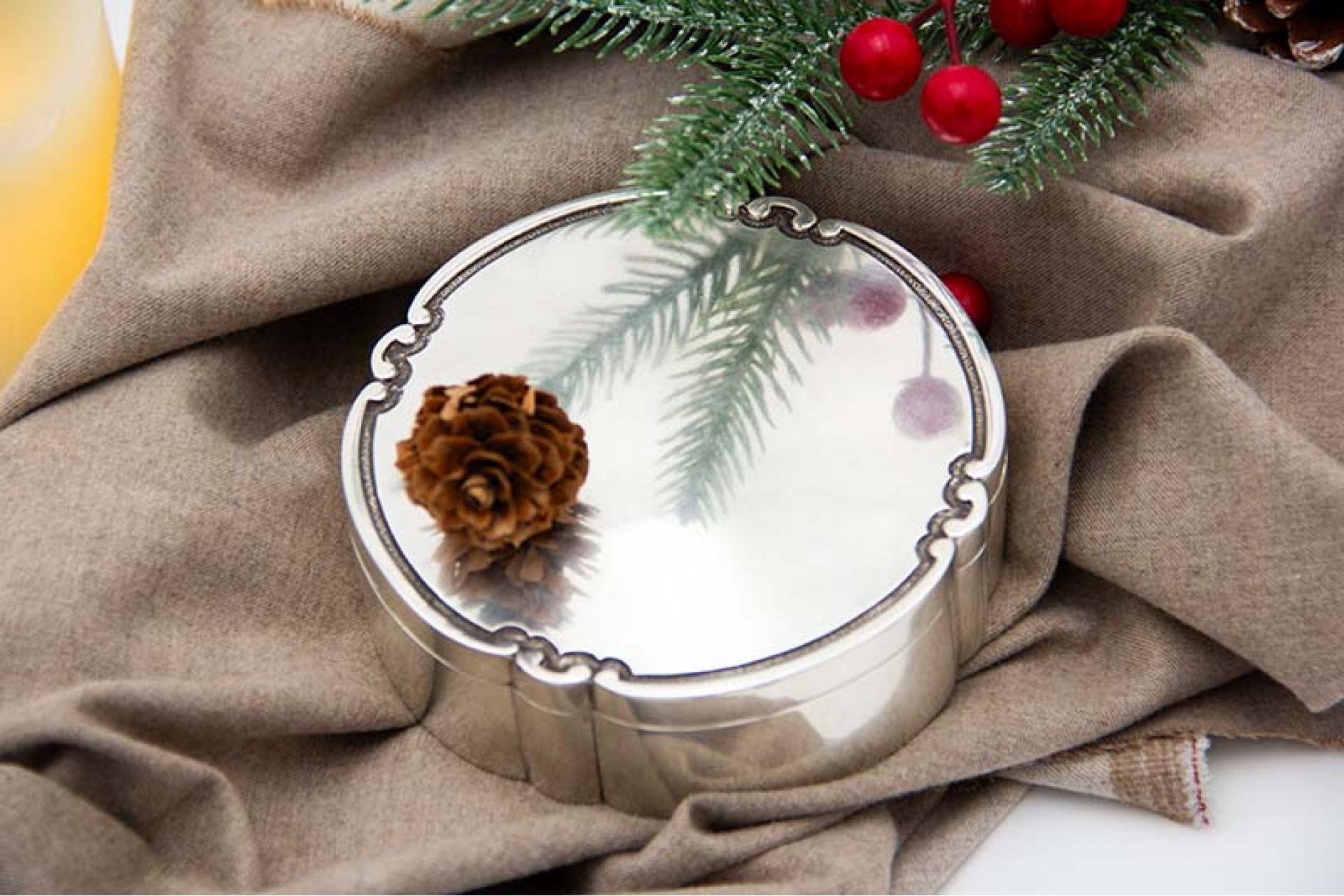 • Descrição: Caixa de prata lisa em formato circular com friso na tampa amovível.