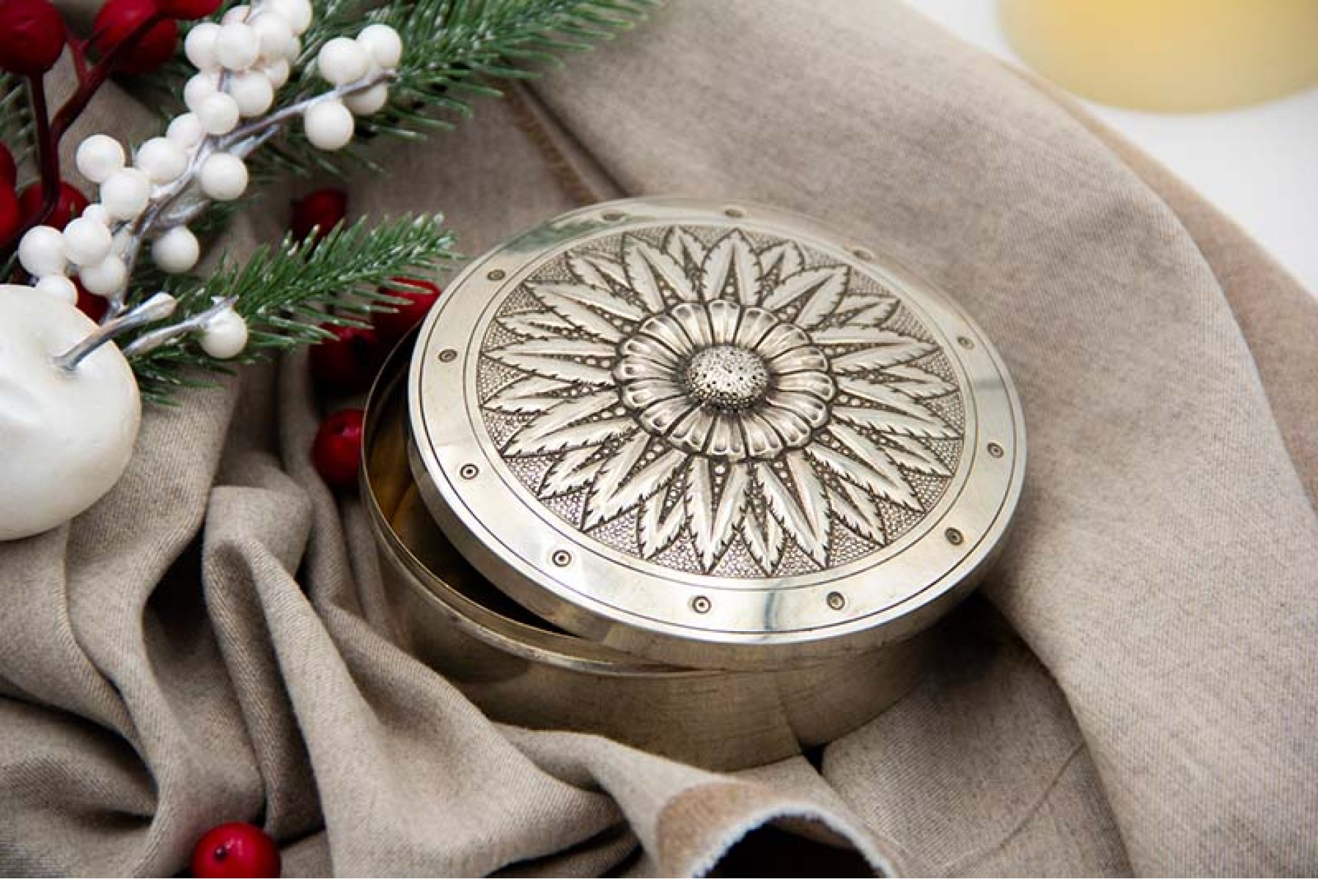 • Descrição: Caixa de prata de formato cicular com flor de girassol relevada envolvida por friso.