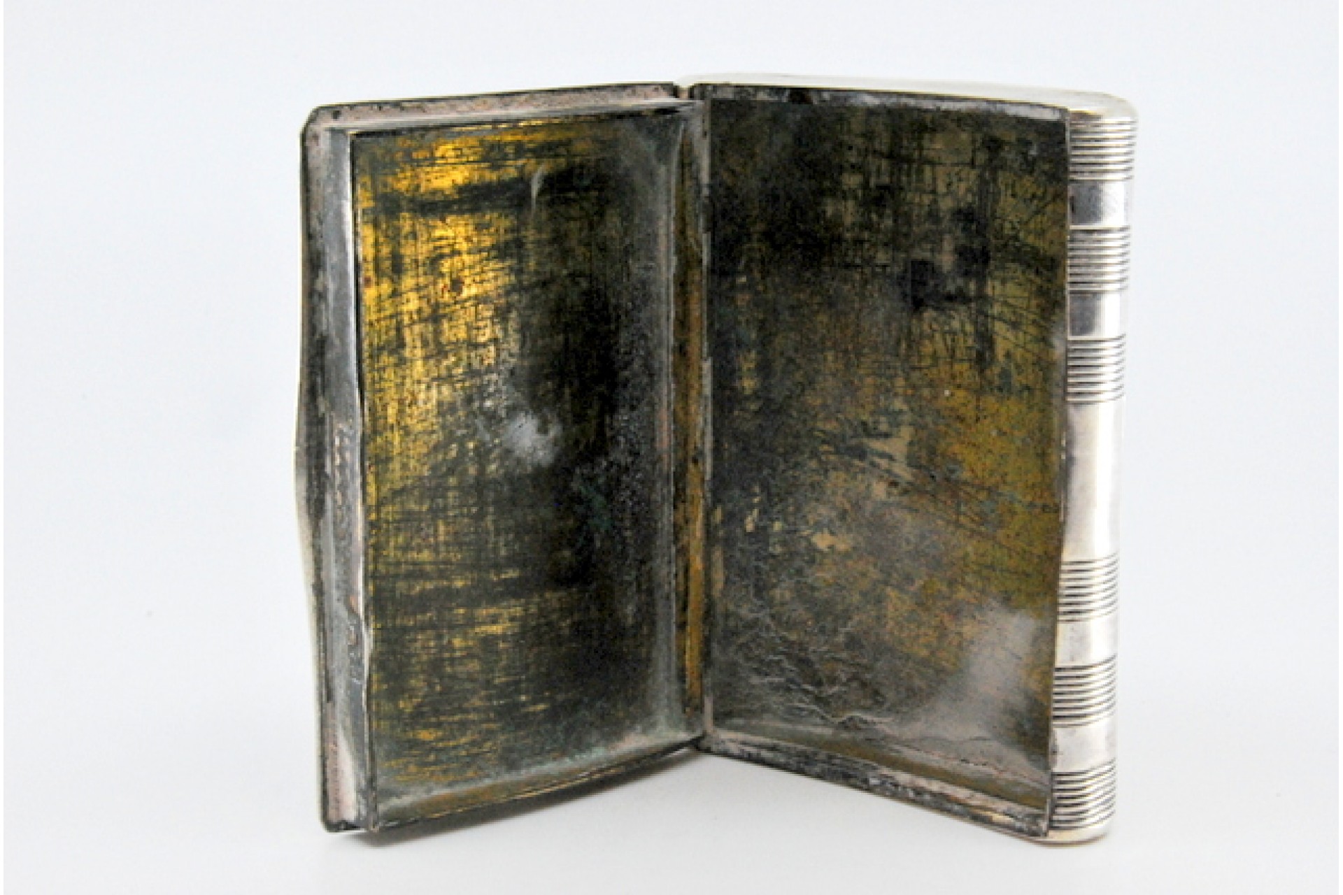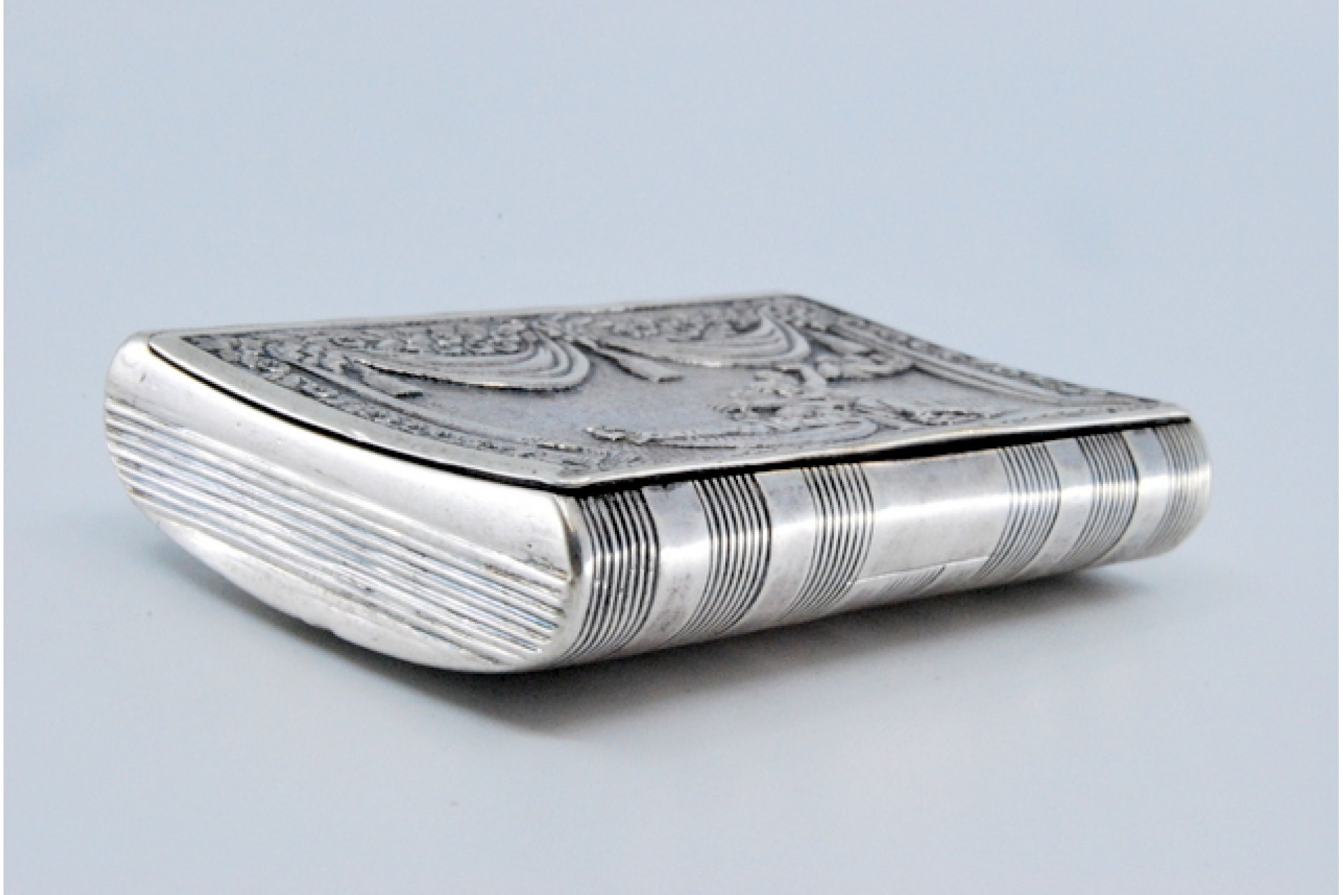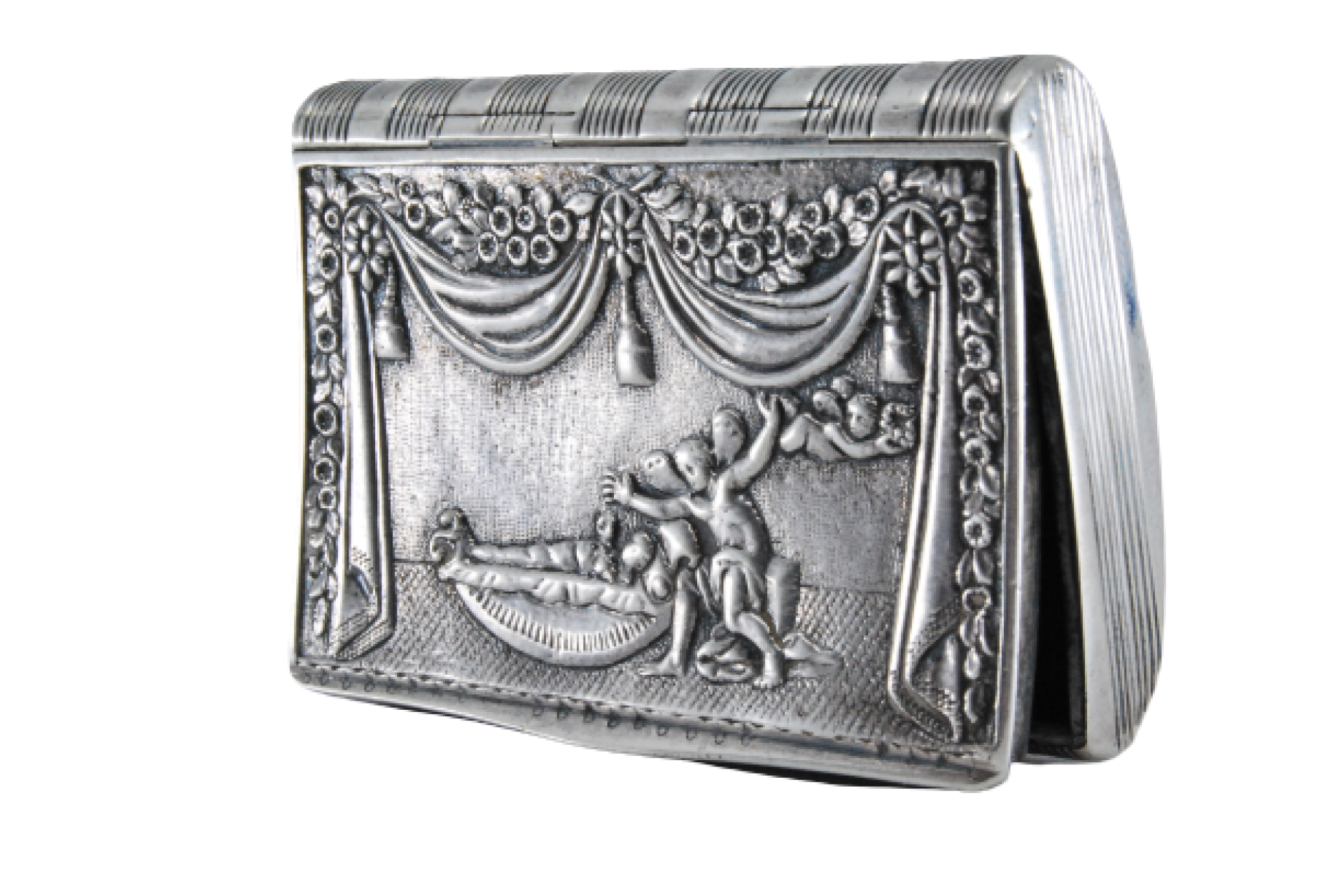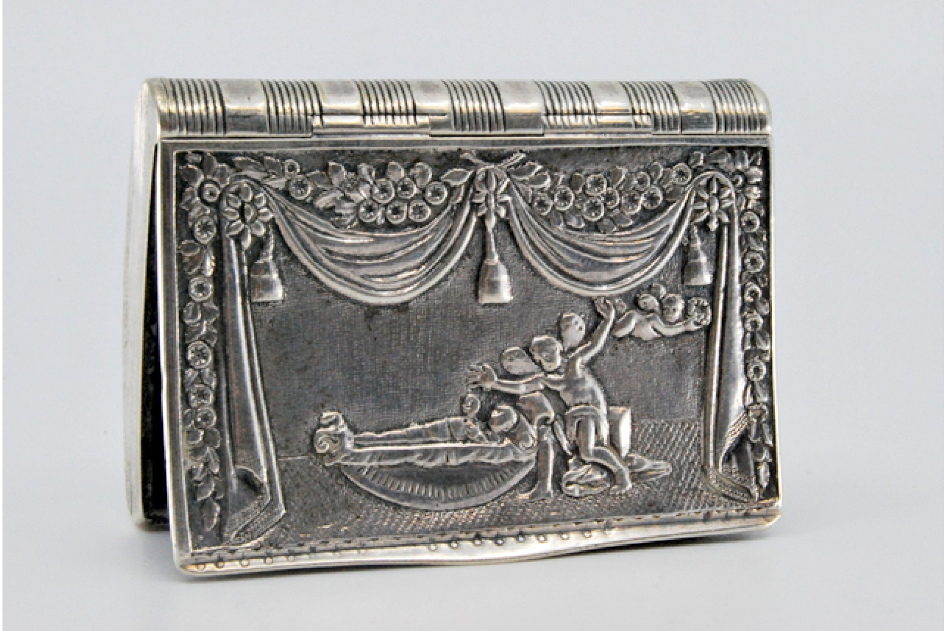 • Descrição: Caixa de rapé em prata com cena de teatro relevada e tampa basculante.