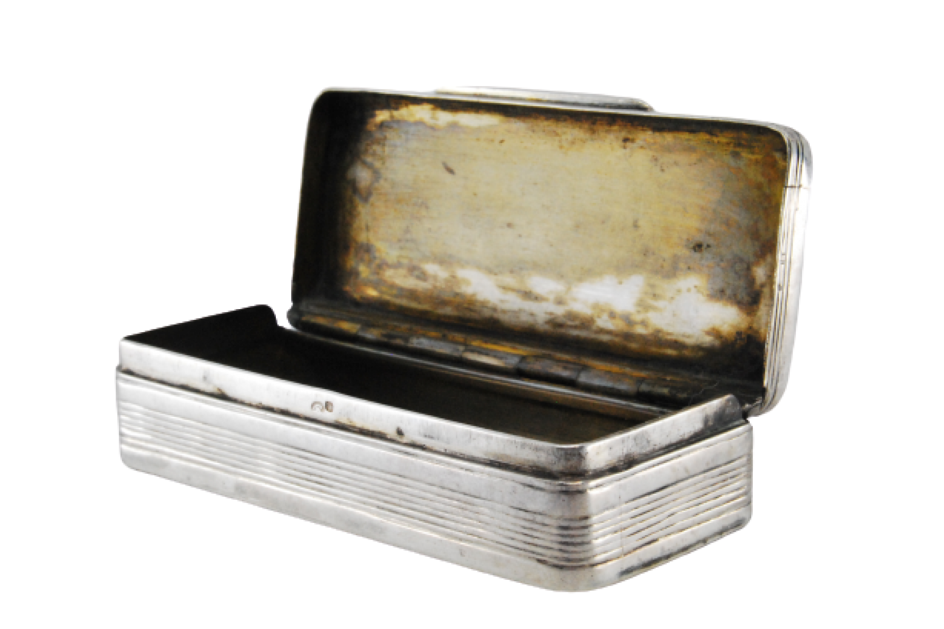 • Descrição: Caixa de rapé em prata com frisos na envolvência e gravados na tampa basculante com interior dourado.