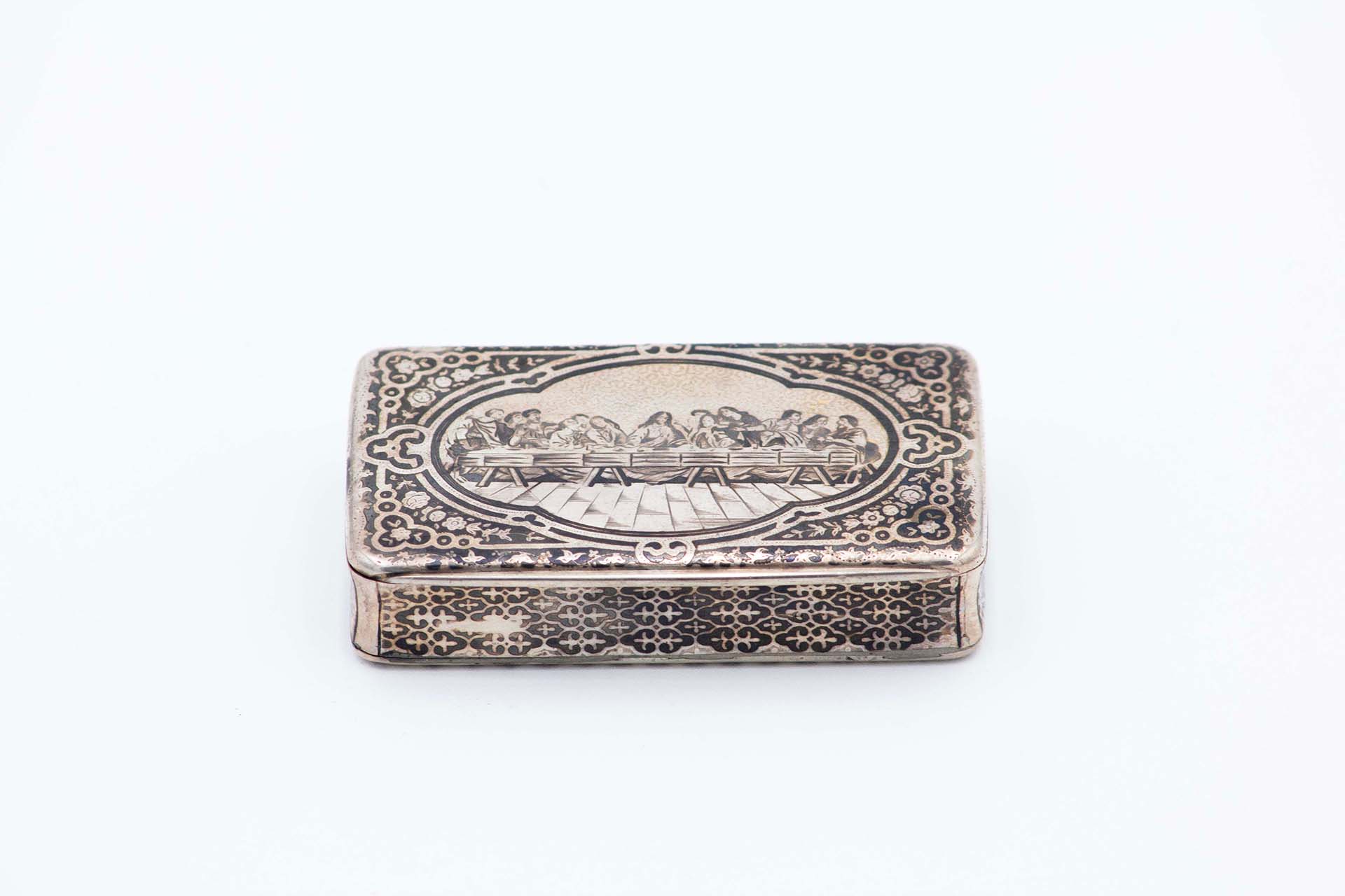 • Descrição: Caixa de rapé em prata nielada de forma retangular com gravação alusiva à última ceia e interior dourado.