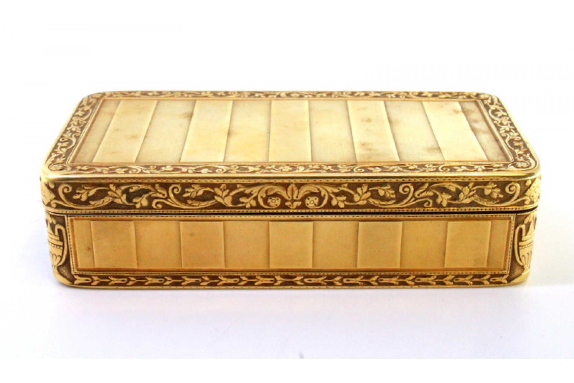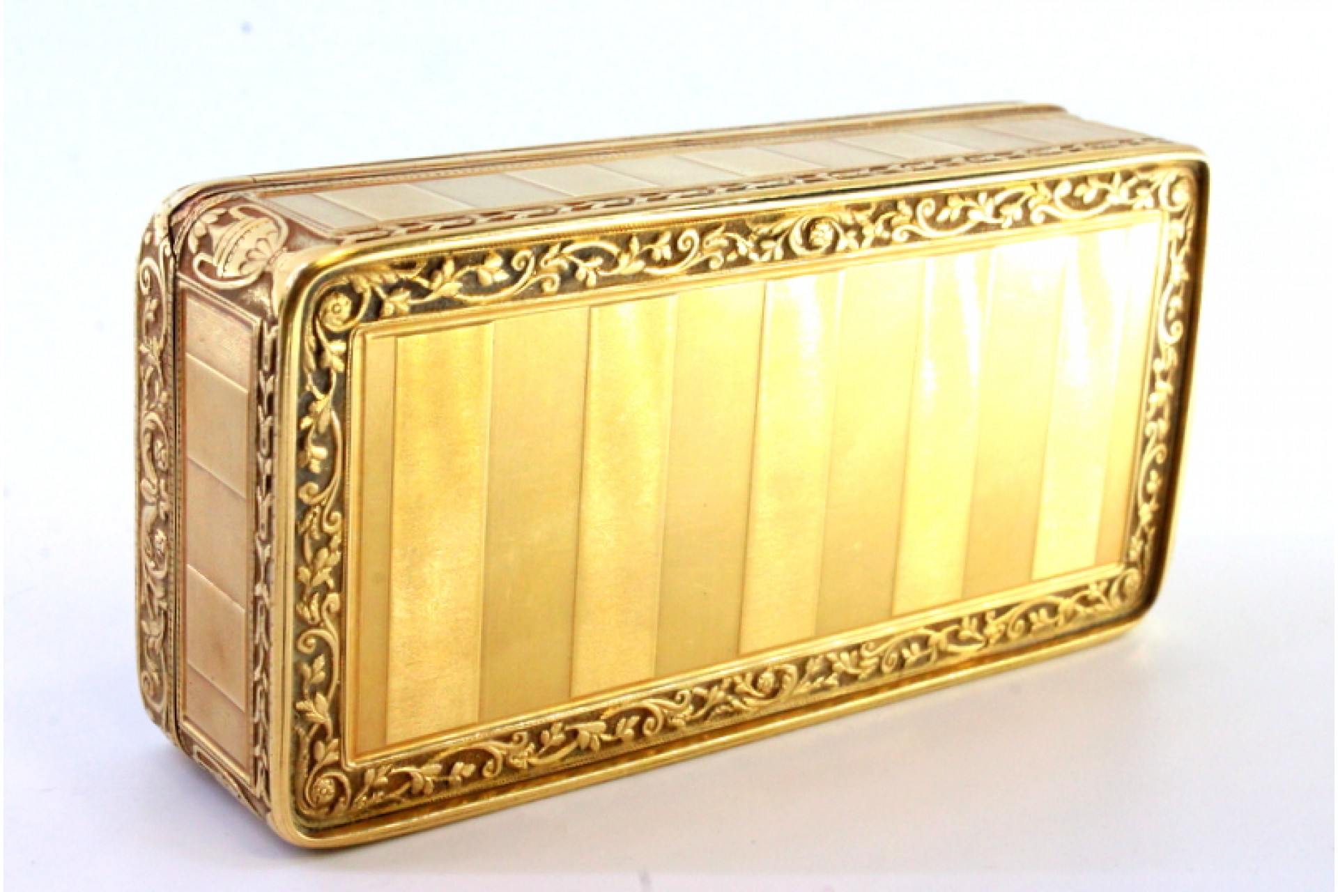 • Descrição: Caixa de rapé em ouro com bandas relevadas ao alto, envolvidas por friso com motivos florais profusamente relevados e tampa basculante.