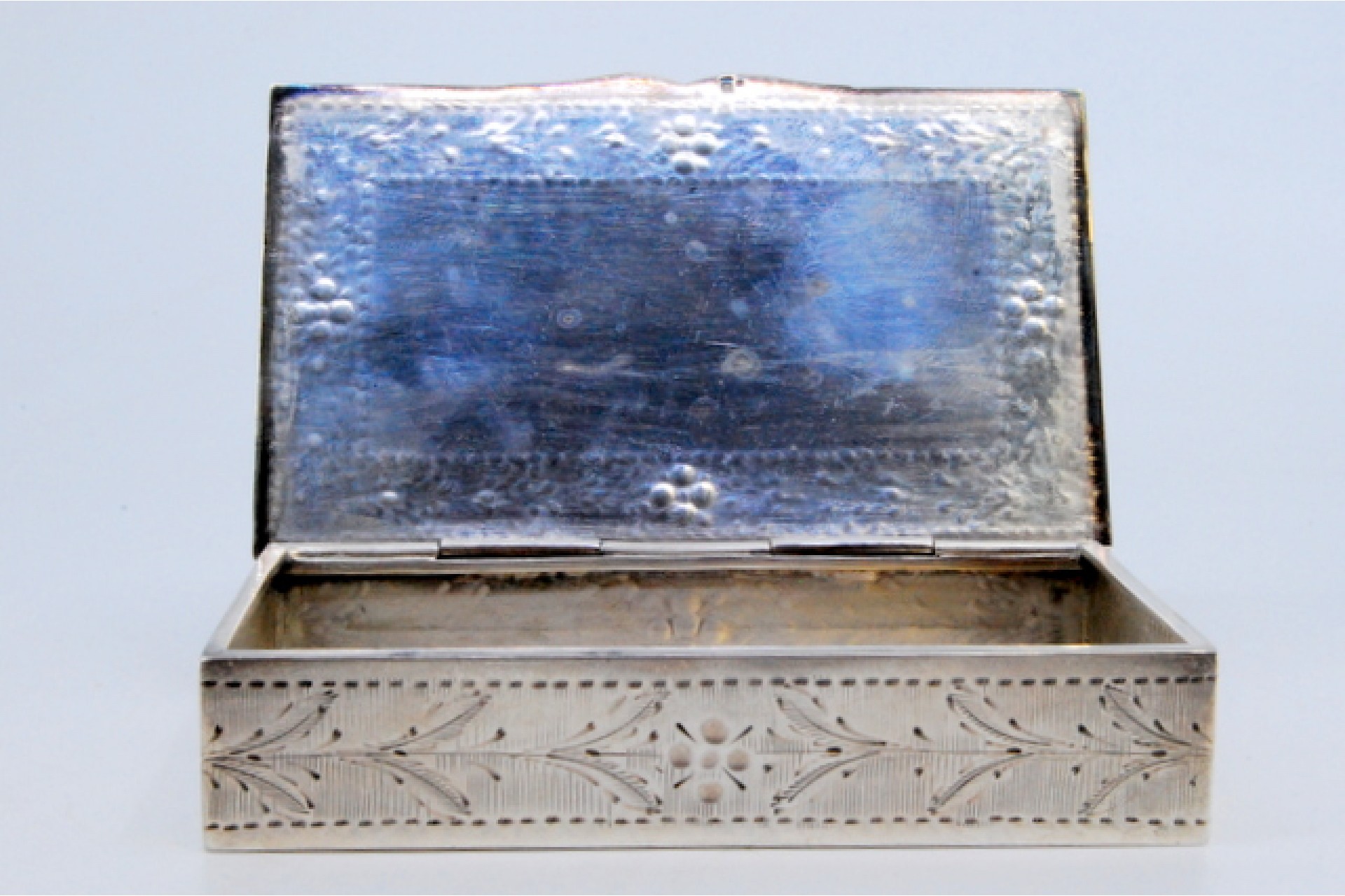 • Descrição: Guarda jóias em prata com motivos vegetalistas gravados e pedras coloridas na tampa basculante.