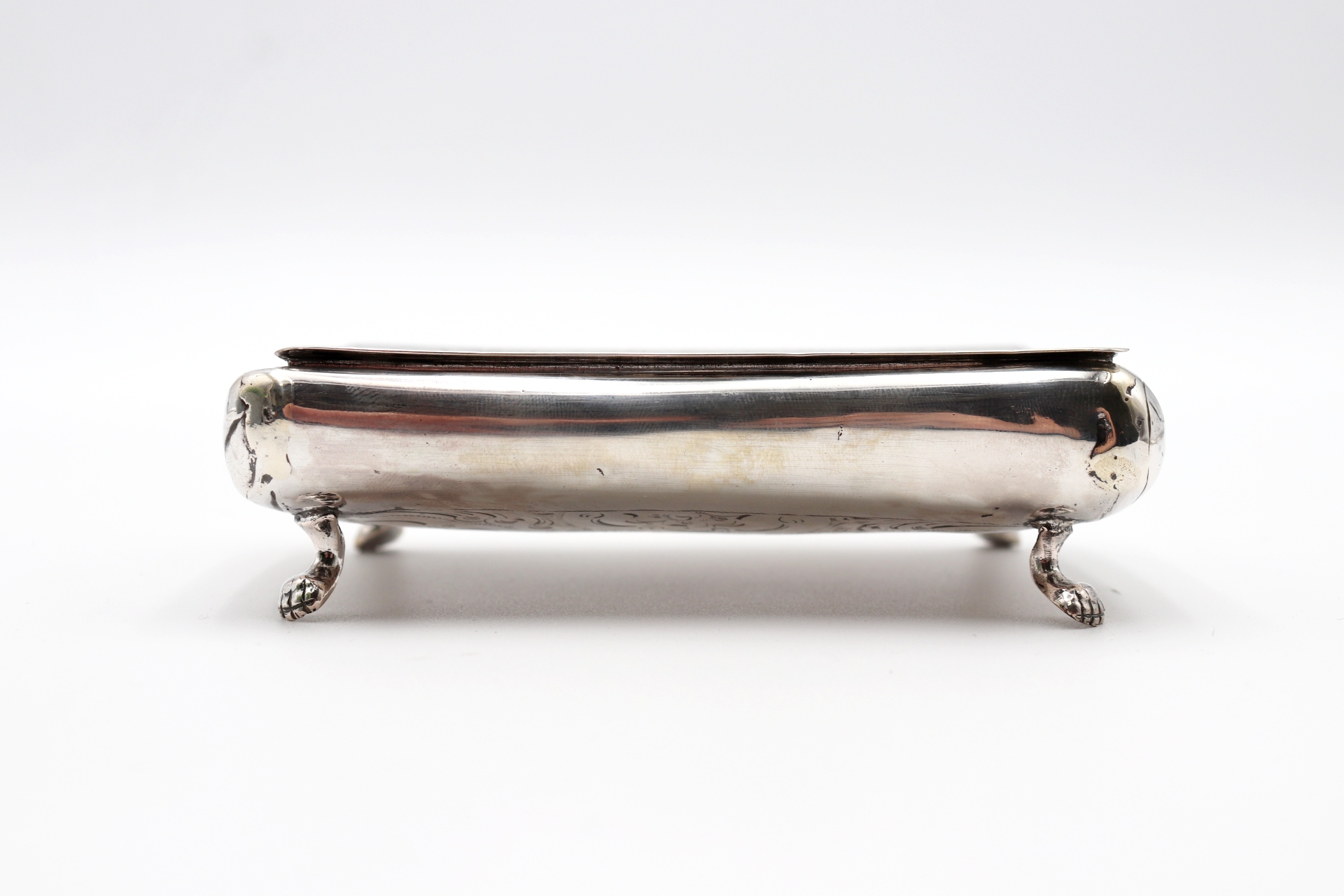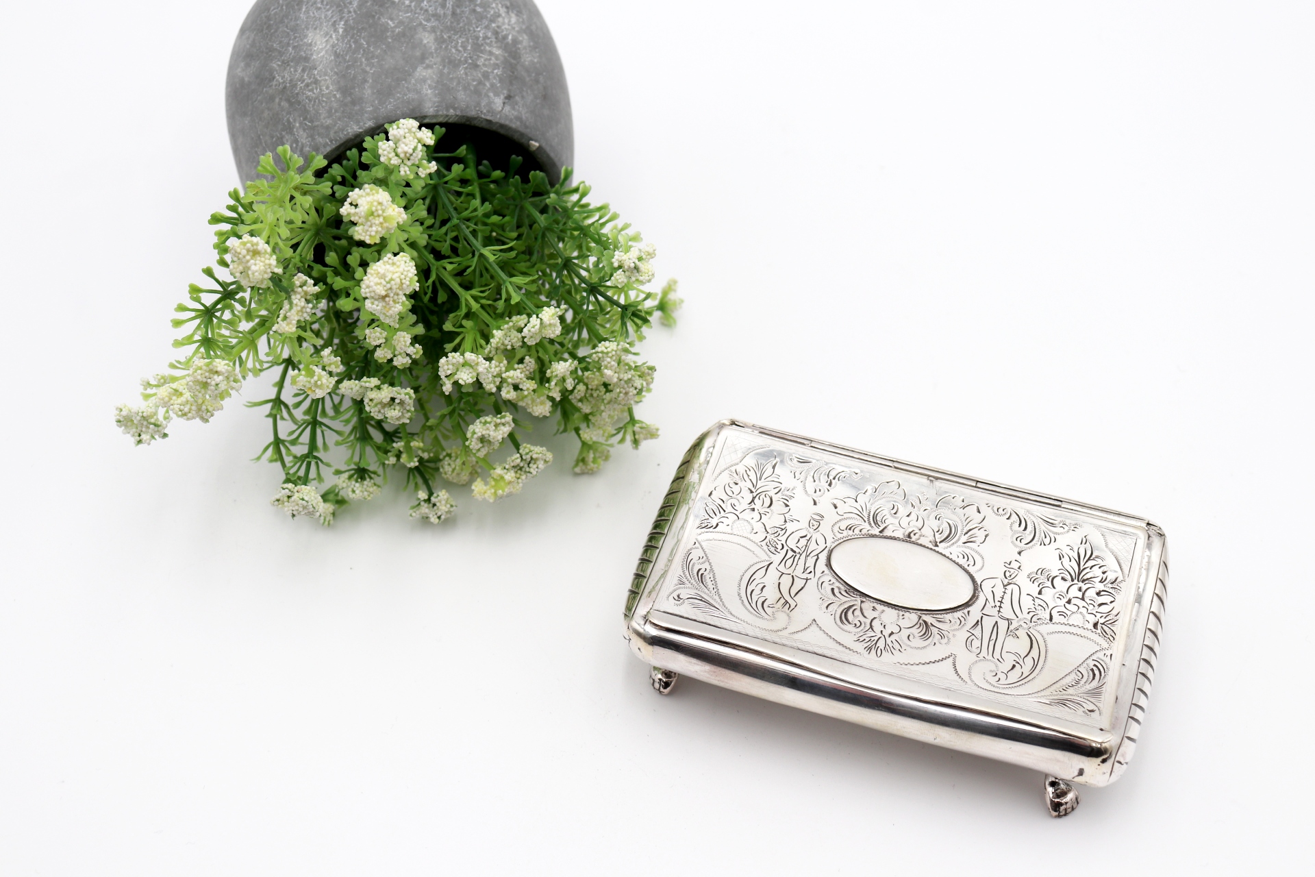 • Descrição: Tabaqueira de mesa em prata com gravados geométricos, cartela para monograma e cenas do quotidiano na tampa.