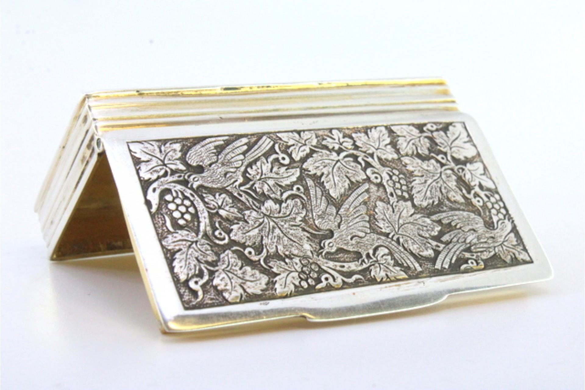 • Descrição: Caixa de rapé em prata com motivos florais e aves relevadas na tampa, interior dourado e frisos na envolvência.