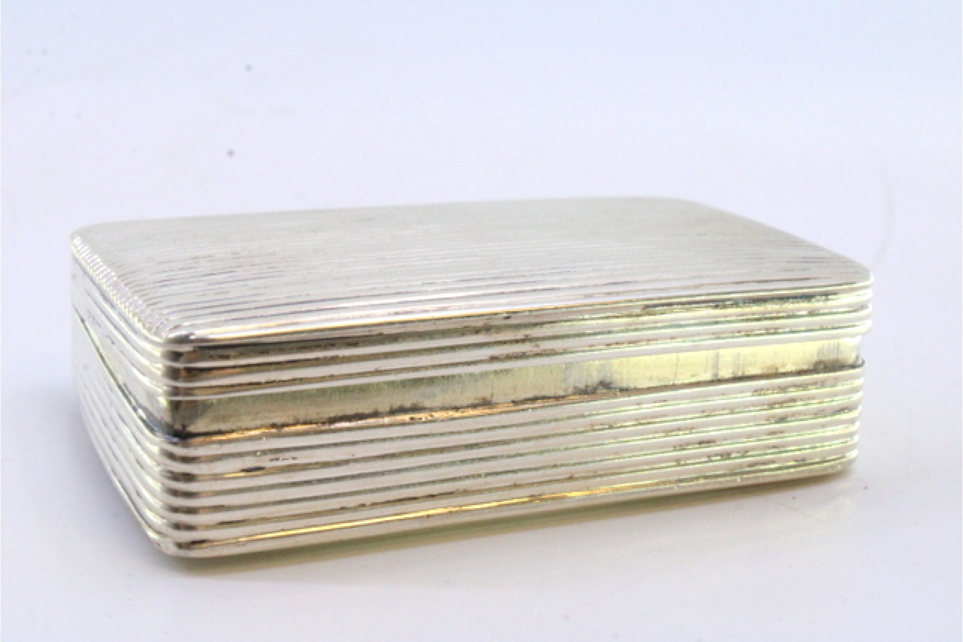Caixa de rapé em prata canelada com tampa relevada envolvendo cartela para monograma.