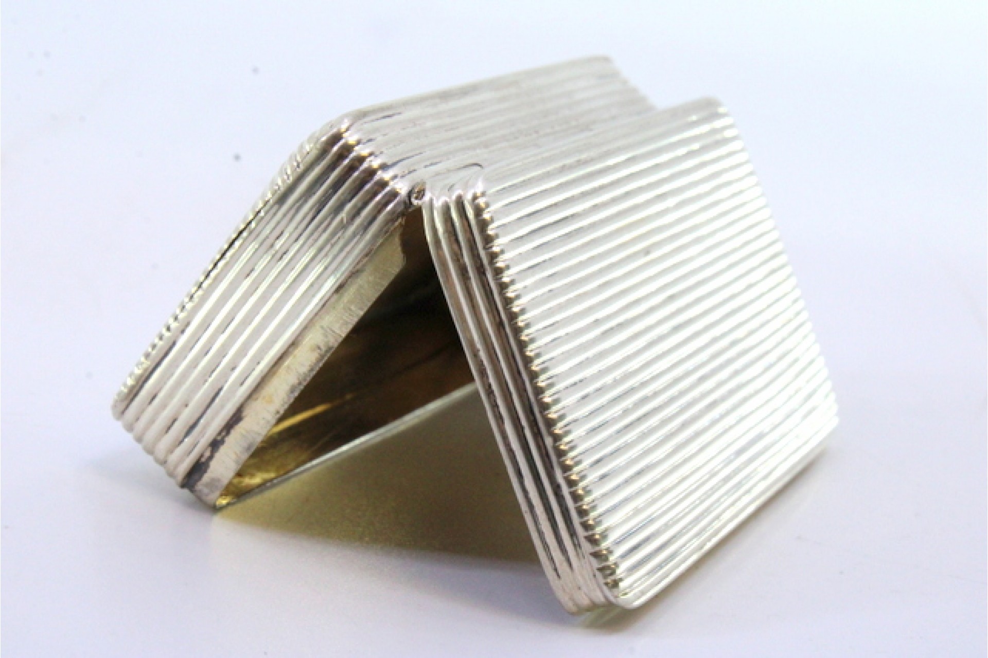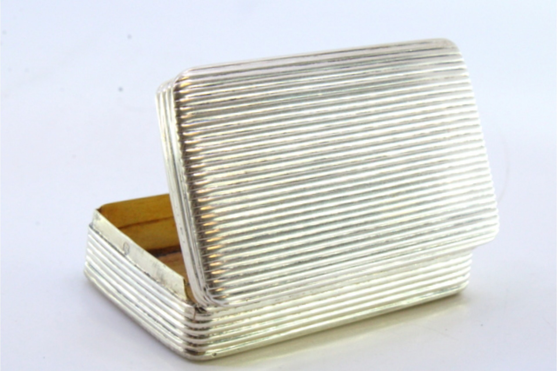 • Descrição: Caixa de rapé em prata canelada com tampa relevada envolvendo cartela para monograma.