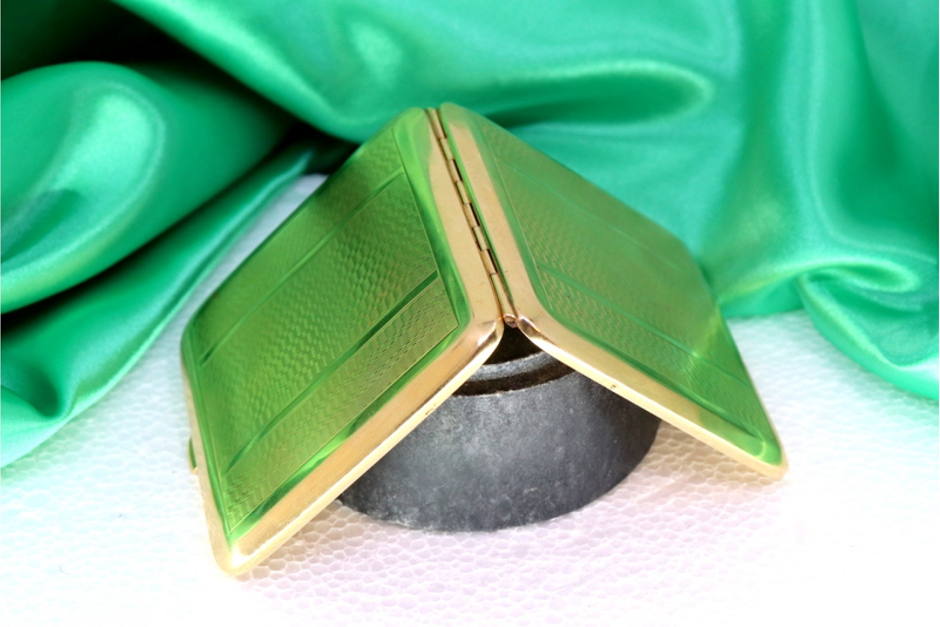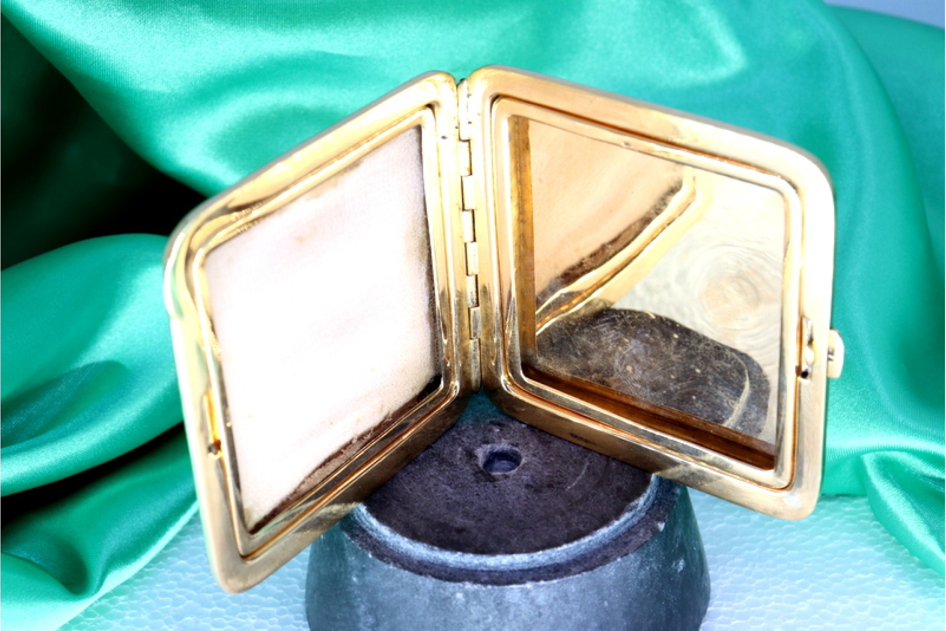 • Descrição: Caixa de toilette em ouro guilhochado com três bandas ao alto, interior com depósito para pó de arroz e espelho.