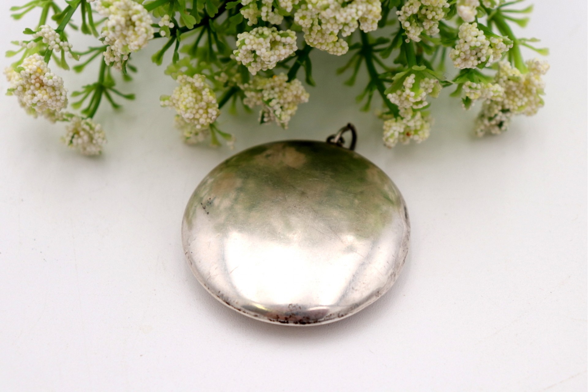 • Descrição: Caixa de toilette em prata com espelho e pompom de pó de arroz com esmalte azul na tampa.