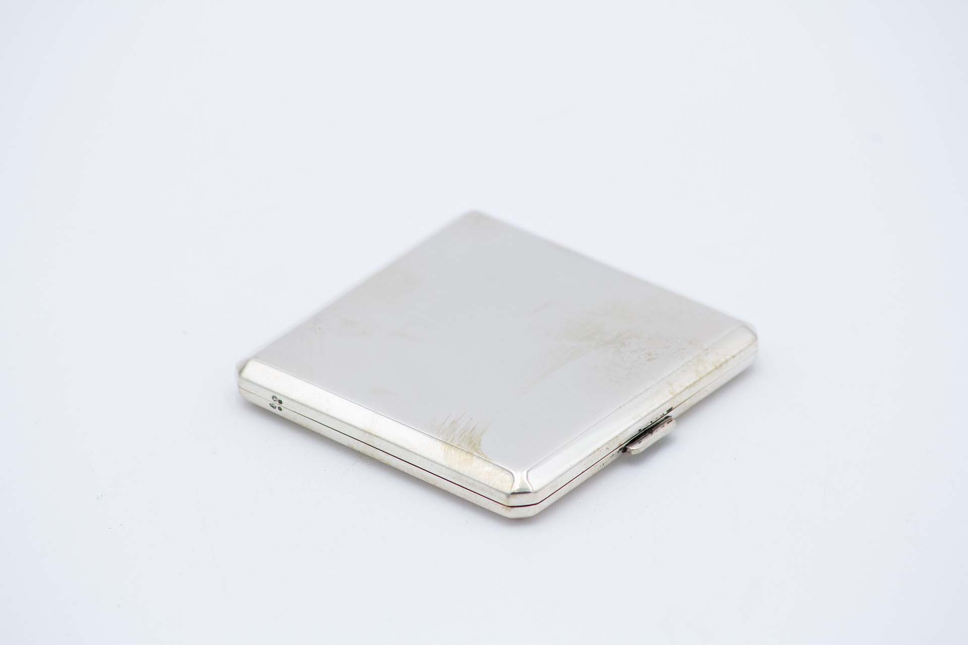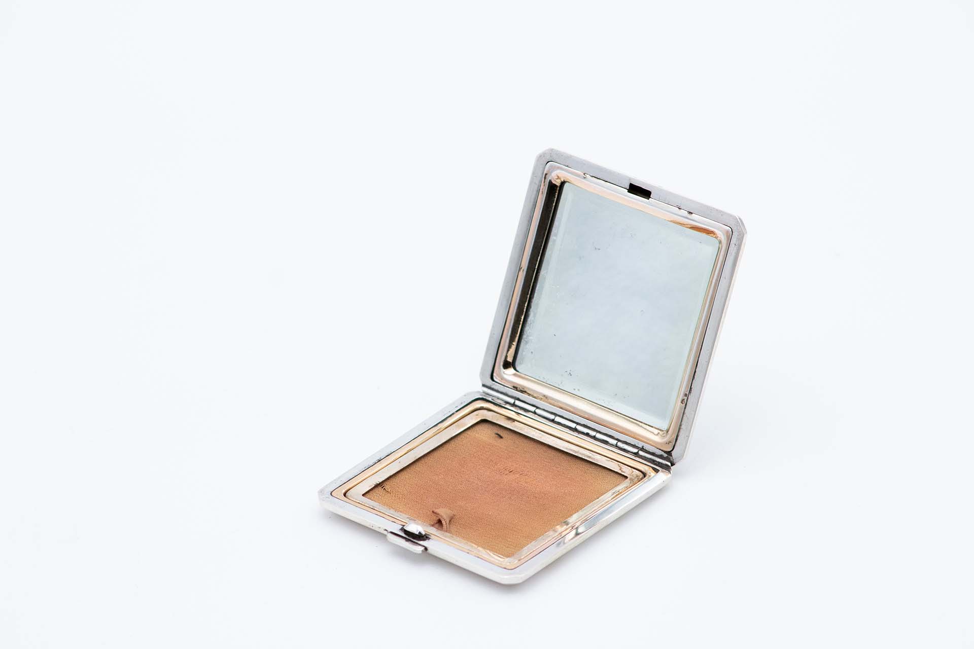 • Descrição: Caixa de toilette em prata lisa e formato quadrado para pó de arroz com espelho no interior.