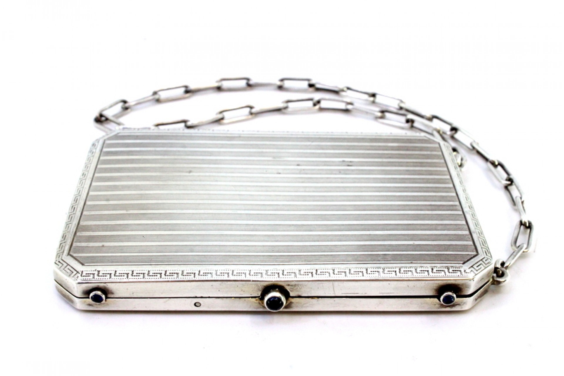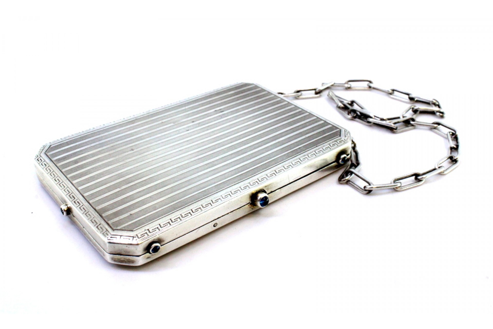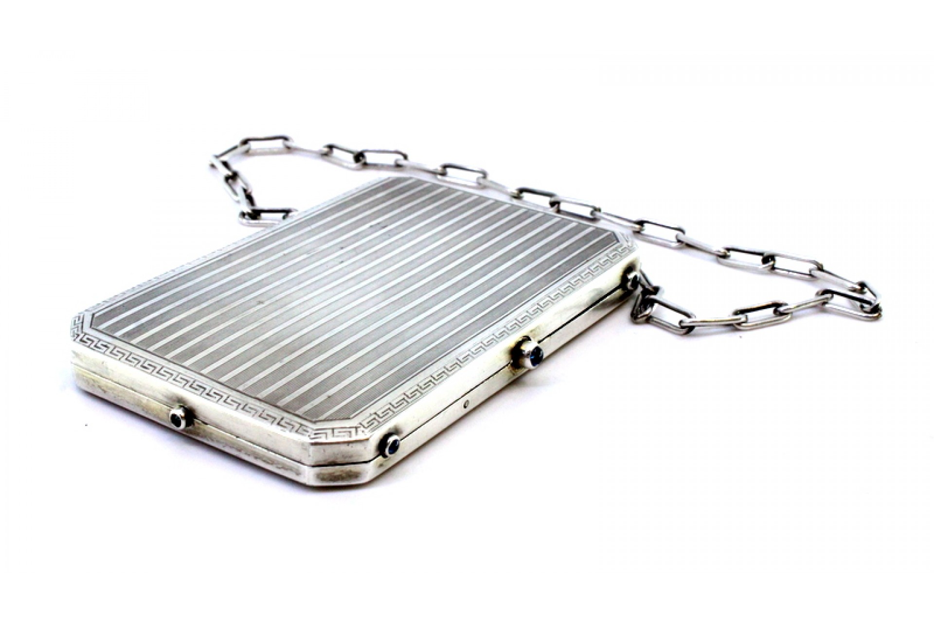 • Descrição: Caixa de toilette em prata com bandas gravados ao alto, friso grego envolvente, depósitos no interior, folha de marfim para escrita, lapiseira solta, suporte para cartões e corrente de suspensão.