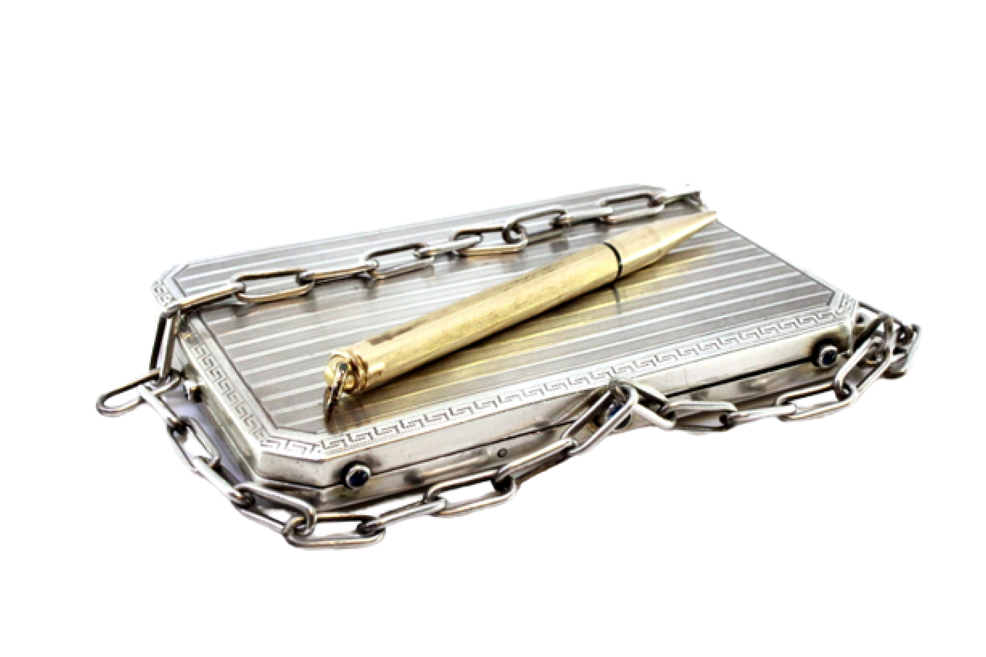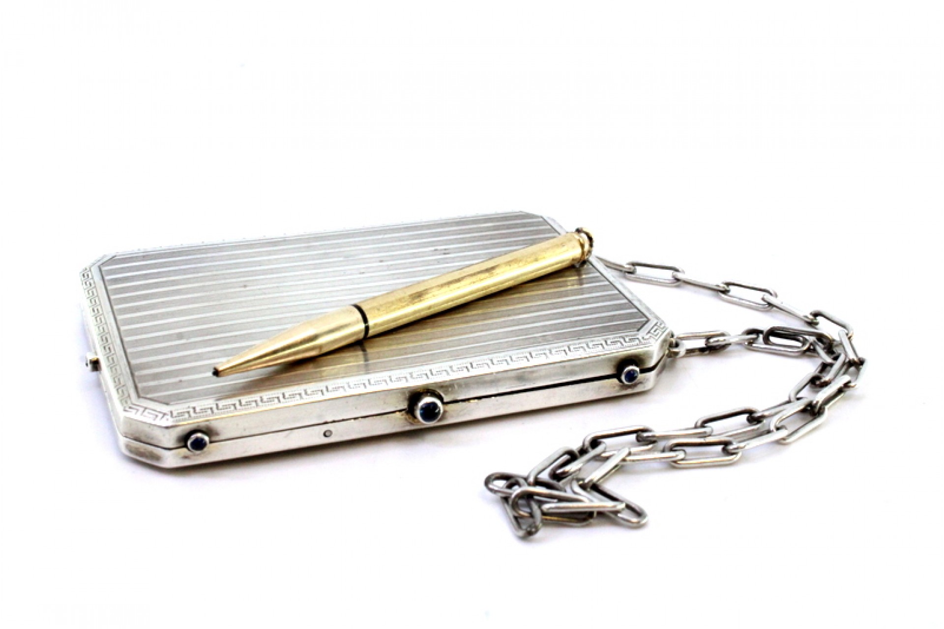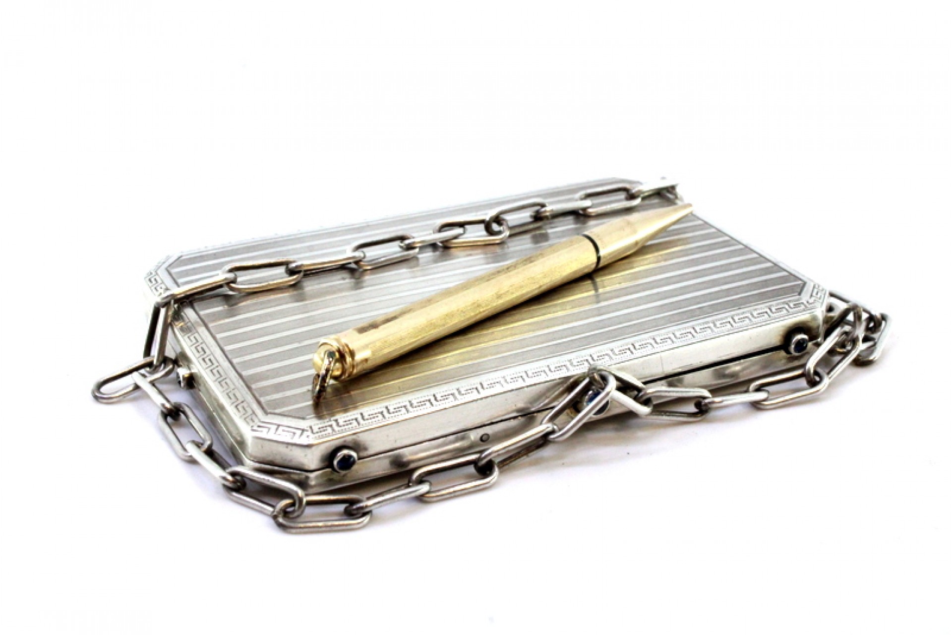 Caixa de toilette em prata com gravados ao alto, friso grego envolvente, depósitos no interior, folha de marfim para escrita, lapiseira solta, suporte para cartões e corrente de suspensão.