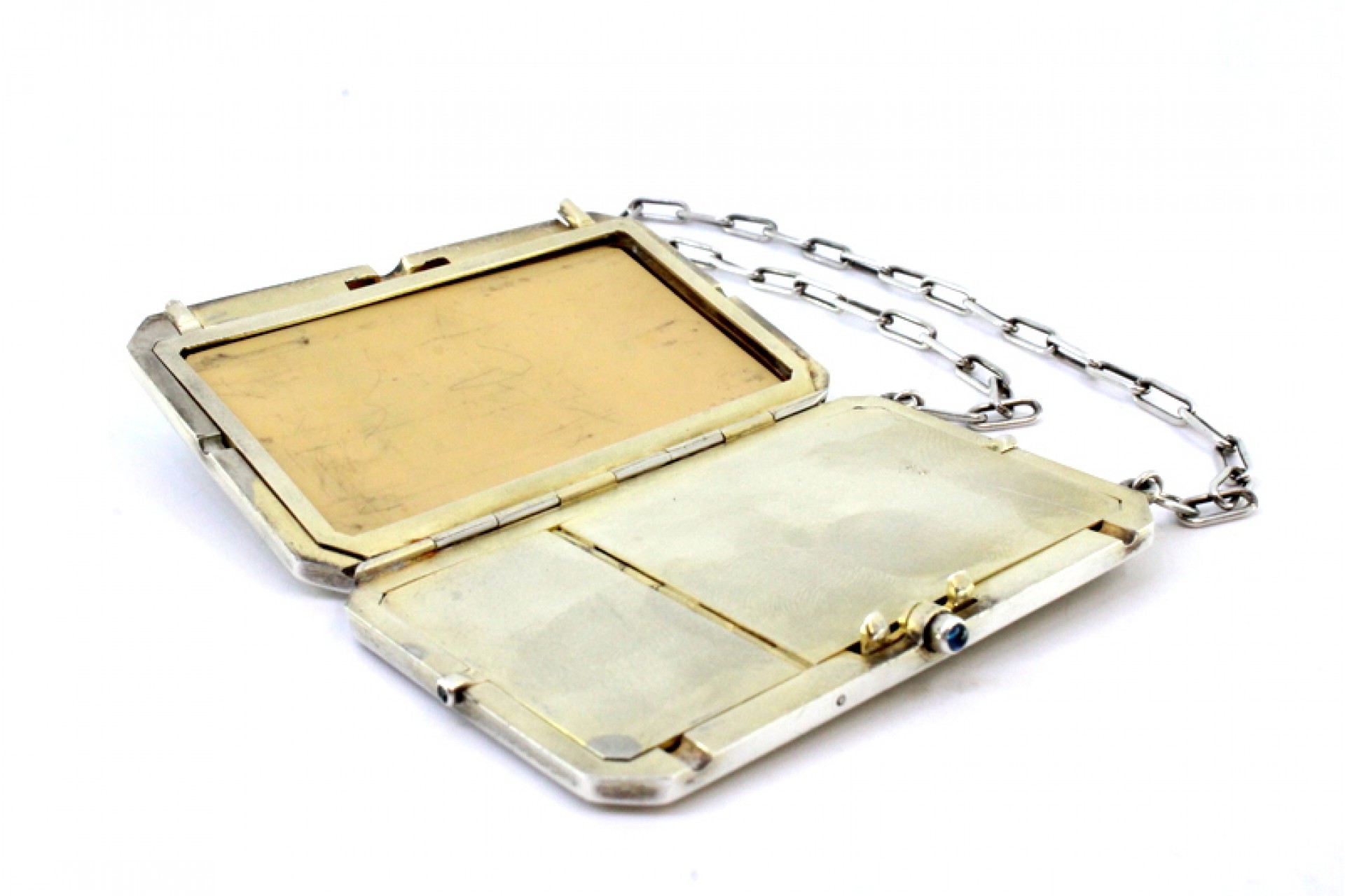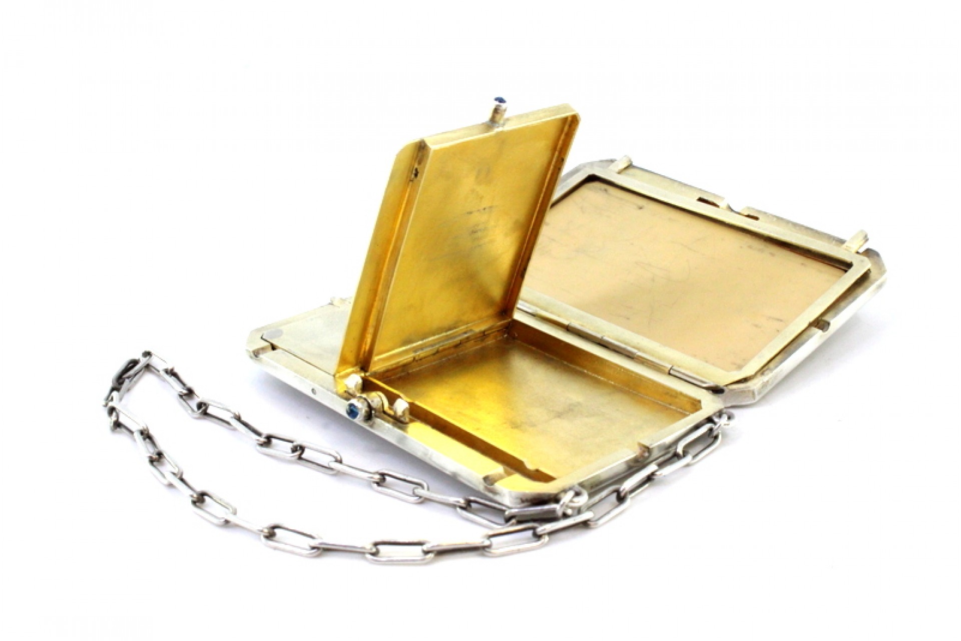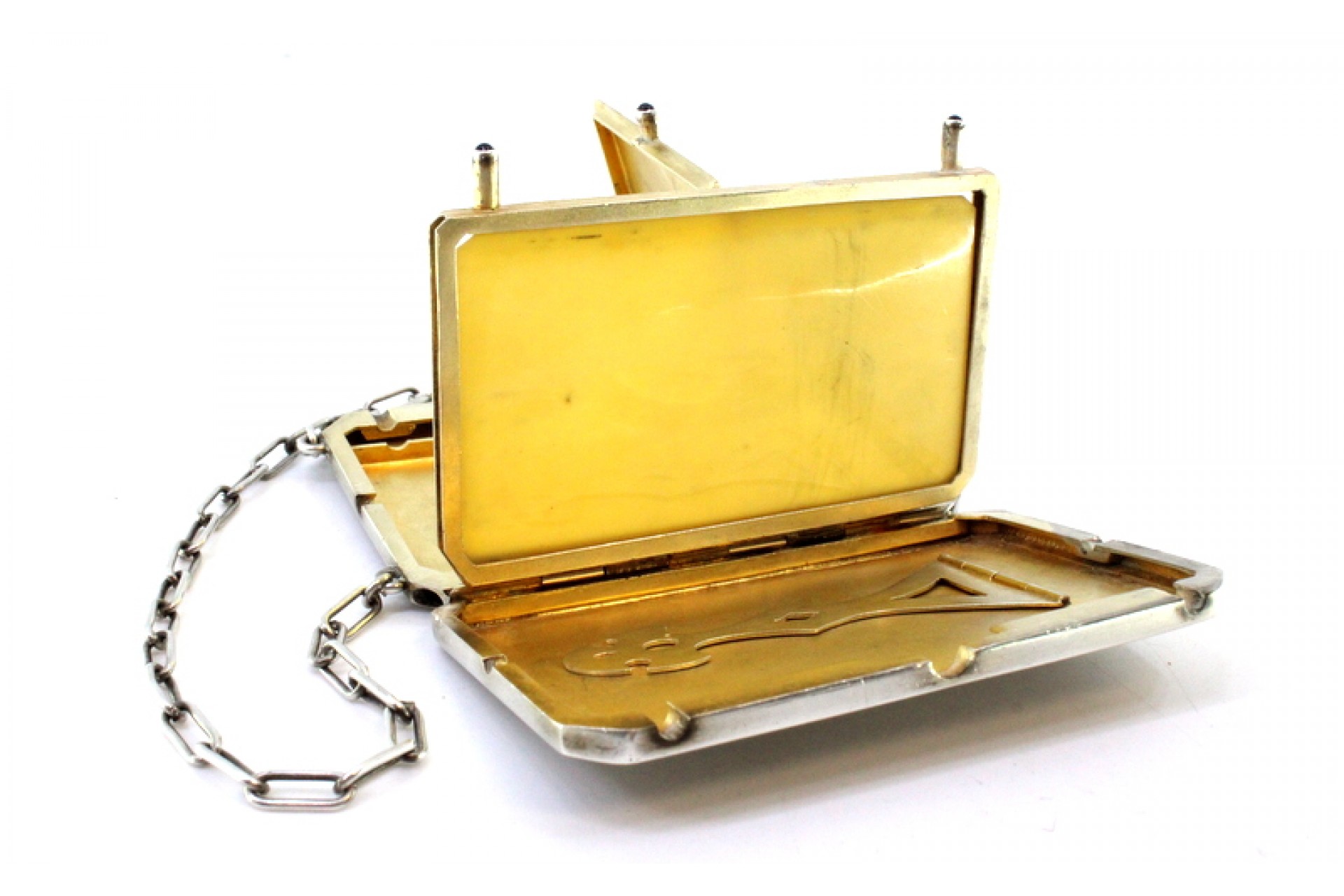 Caixa de toilette em prata com gravados ao alto, friso grego envolvente, depósitos no interior, folha de marfim para escrita, lapiseira solta, suporte para cartões e corrente de suspensão.