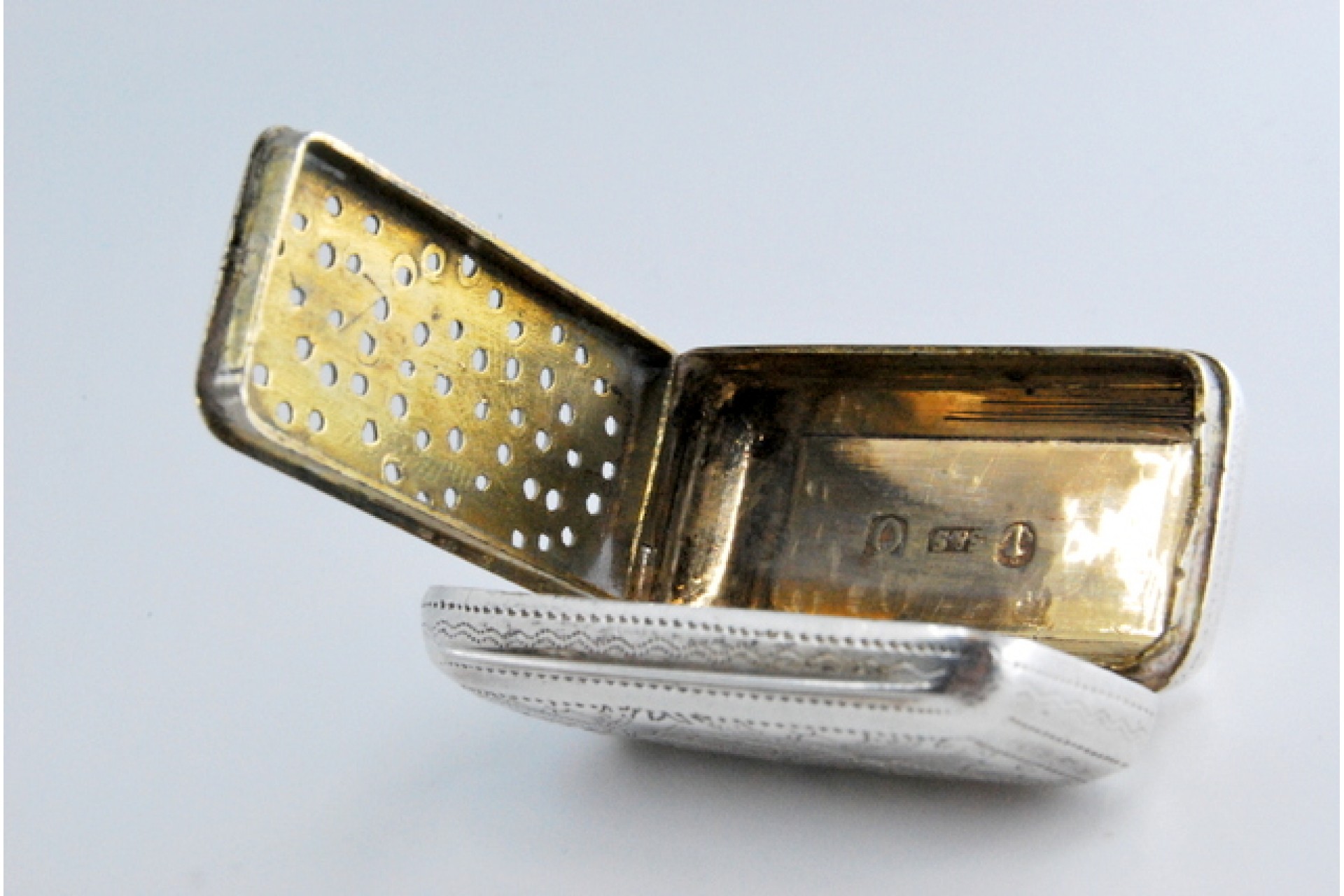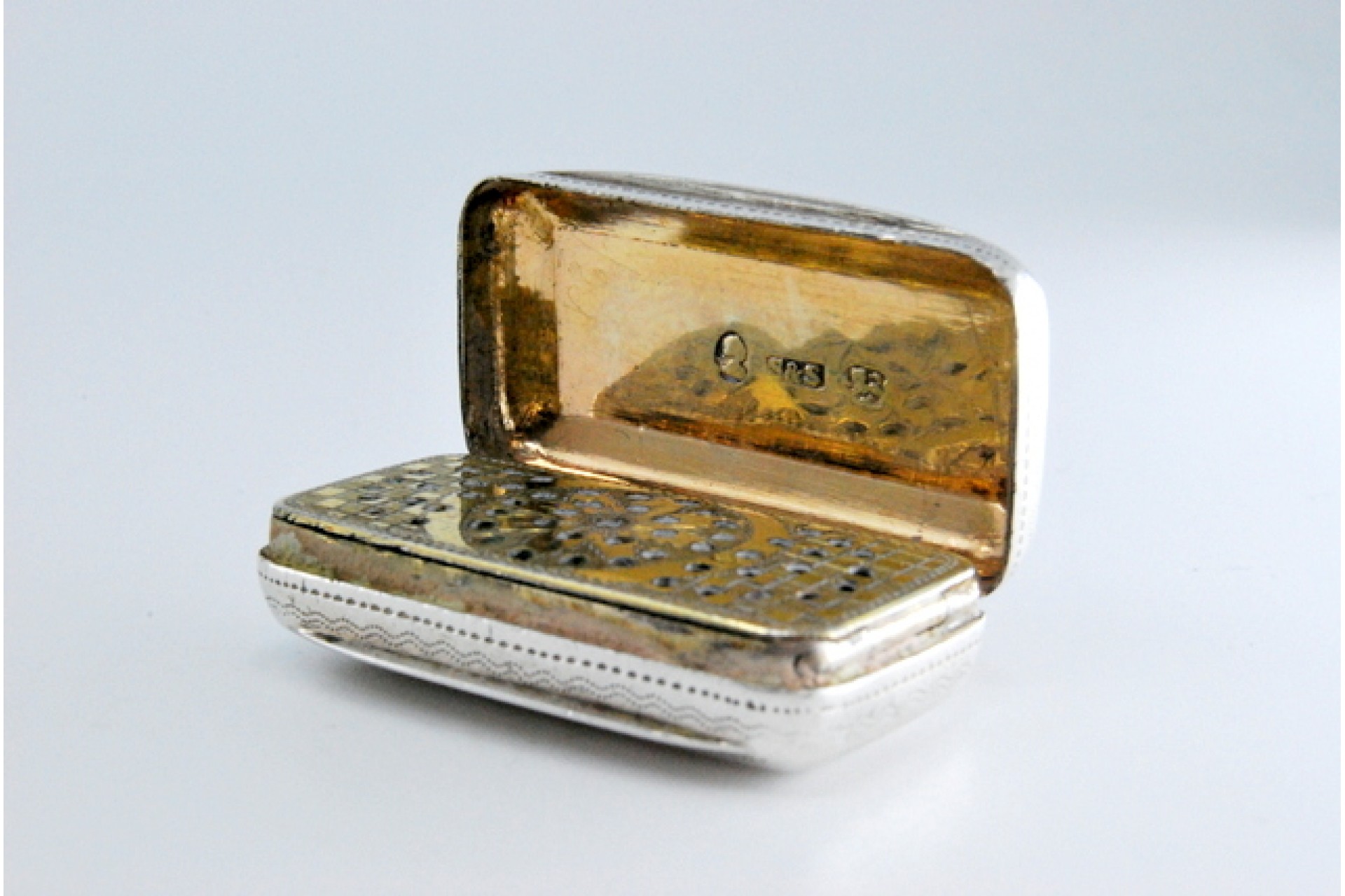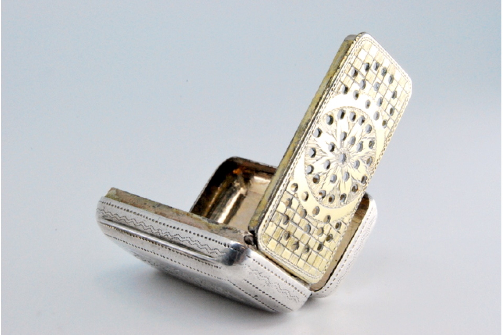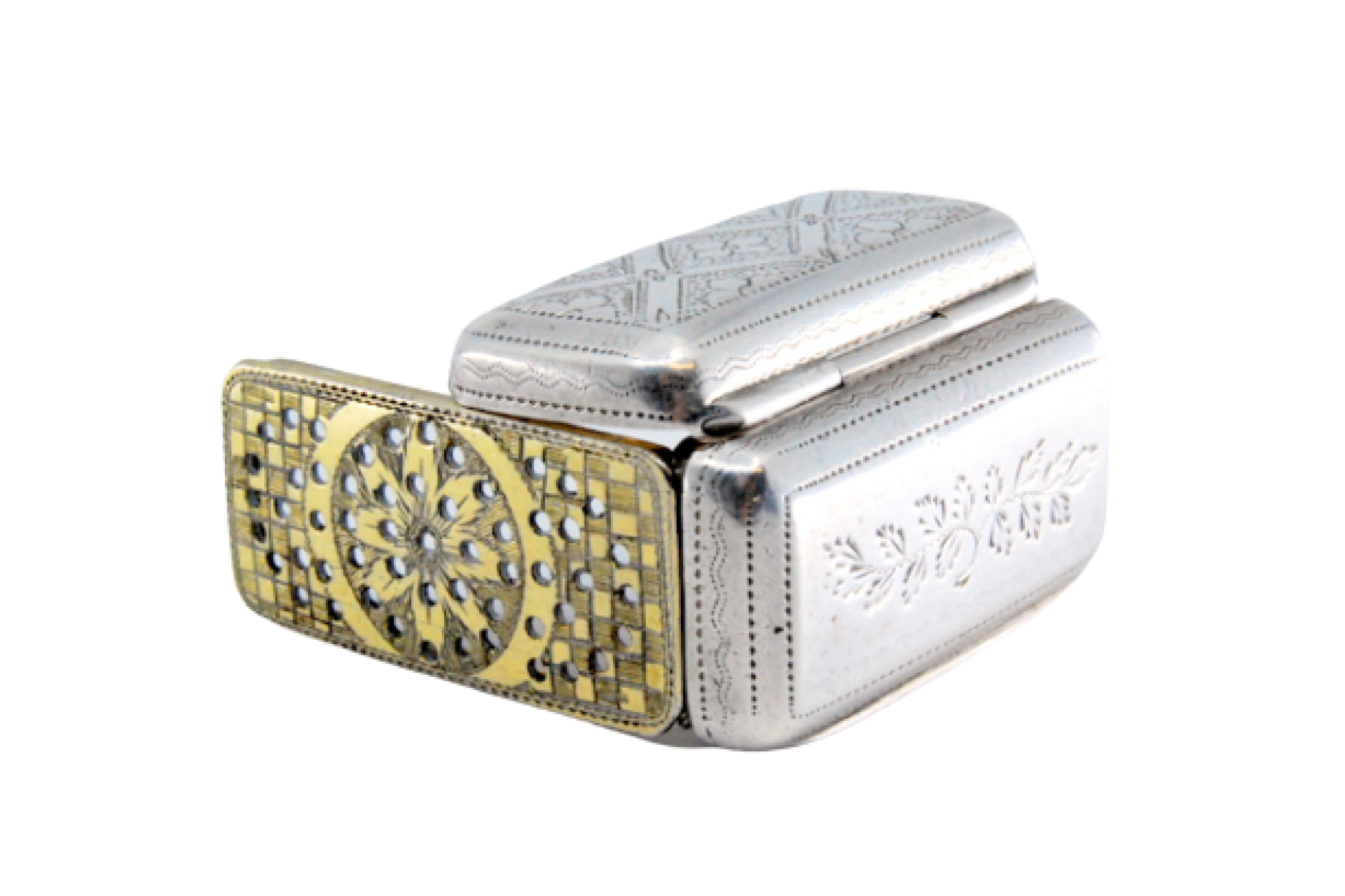• Descrição: Caixa de Vinagrete em prata e ouro com figuras geométricas em ambos os lados do período de George III.