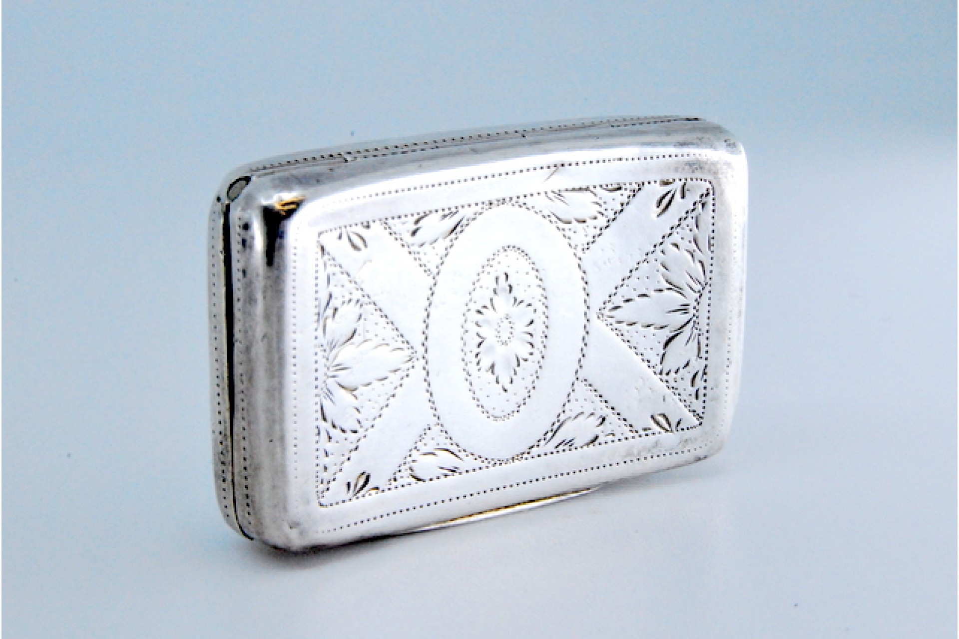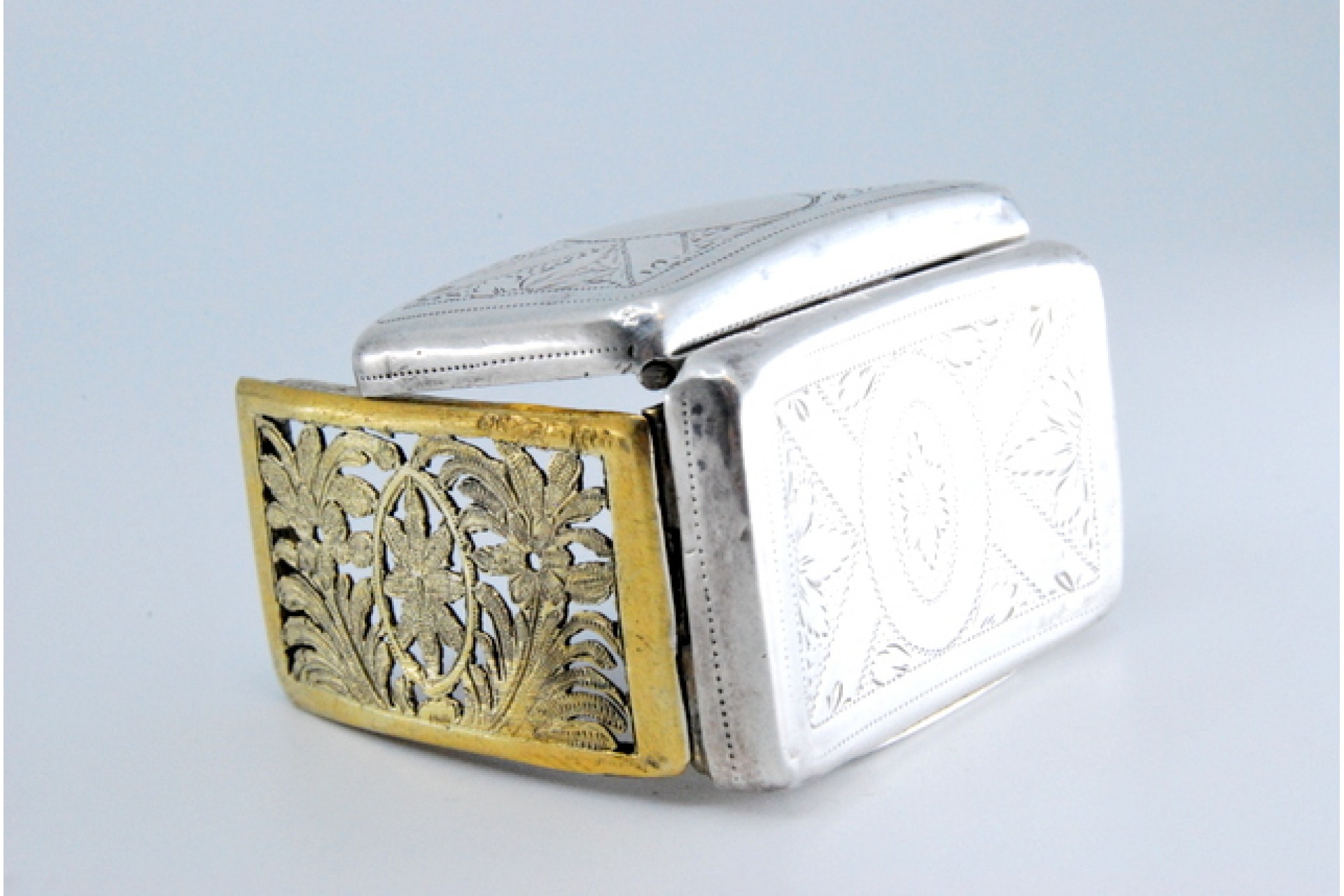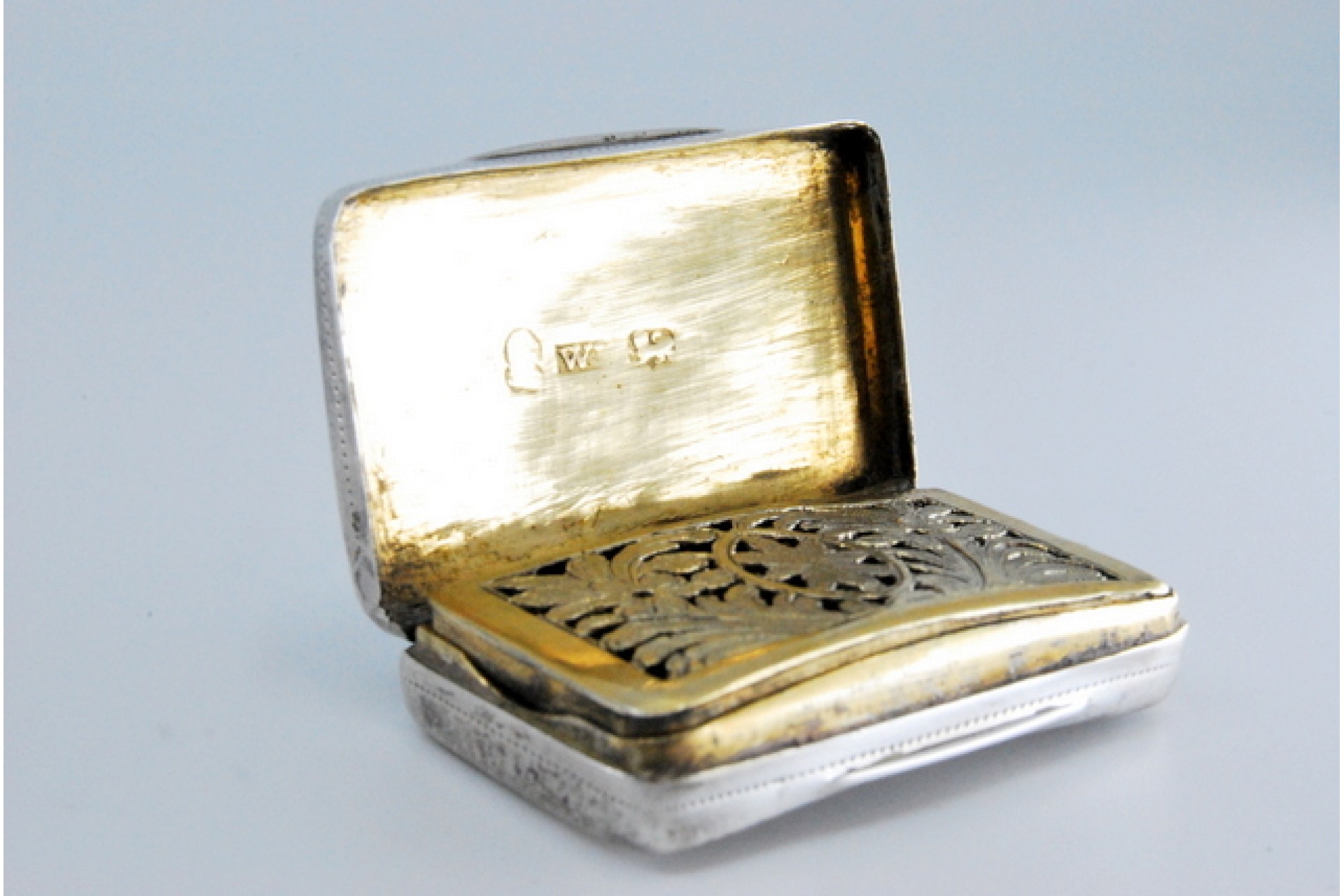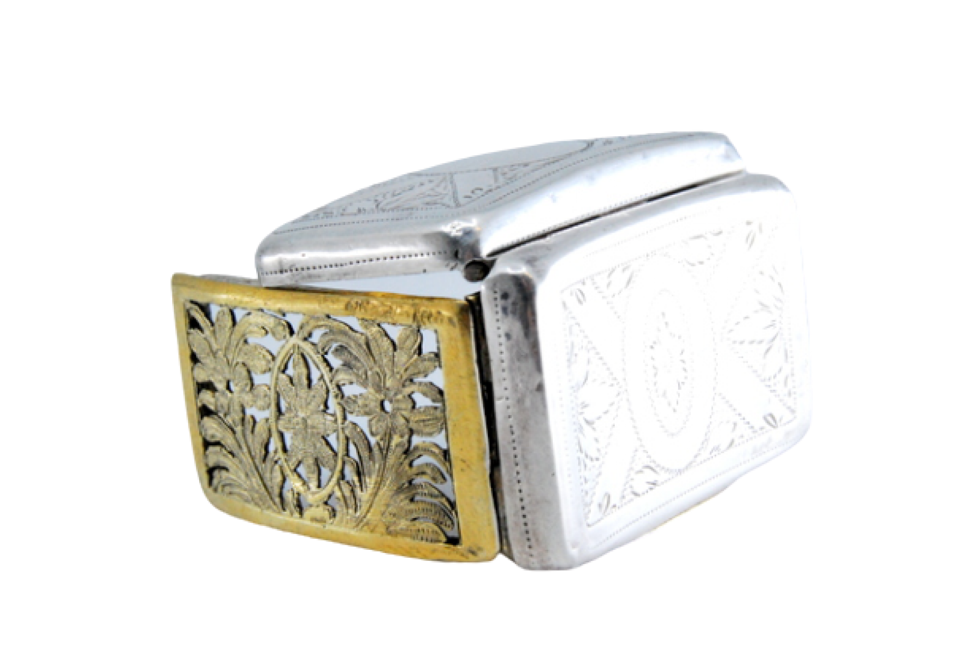 • Descrição: Caixa de Vinagrete em prata e ouro de forma curva, com gravados e do período de George III.