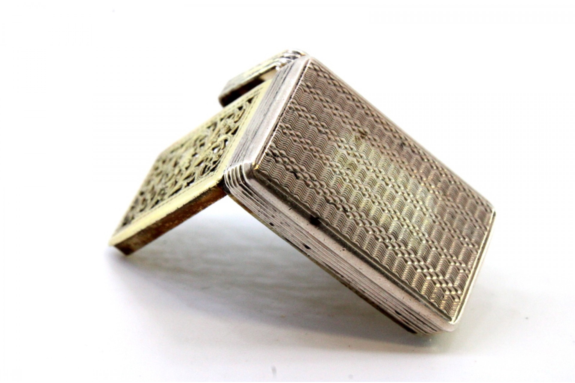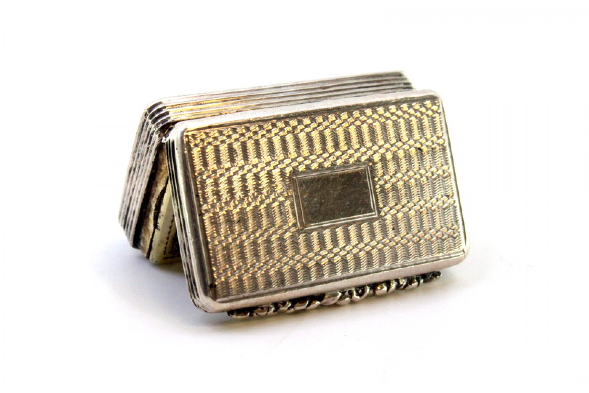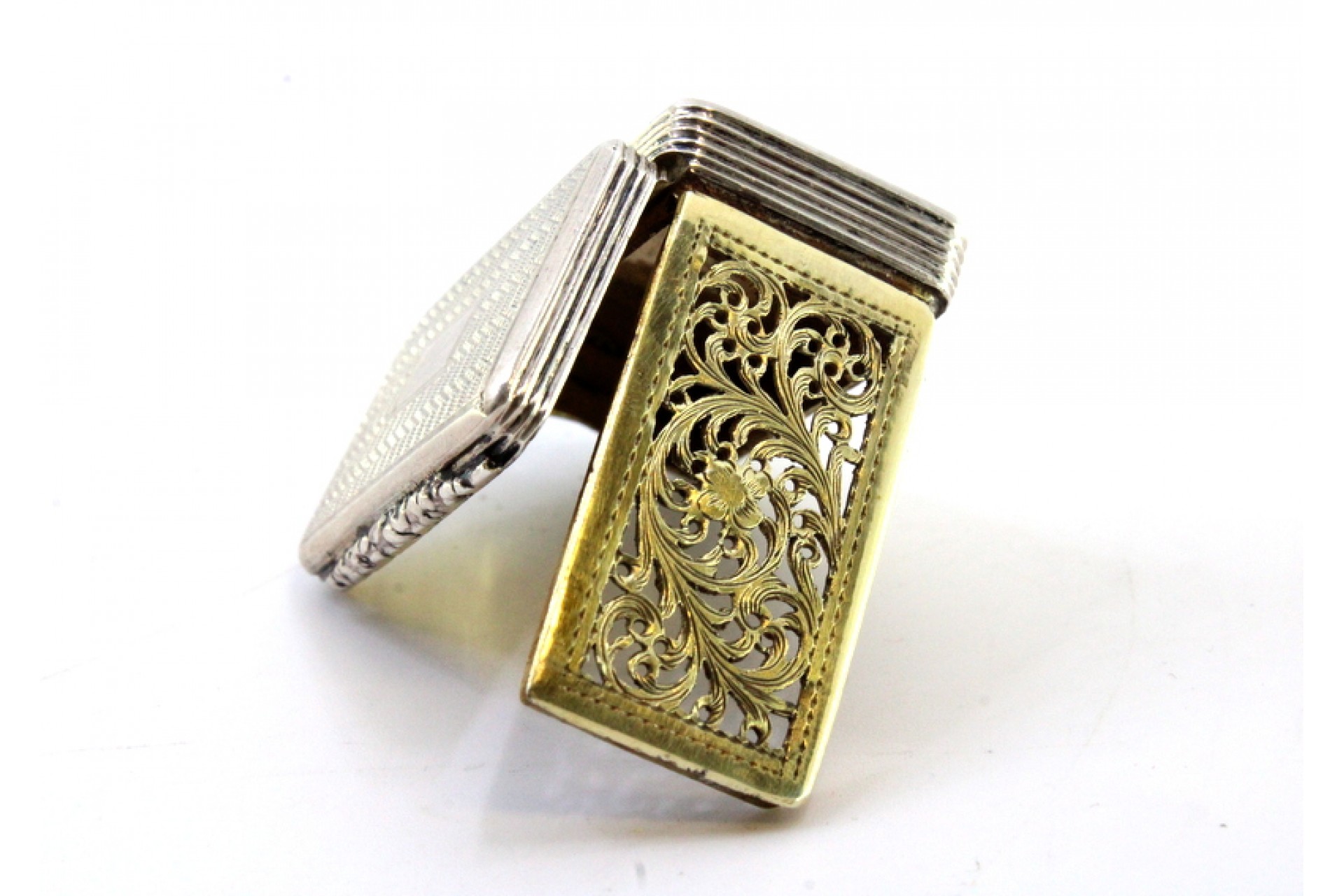 • Descrição: Caixa de Vinagrete em prata e ouro com gravados envolvendo cartela para monograma na tampa basculante, período Guilherme IV.