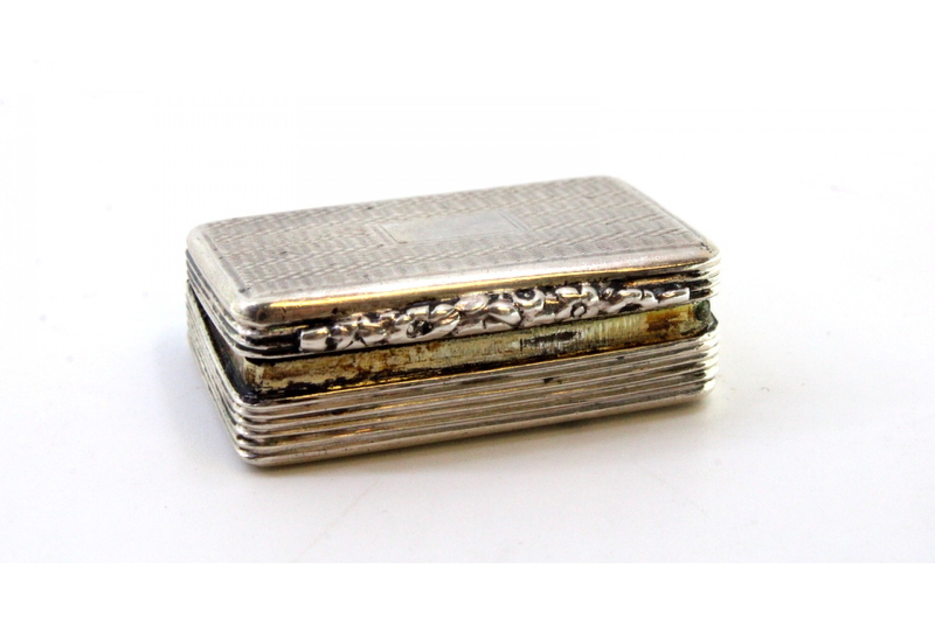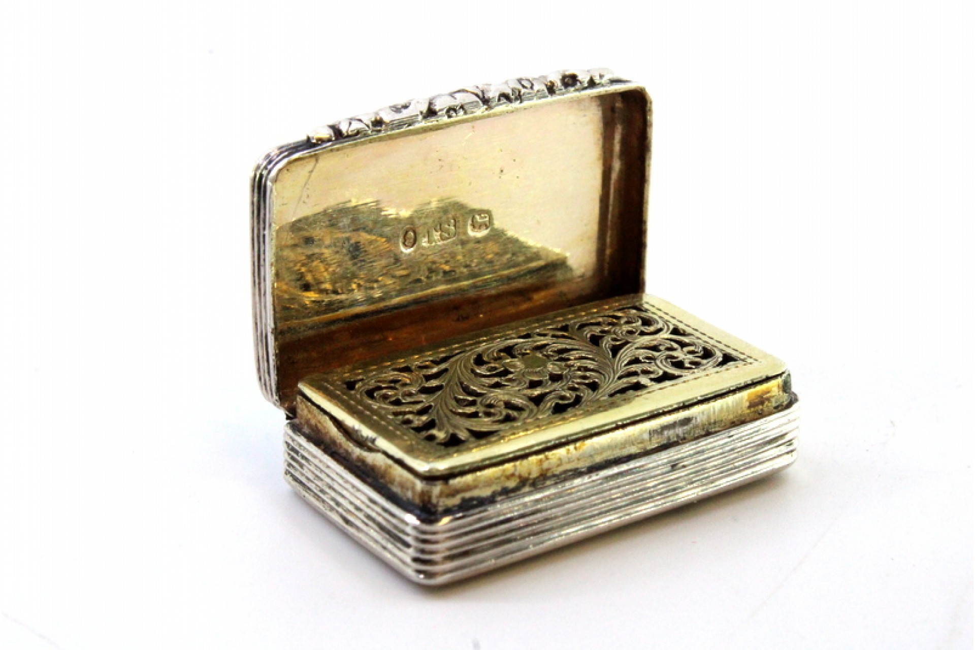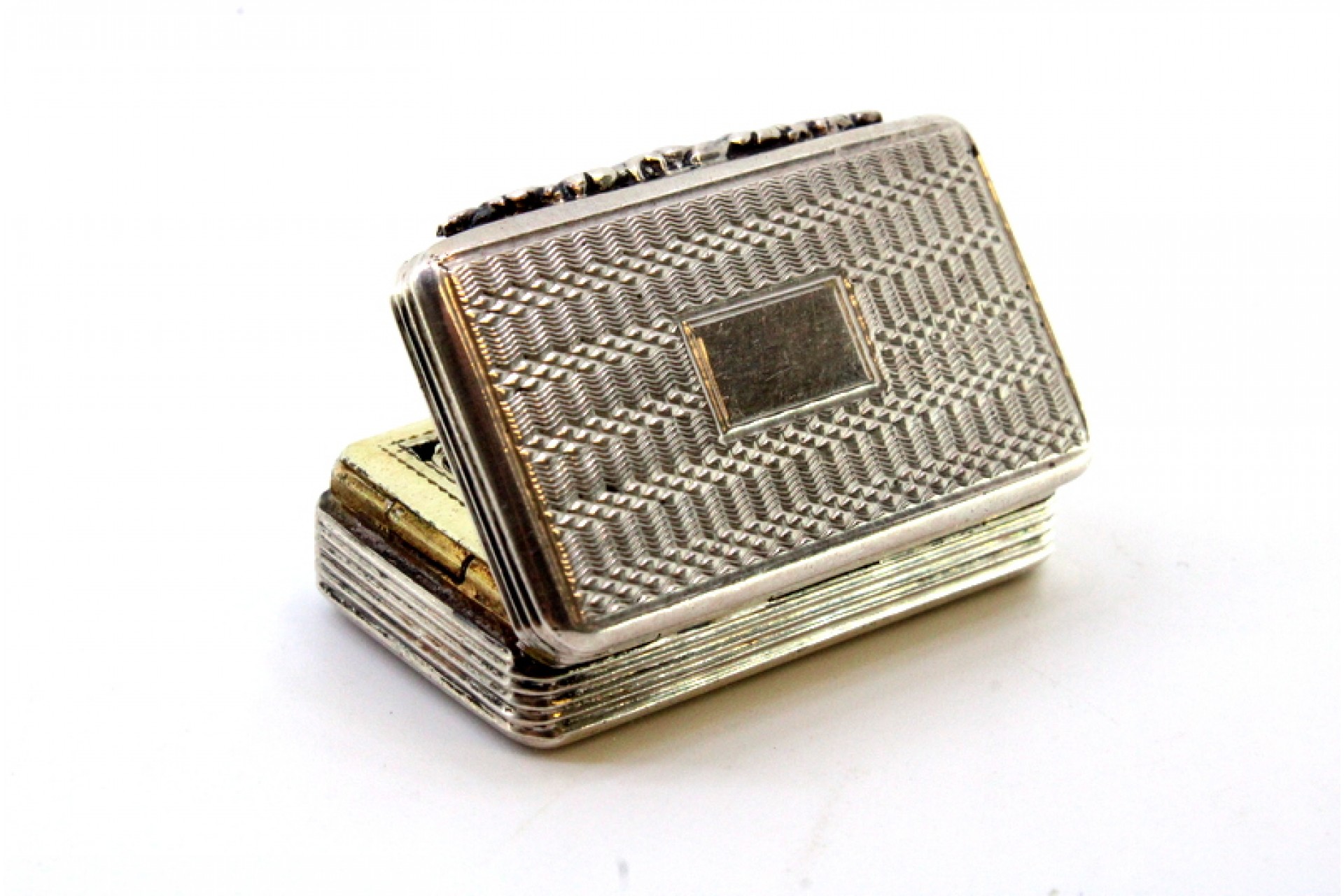 • Descrição: Caixa de Vinagrete em prata e ouro com gravados envolvendo cartela para monograma na tampa basculante, período Guilherme IV.