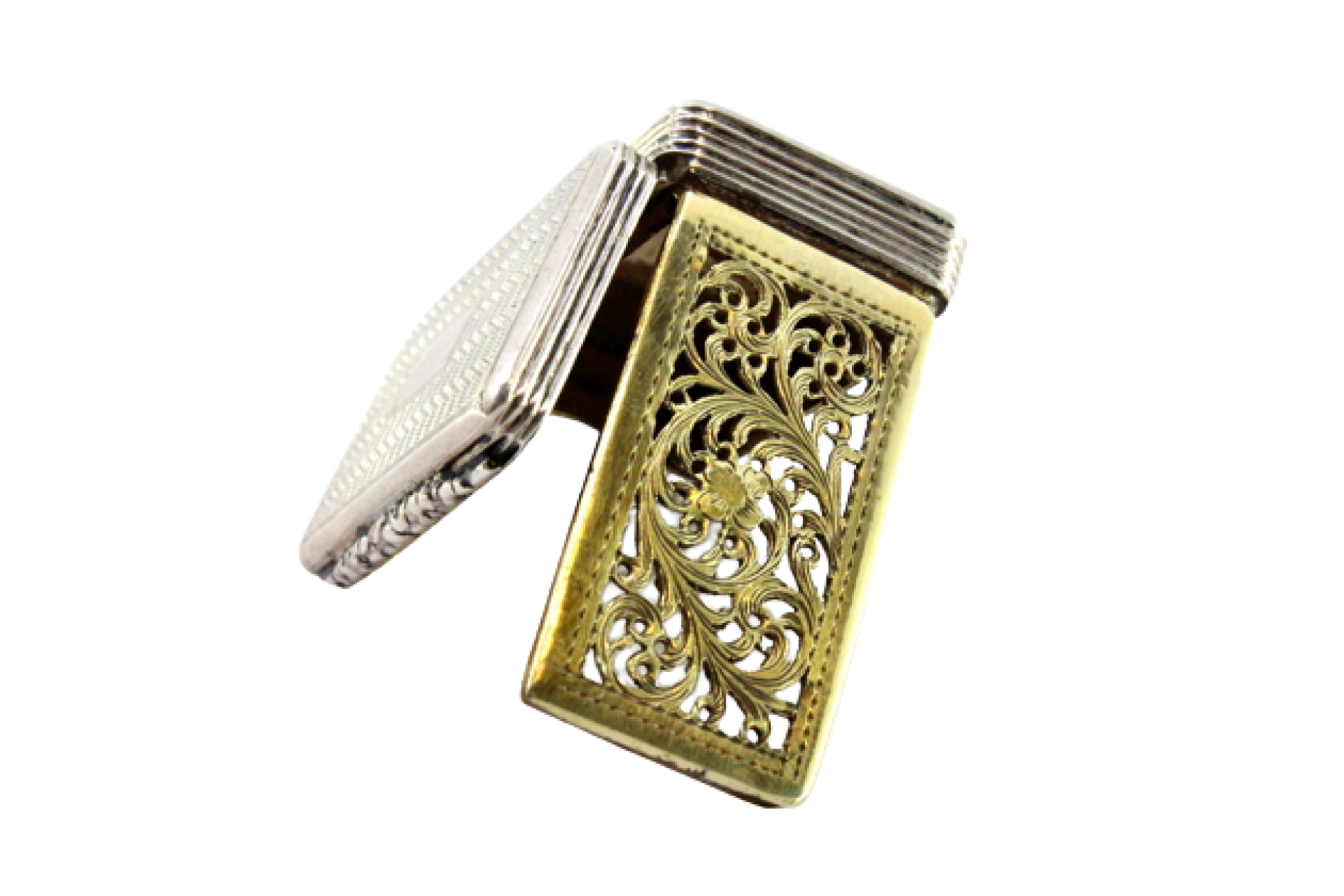 Caixa de Vinagrete em prata e ouro com gravados envolvendo cartela