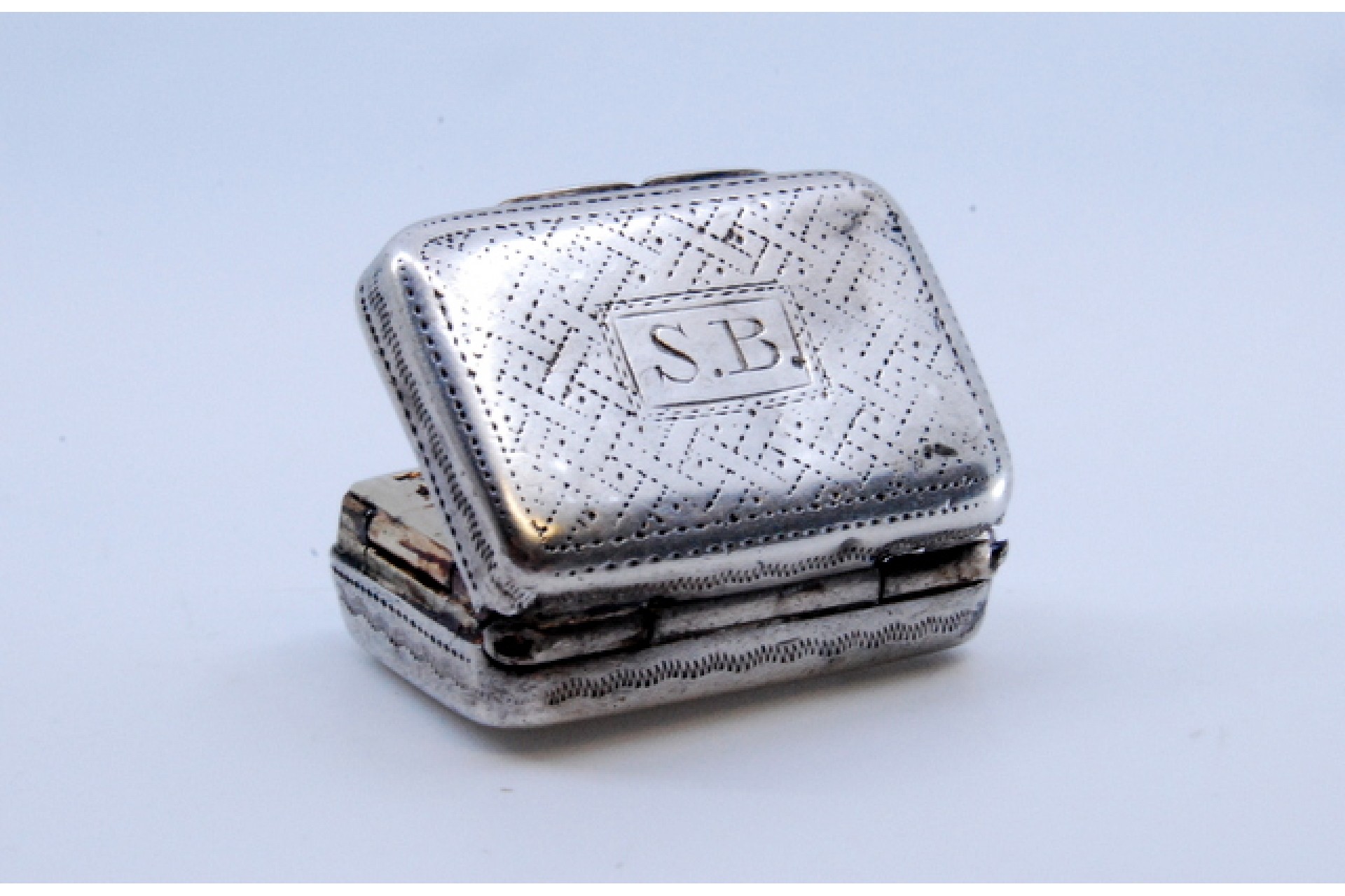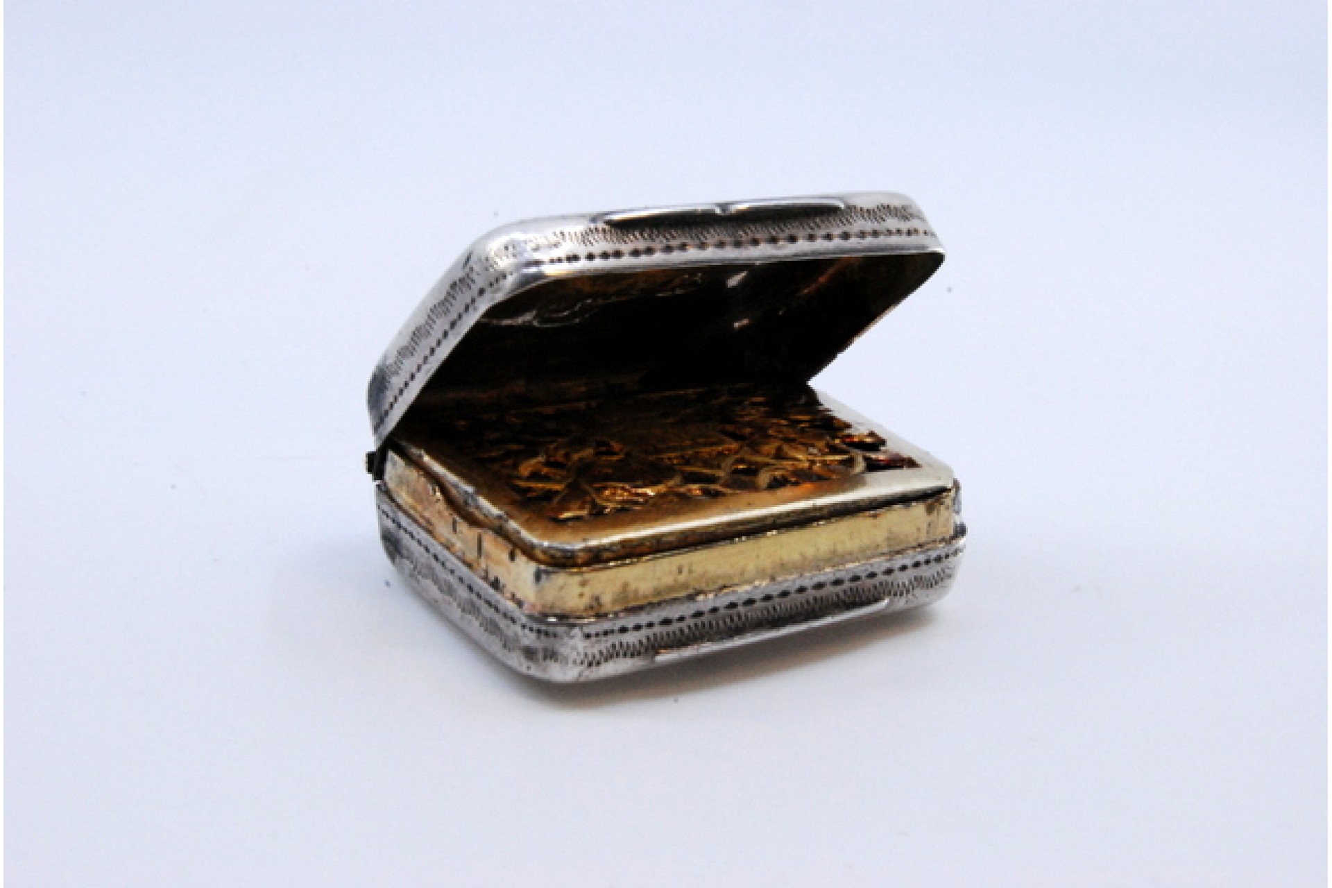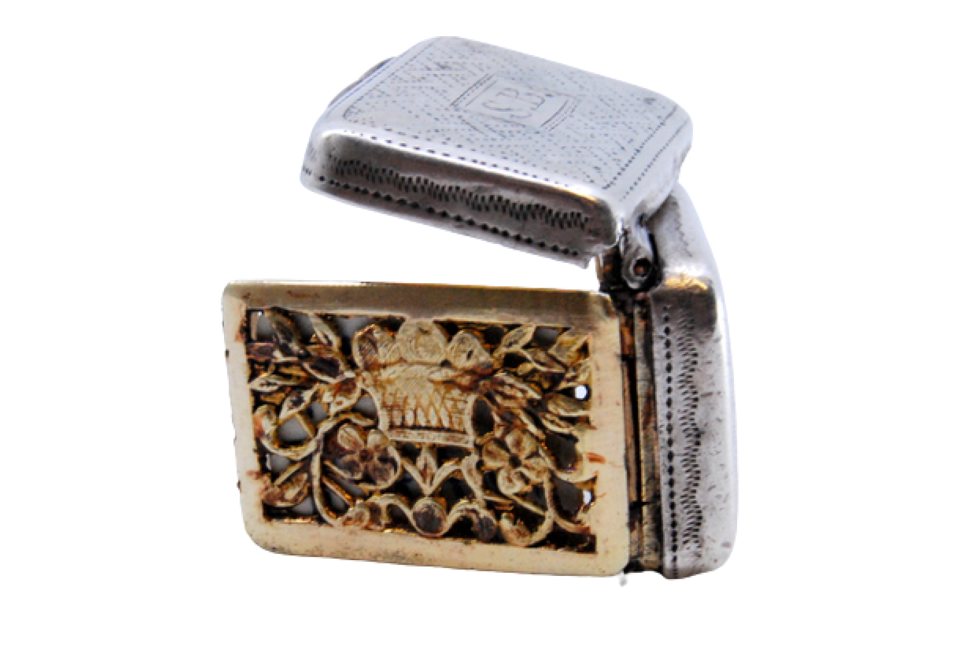 • Descrição: Caixa de Vinagrete em prata e ouro com gravados na tampa do periodo de George III.