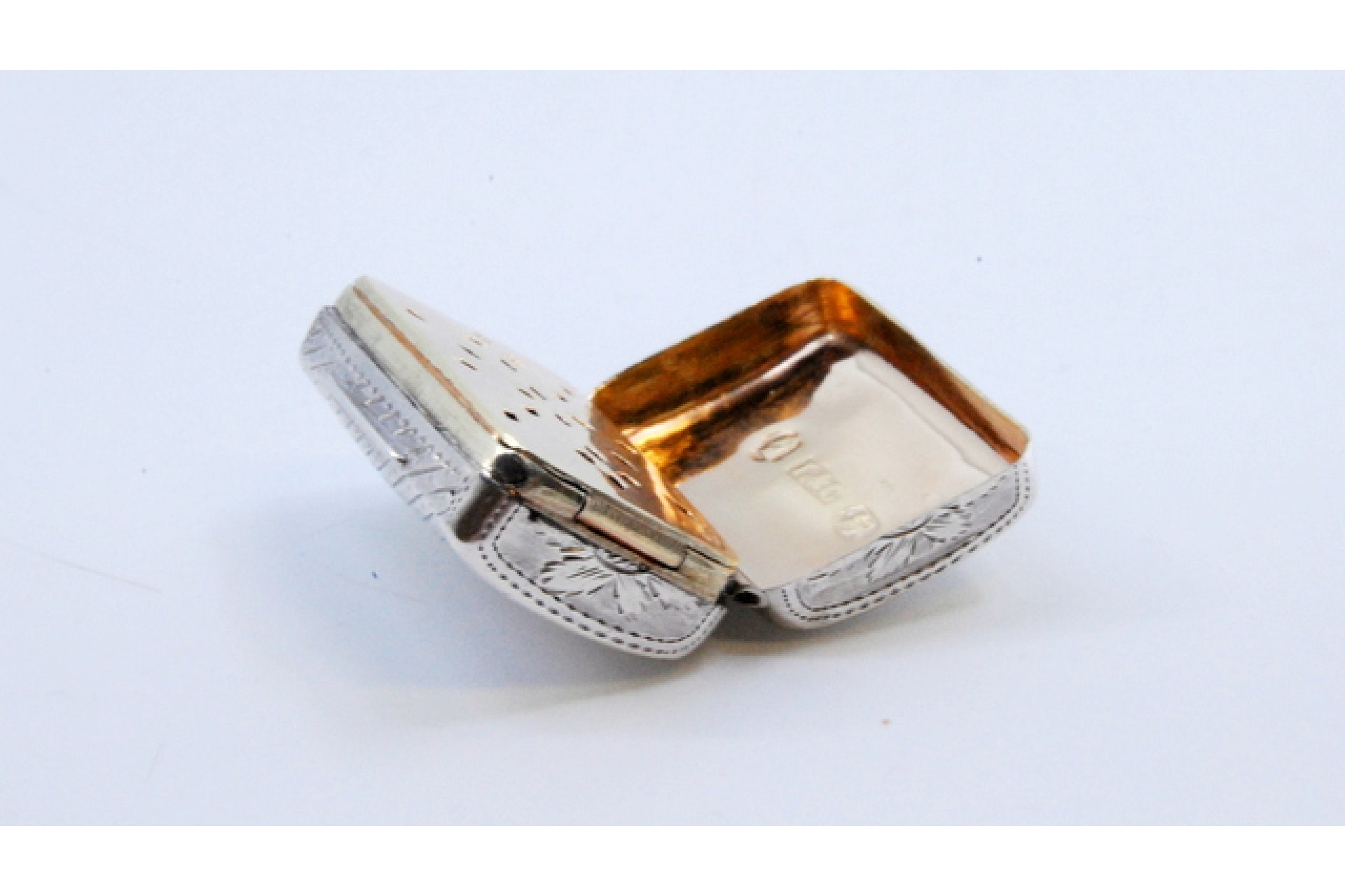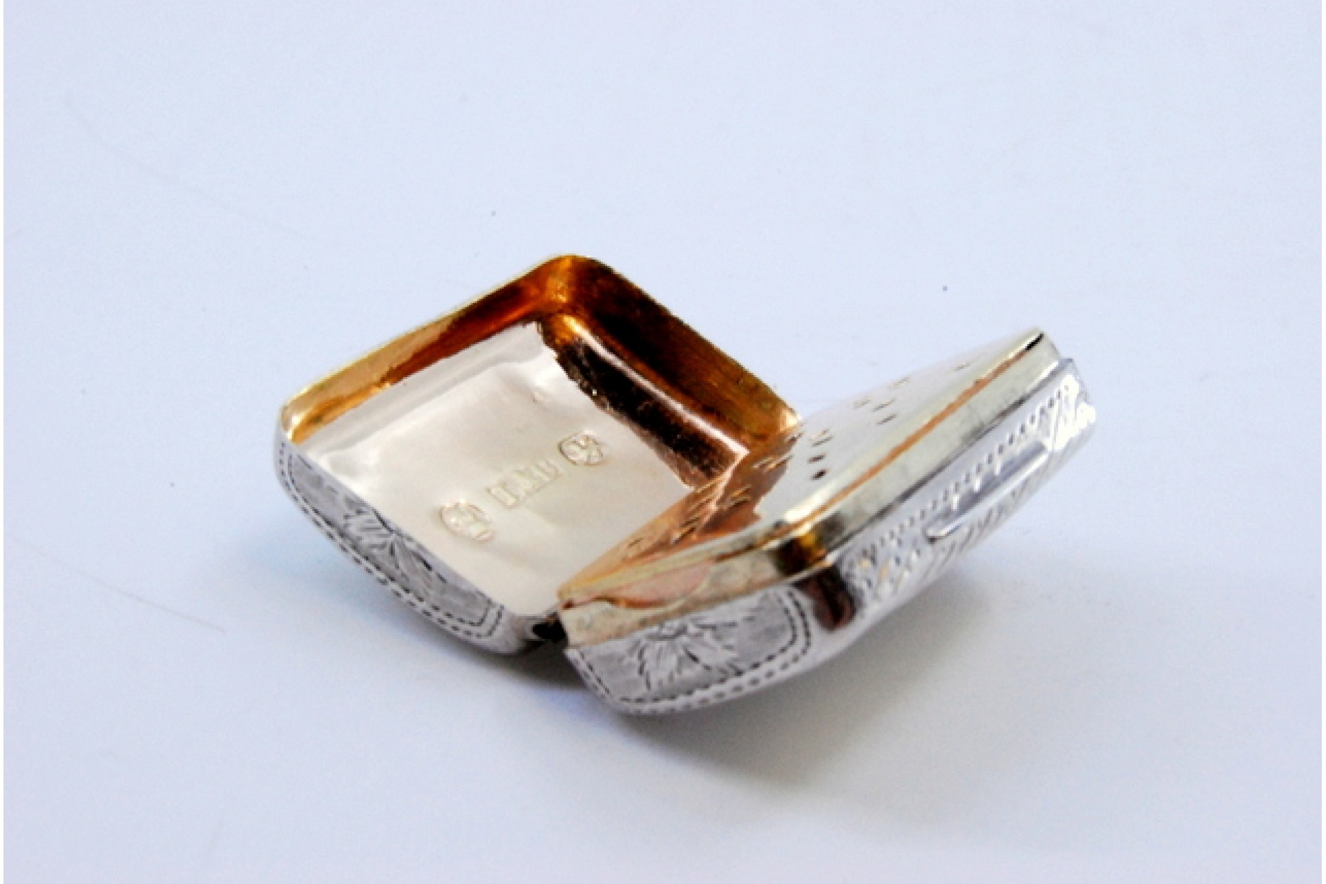 • Descrição: Caixa de Vinagrete em prata e ouro com tampa em forma de mala do período de George III.