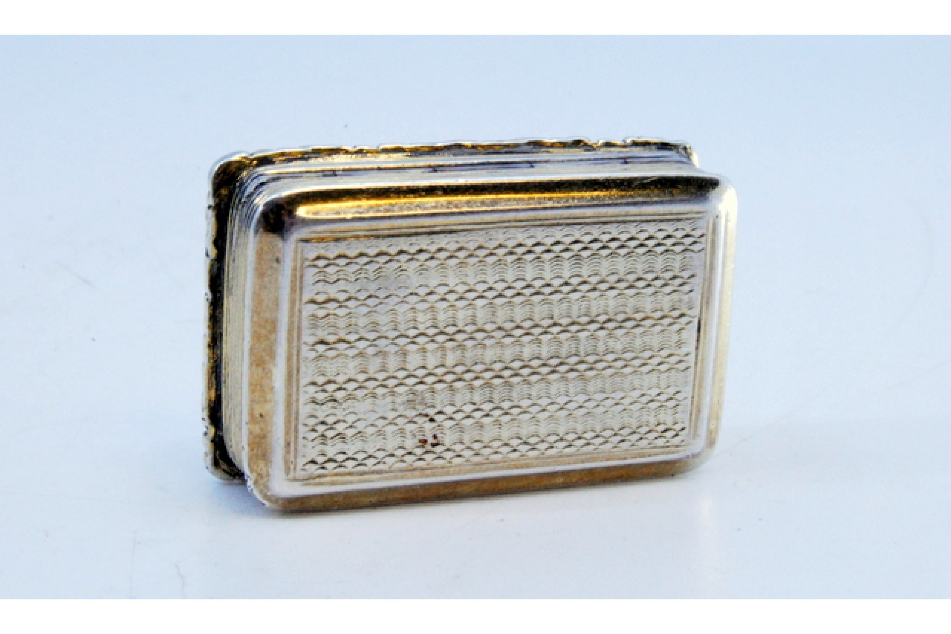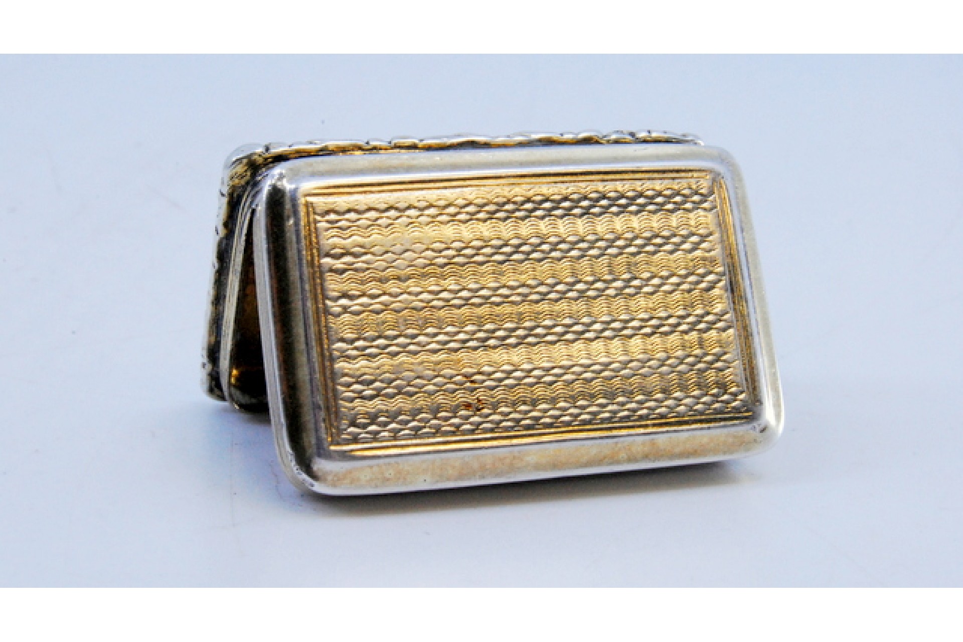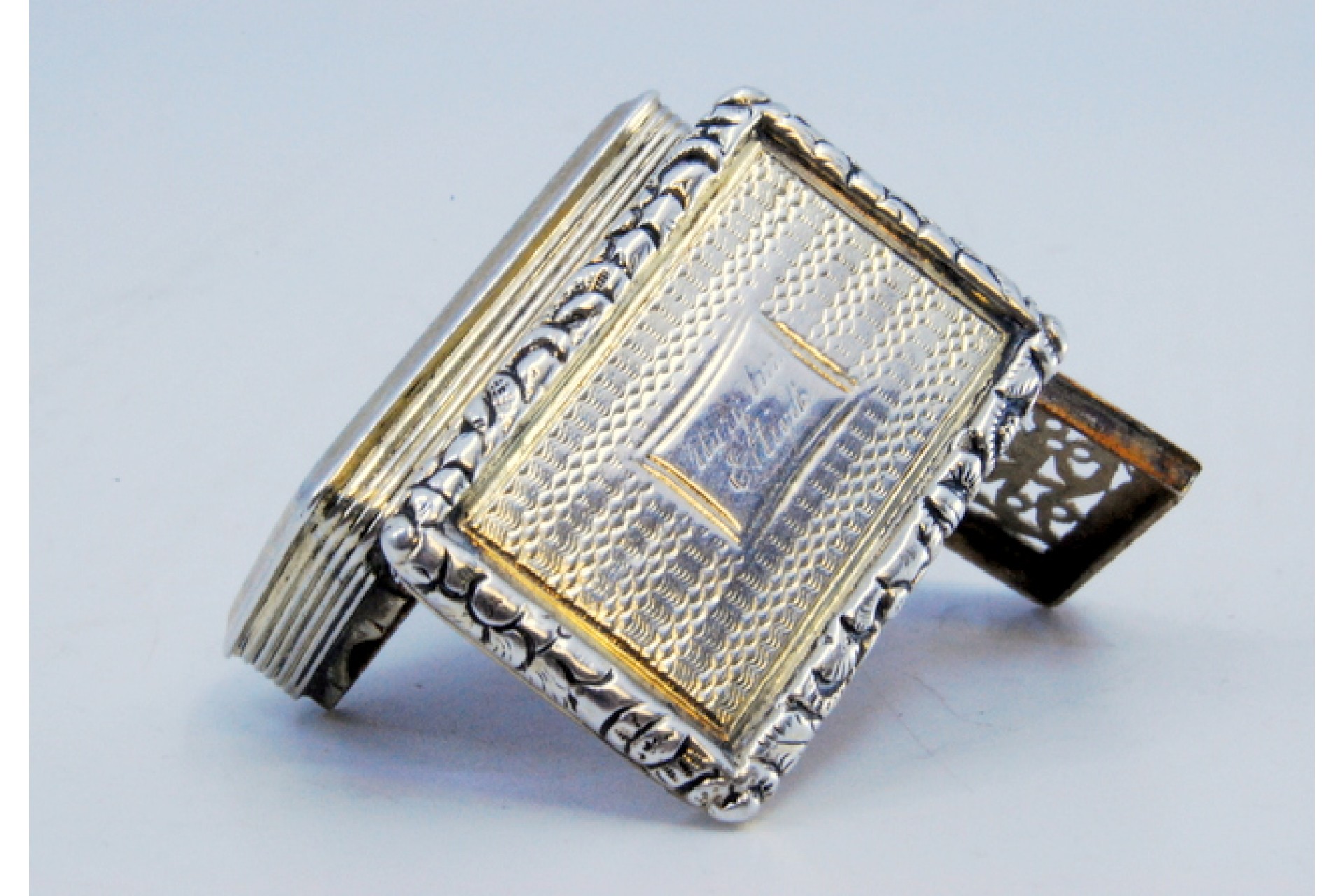 • Descrição: Caixa de Vinagrete em prata e ouro com friso cordeado na tampa do período de George IV.