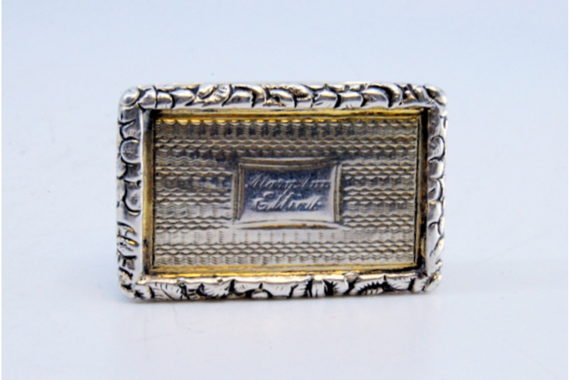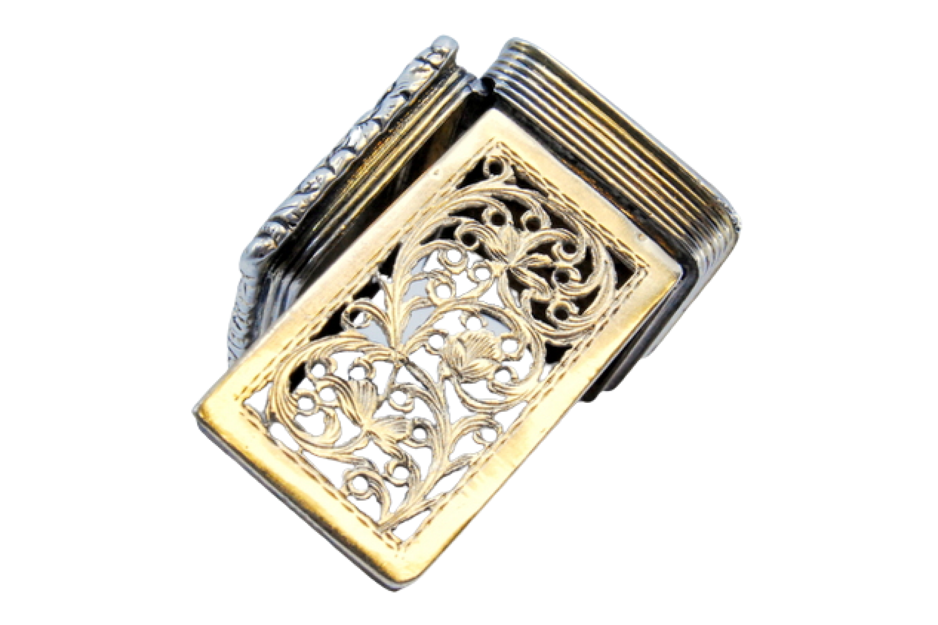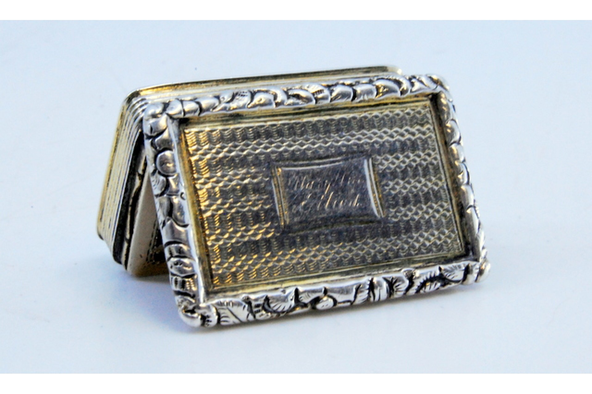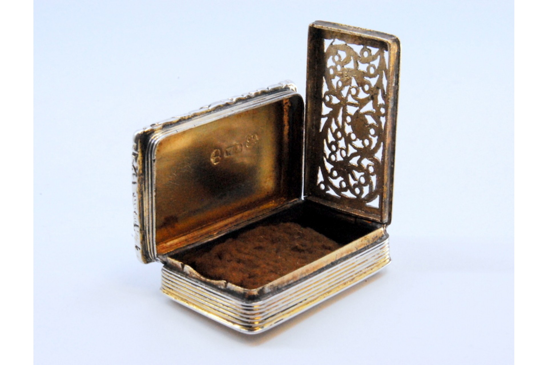 • Descrição: Caixa de Vinagrete em prata e ouro com friso cordeado na tampa do período de George IV.
