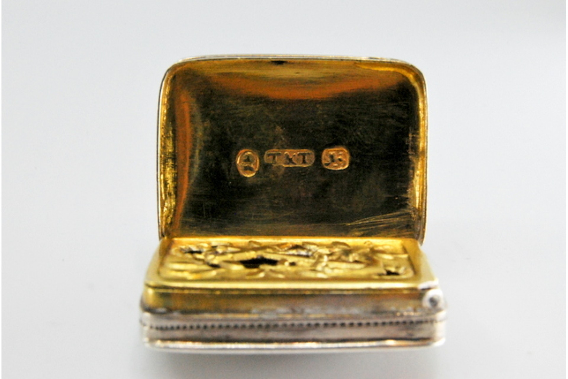 Caixa de Vinagrete em prata e ouro com gravados na tampa e frisos na envolvência do período de George III.