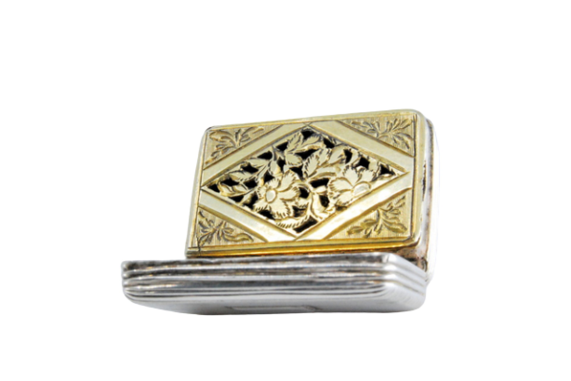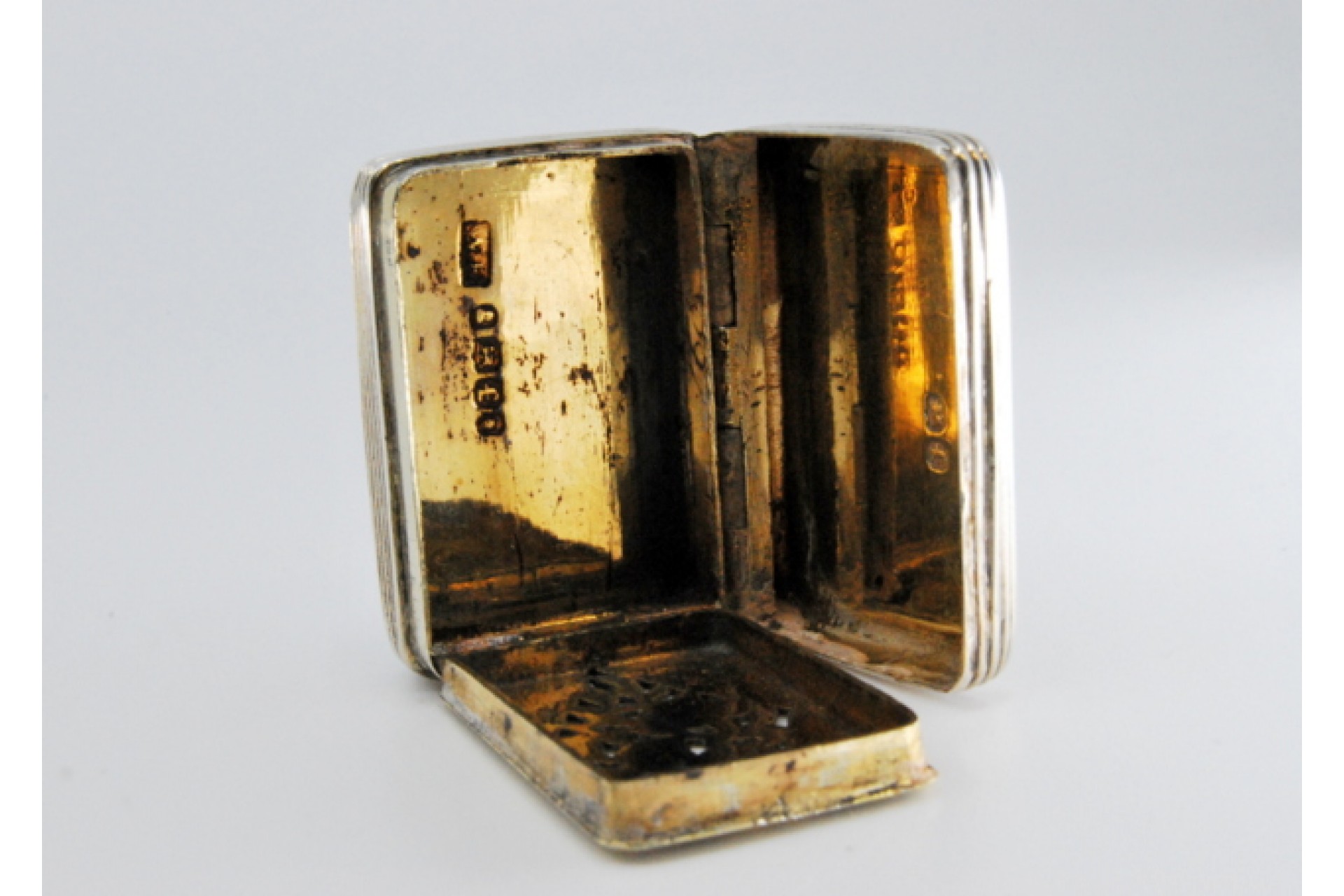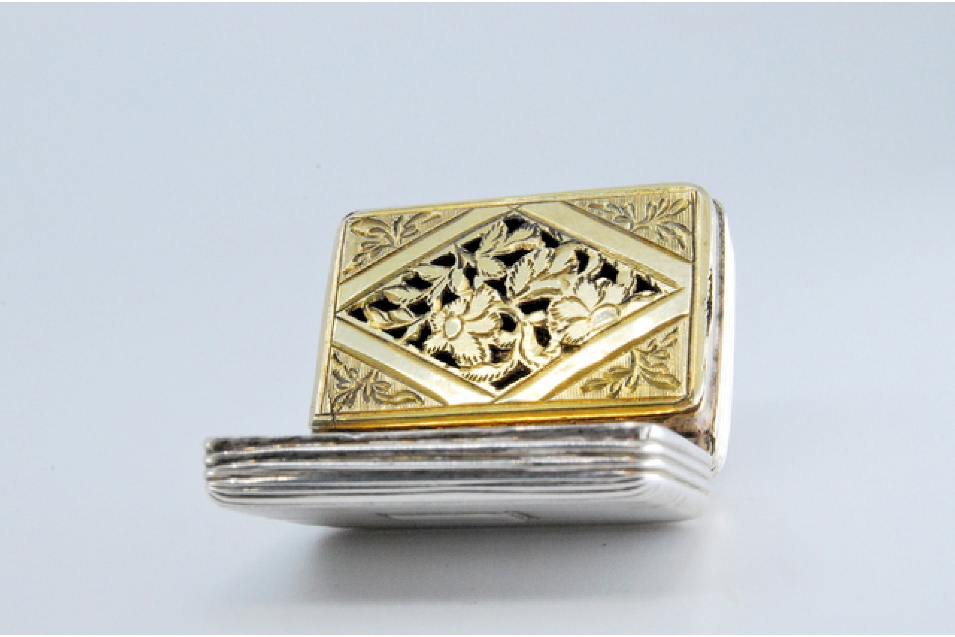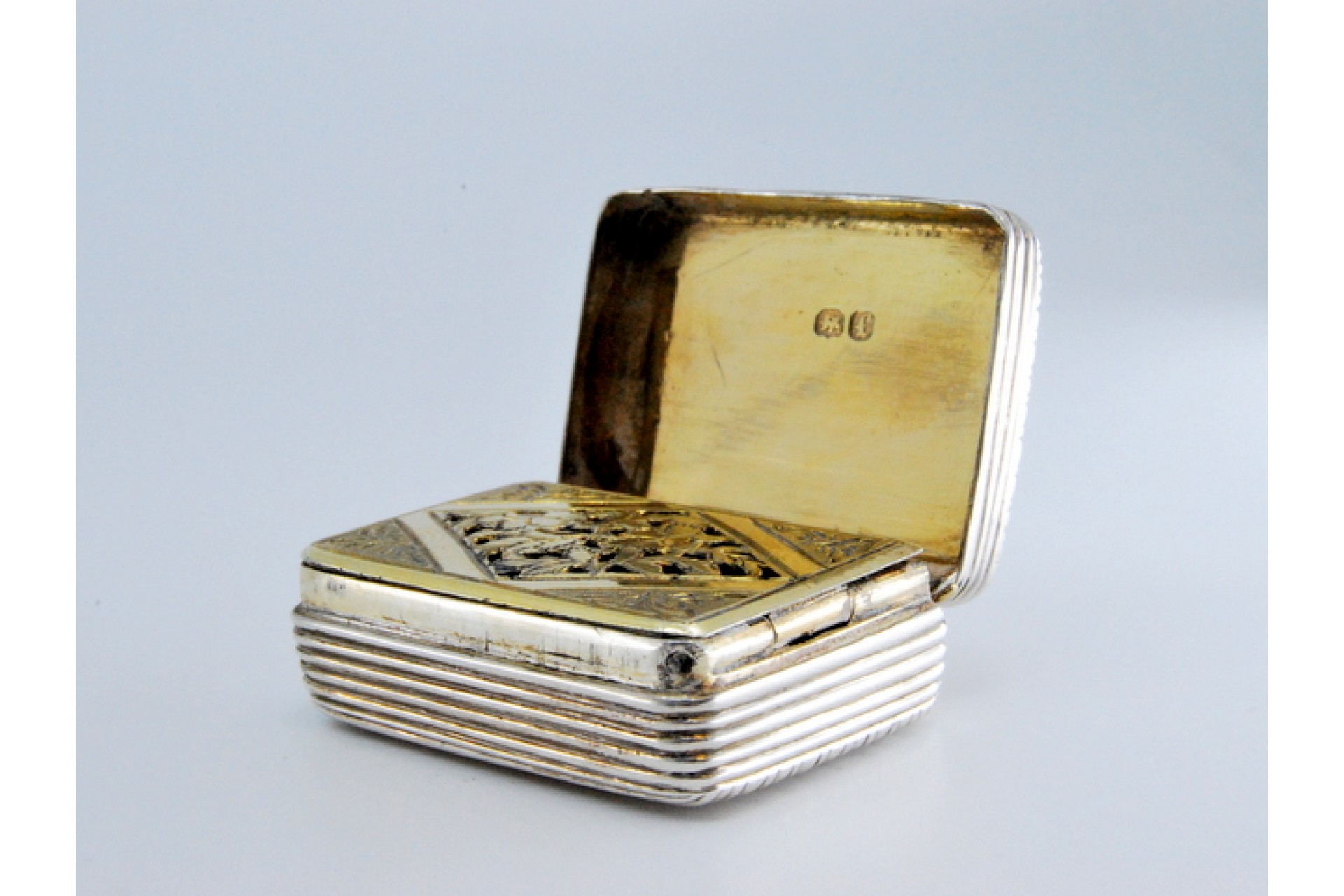 • Descrição: Caixa de Vinagrete em prata e ouro canelada em toda a envolvência do período de George IV.
