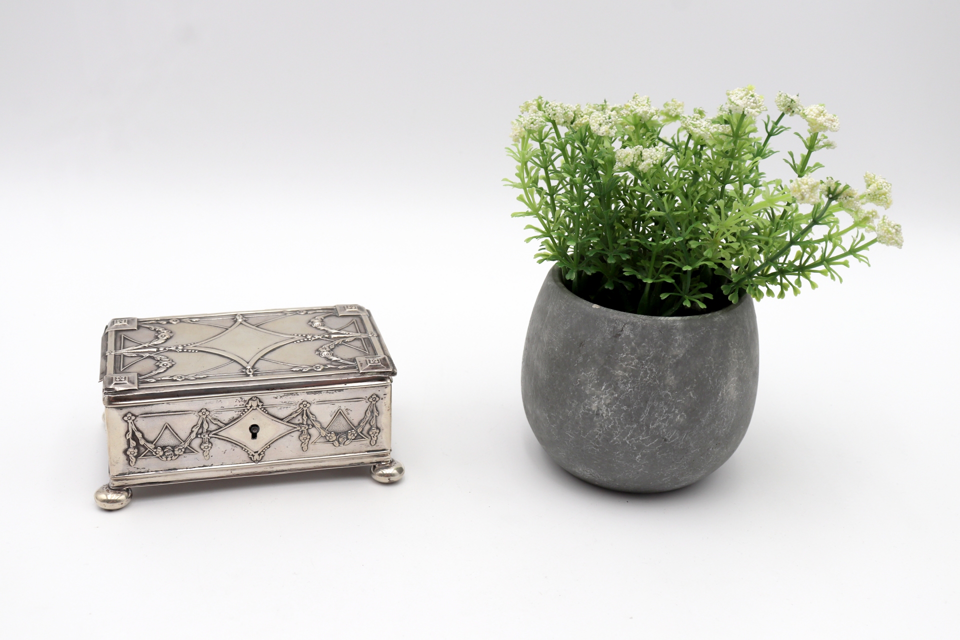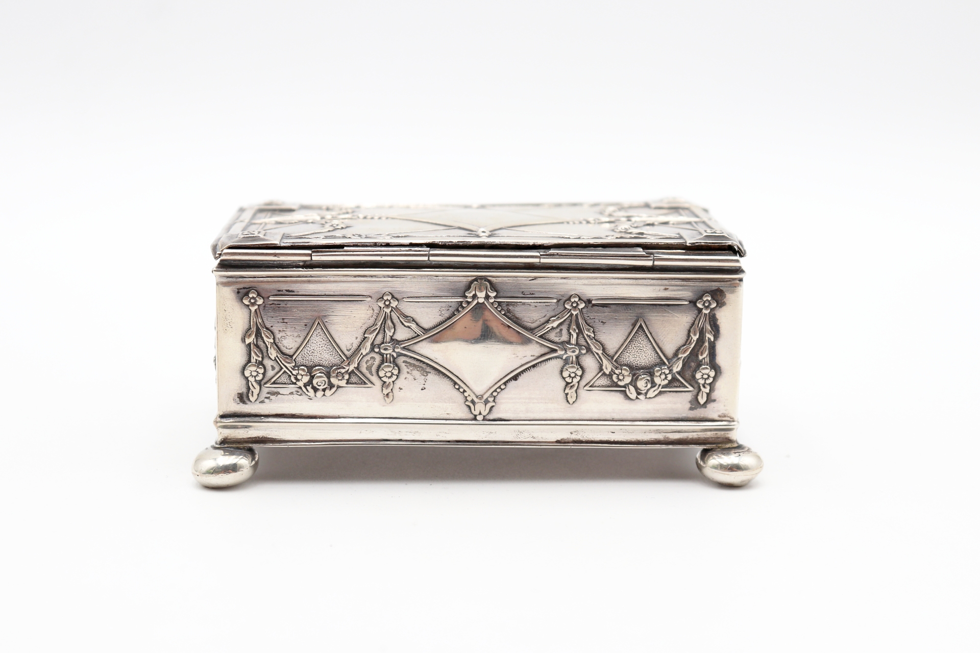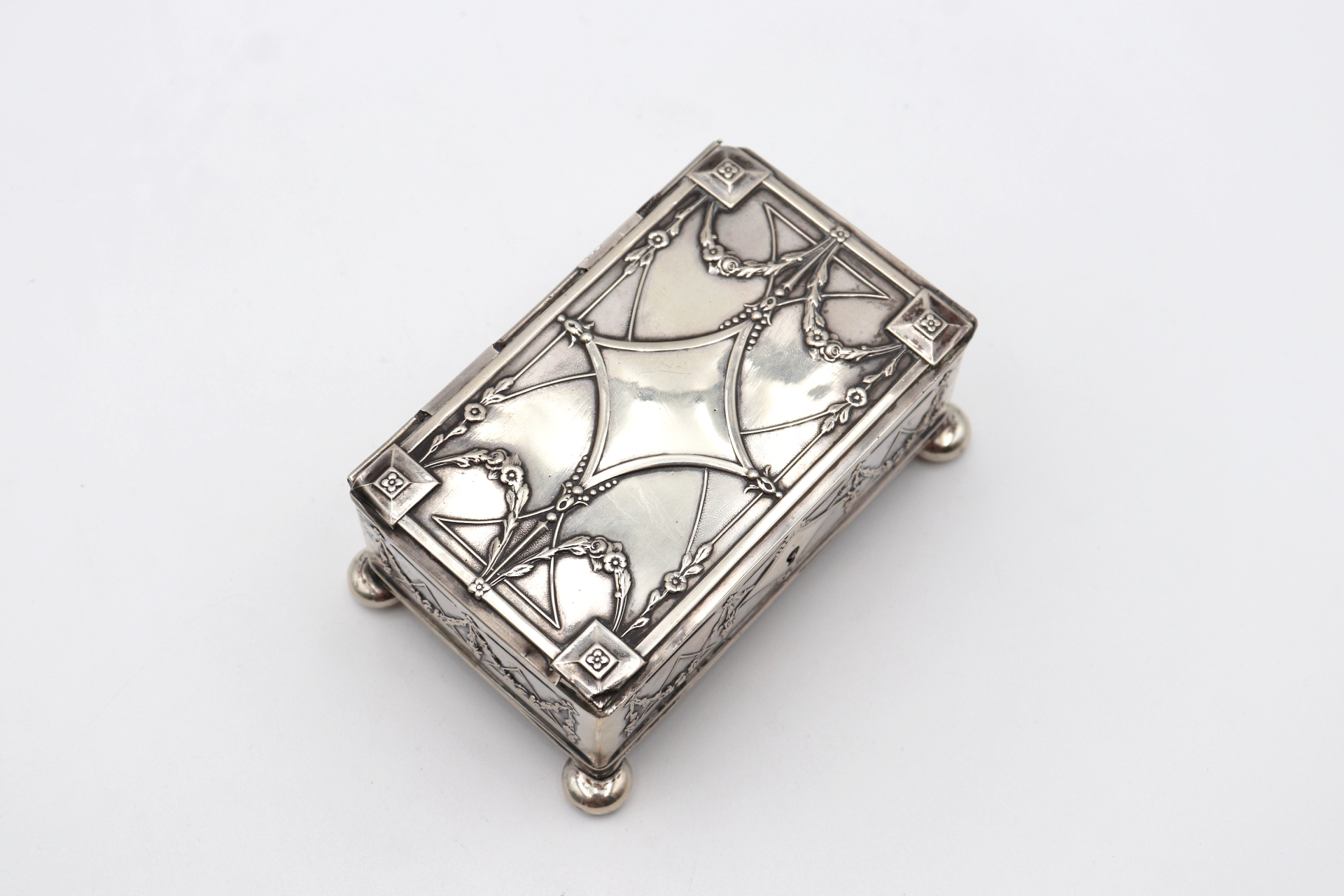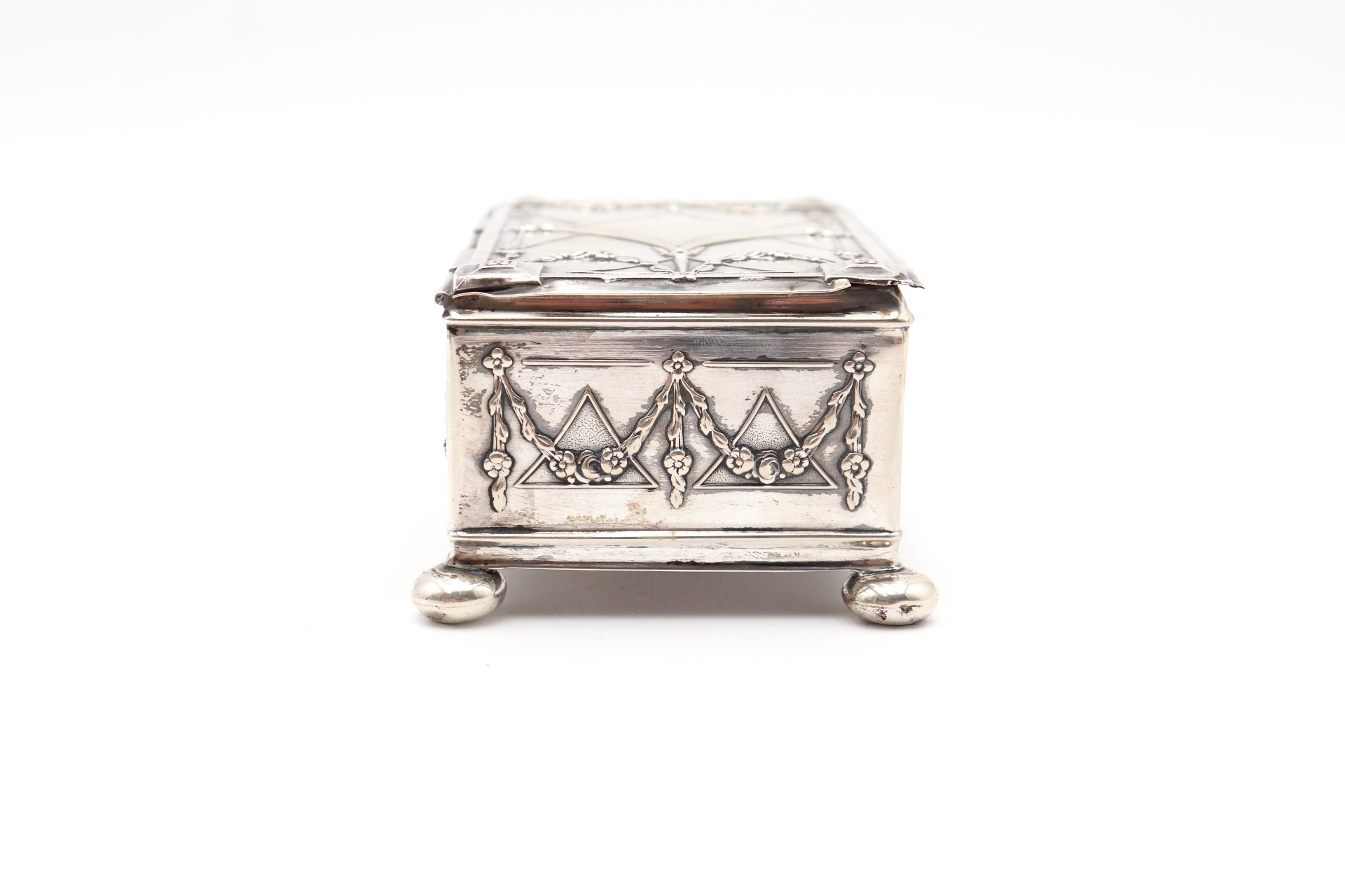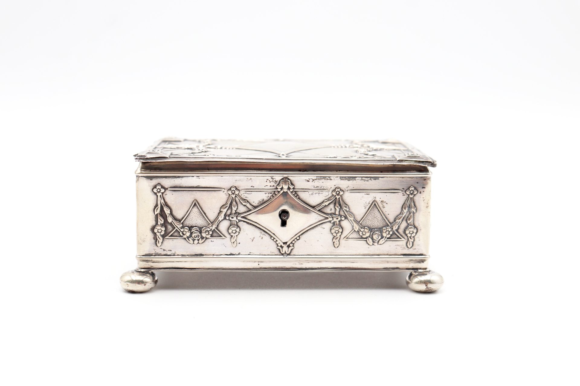 • Descrição: Guarda jóias em prata com elementos relevados assente em pés esféricos