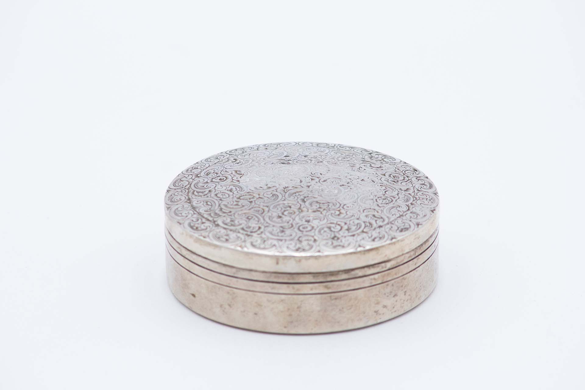 Caixa em prata de forma circular com relevos vegetalistas na tampa amovível.