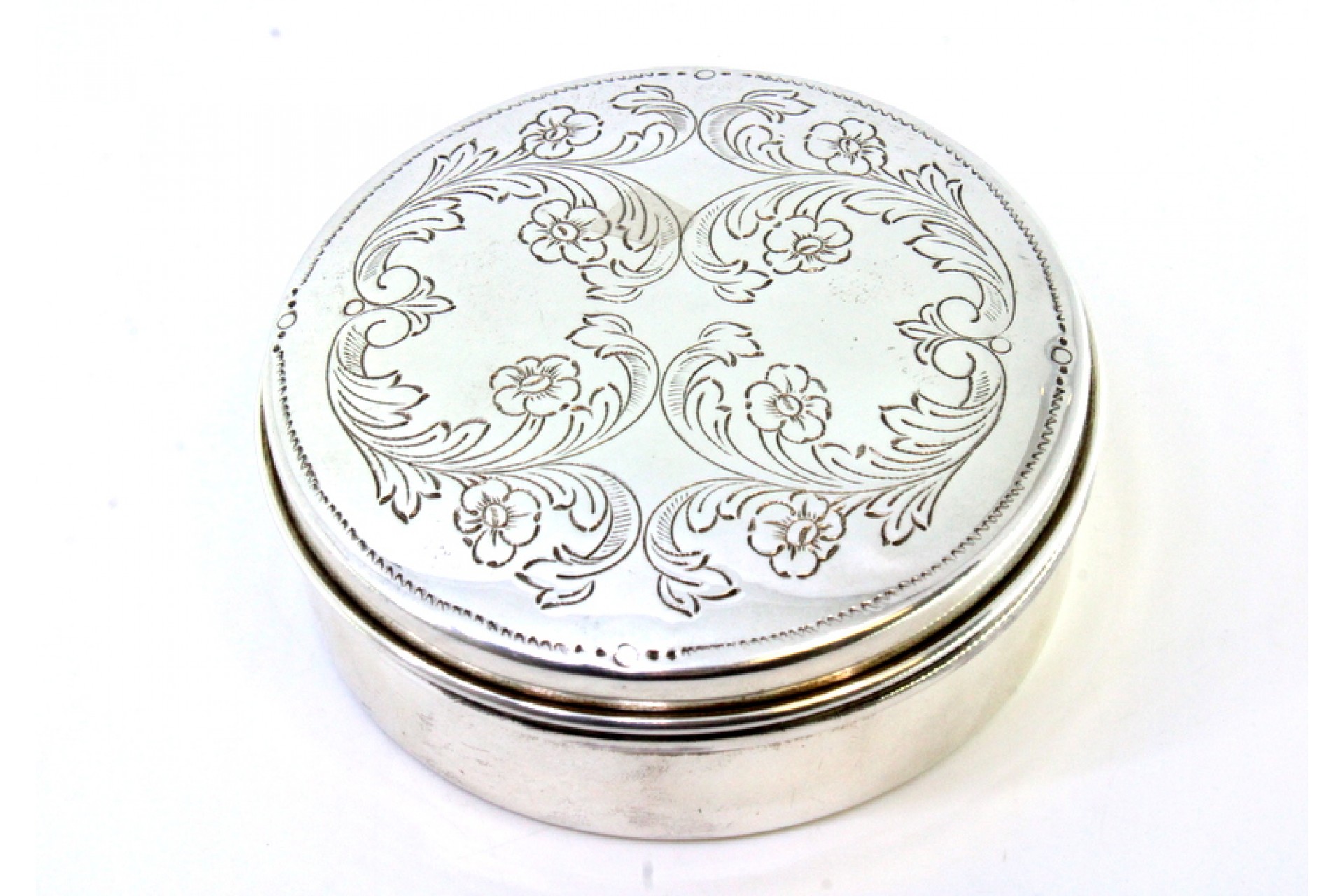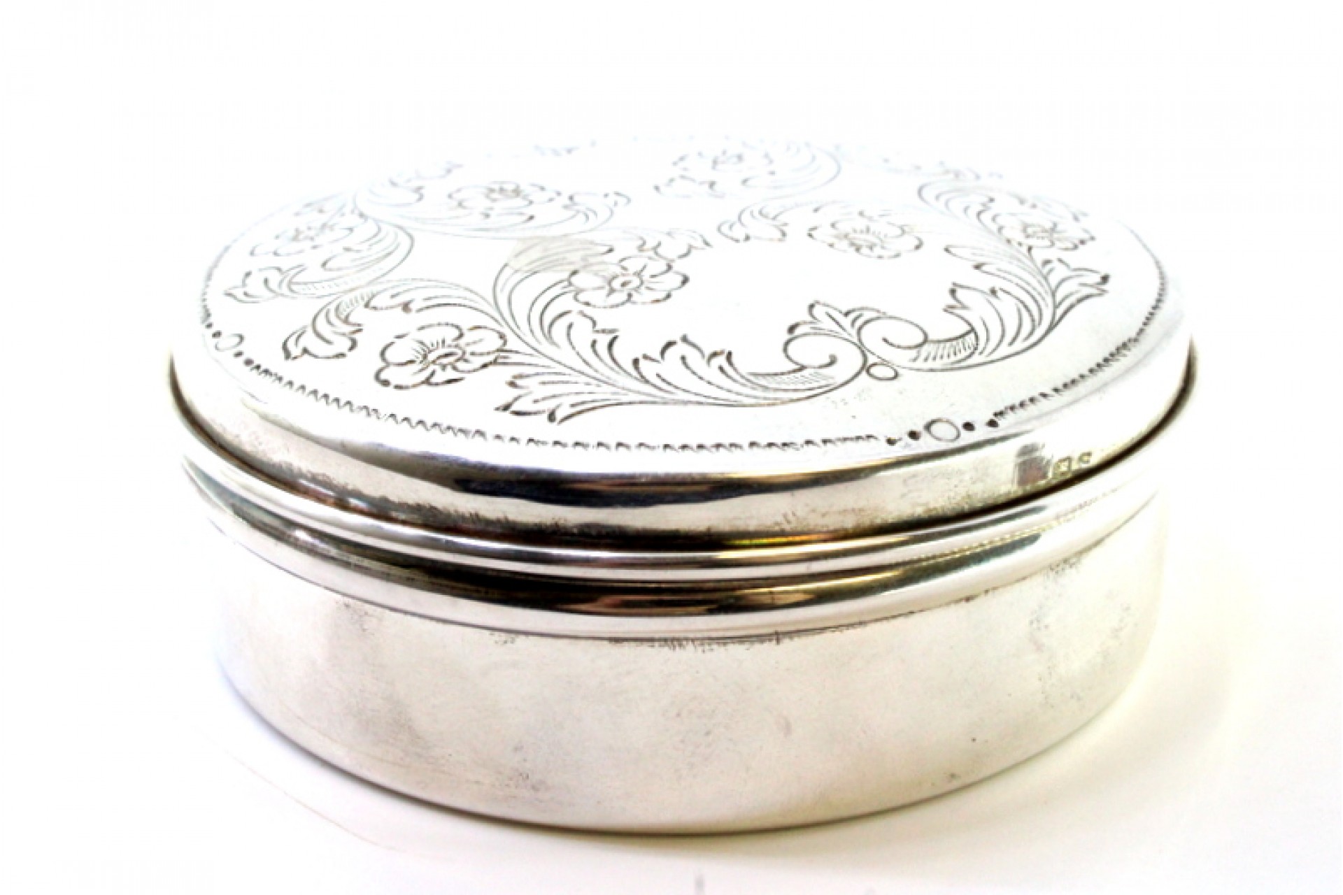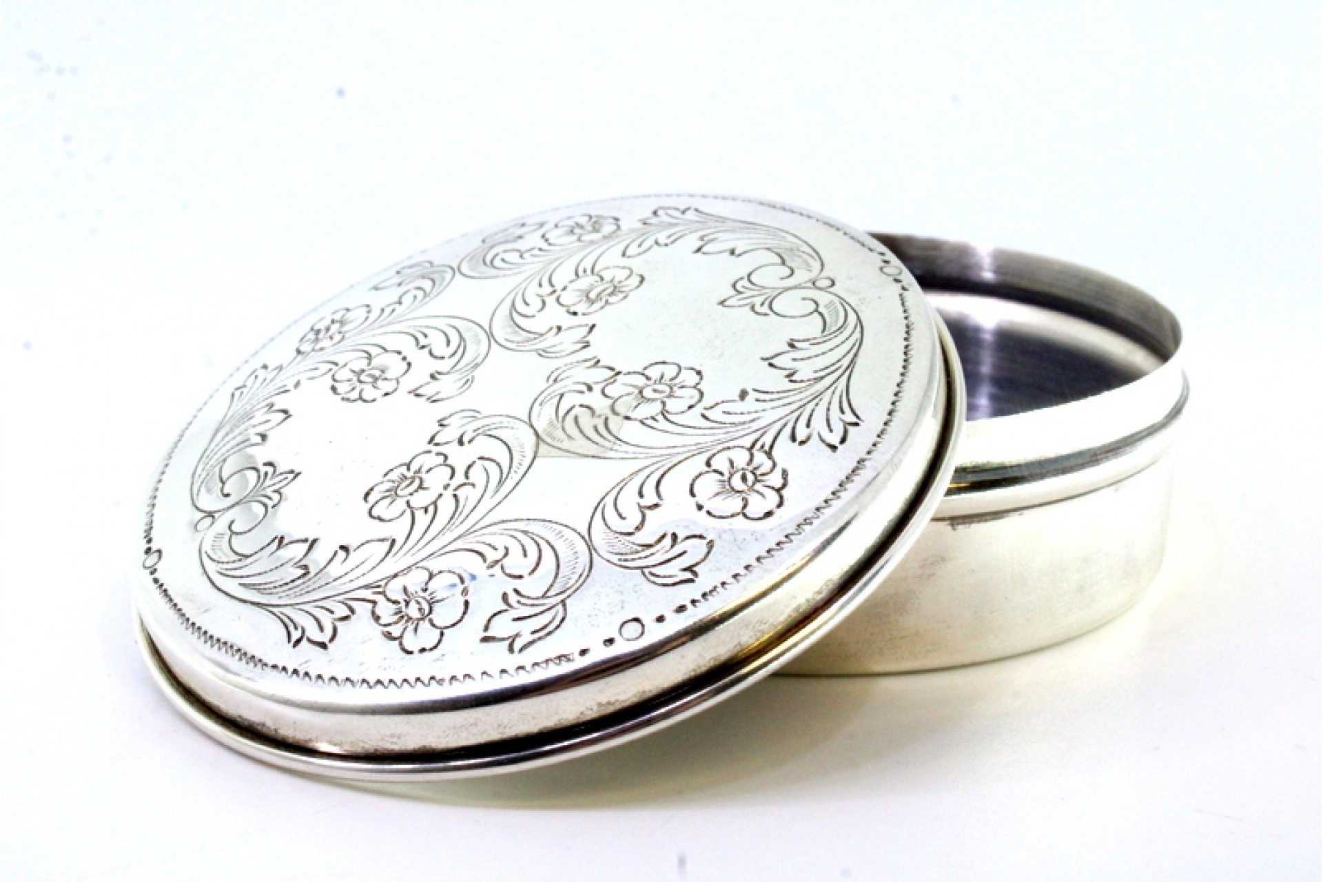 Caixa em prata de forma circular com relevos vegetalistas na tampa