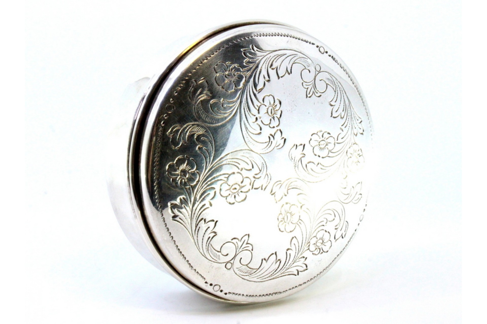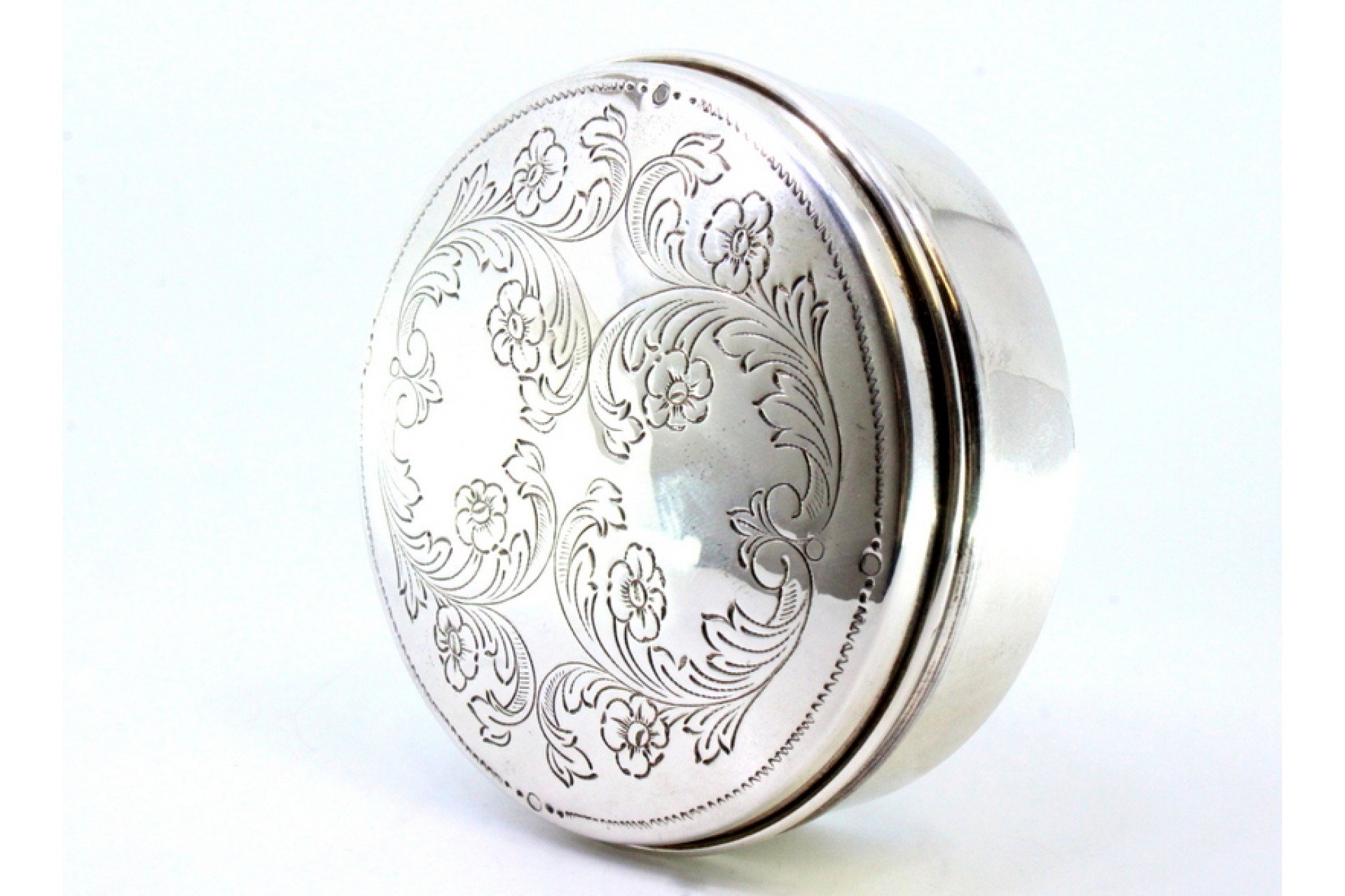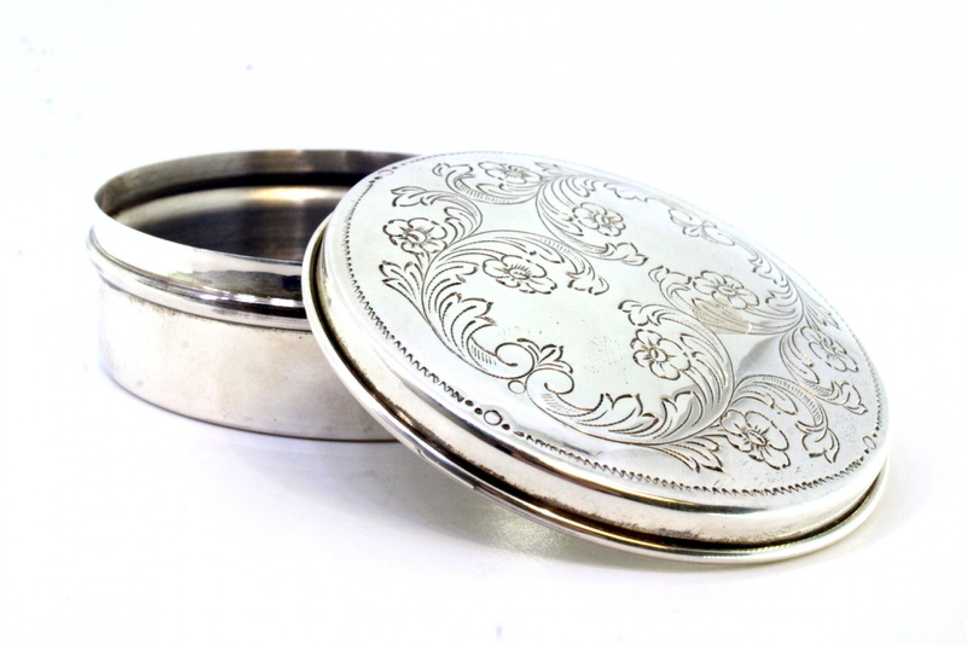 Caixa em prata de forma circular com relevos vegetalistas na tampa
