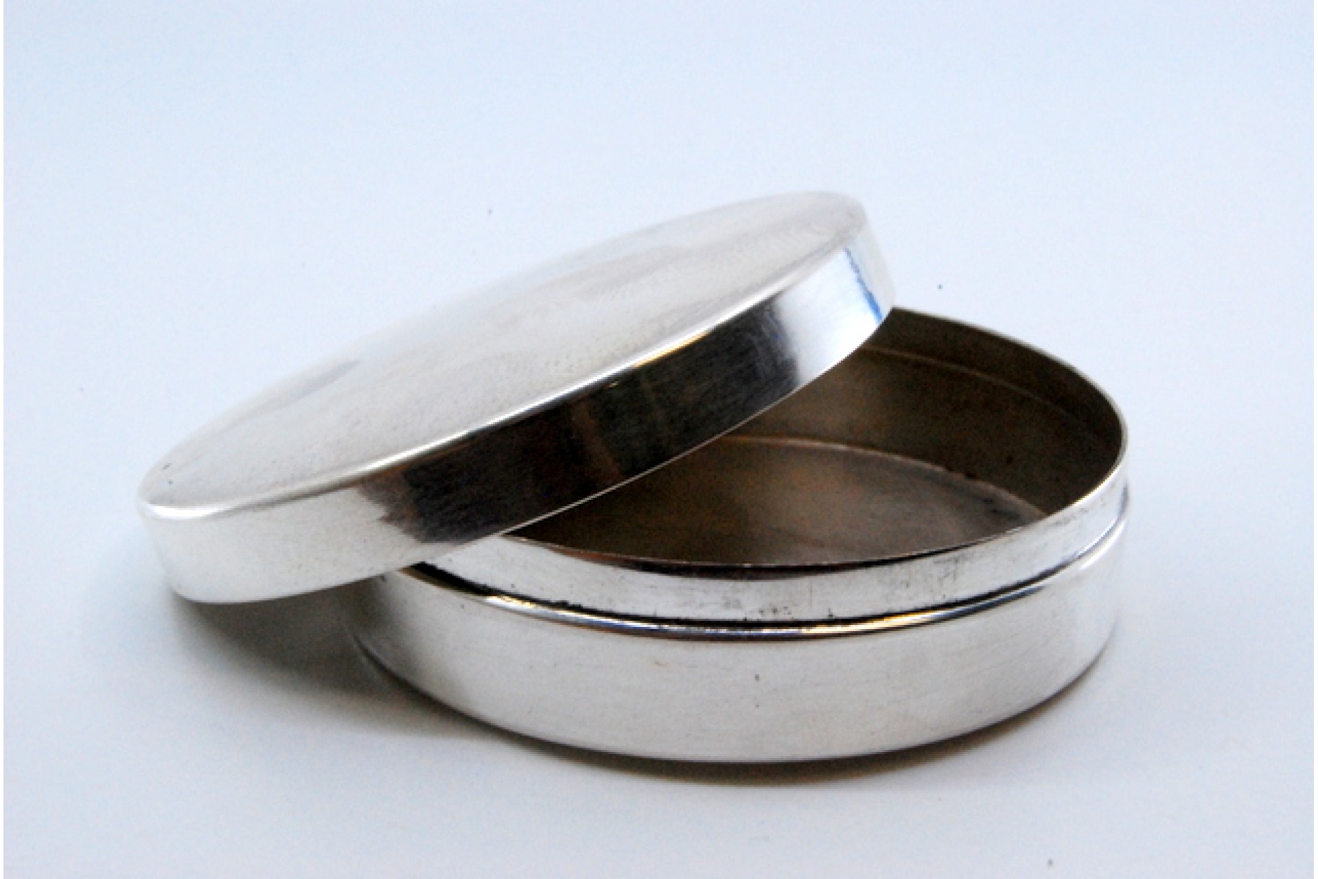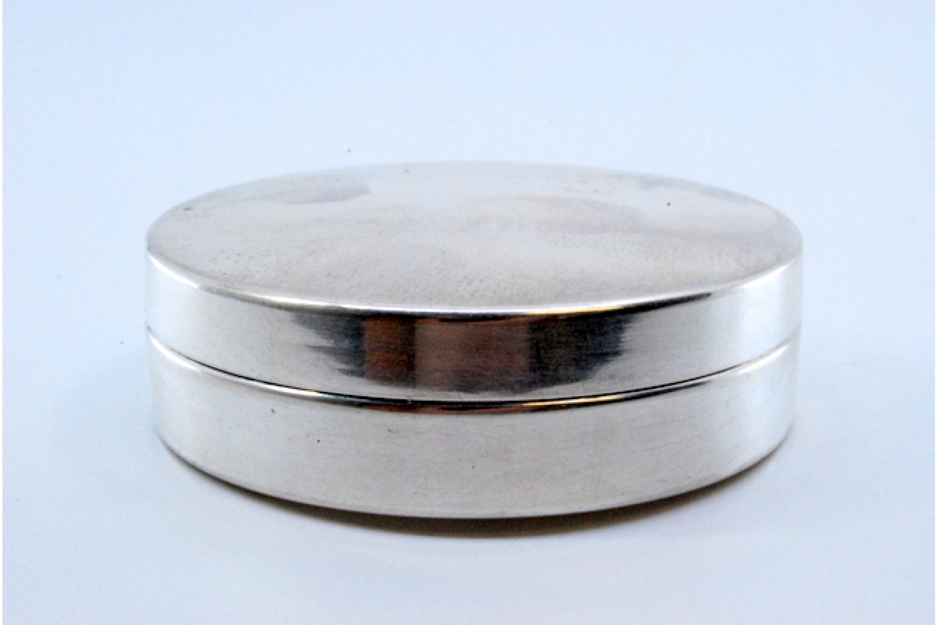 • Descrição: Caixa em prata lisa de forma circular e tampa amovível.
