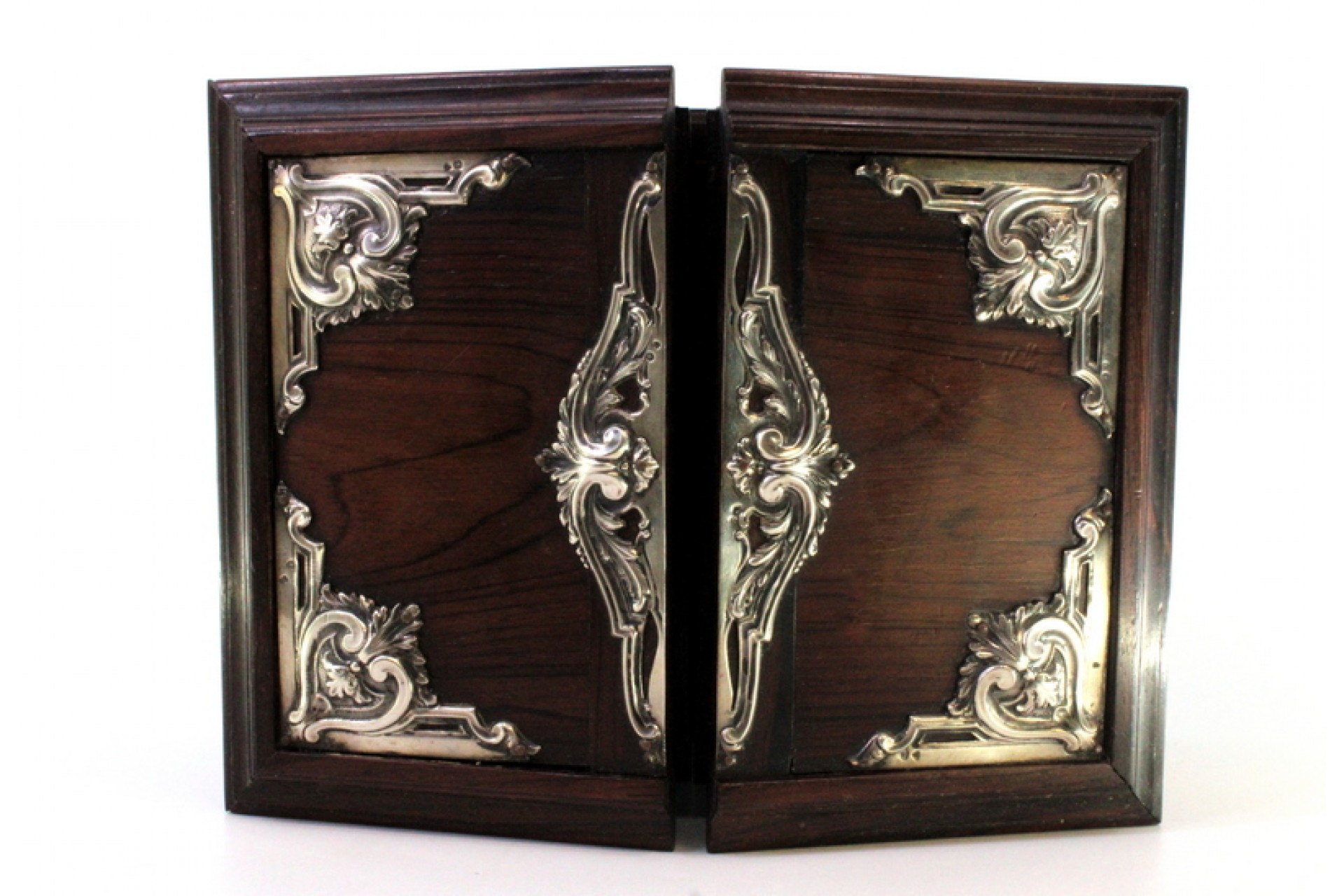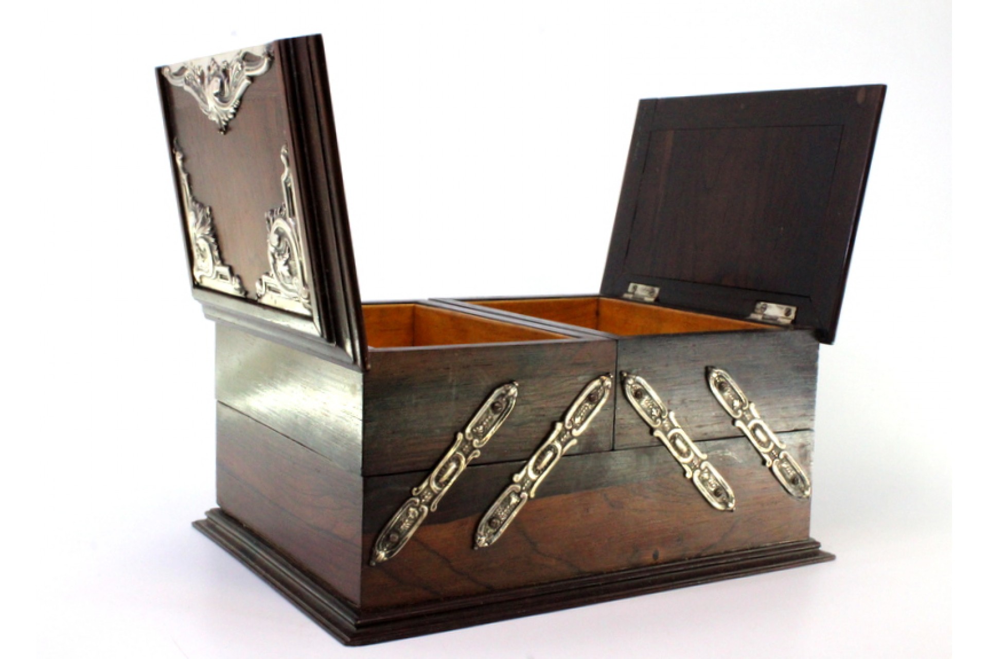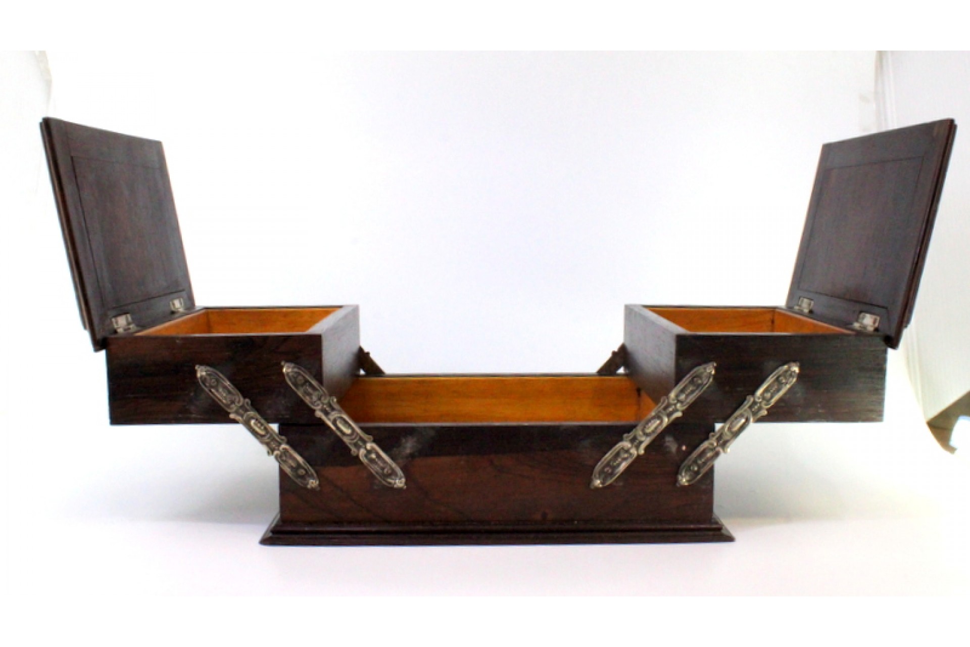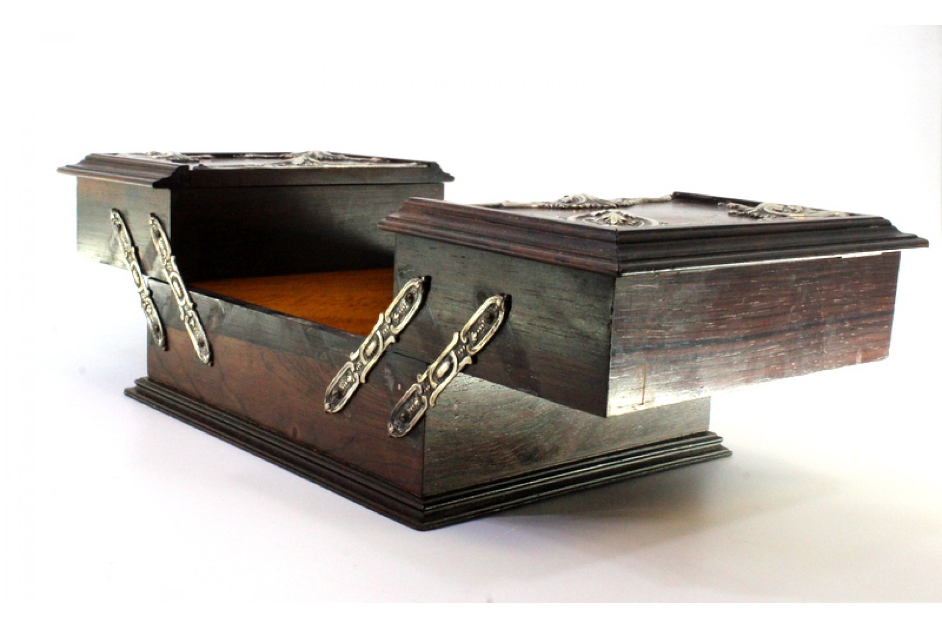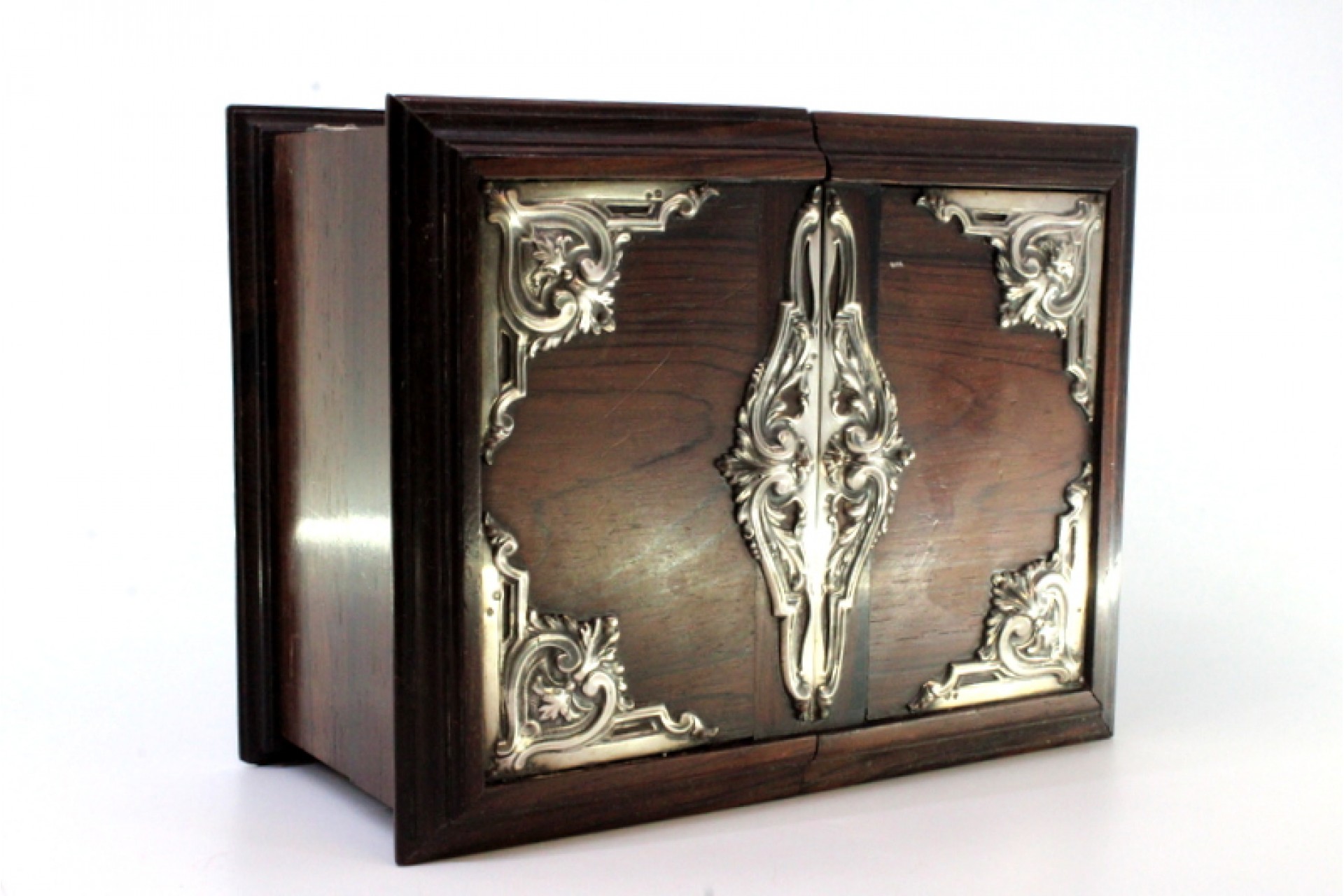 Caixa para jogo de cartas em madeira de pau santo com aplicações em prata
