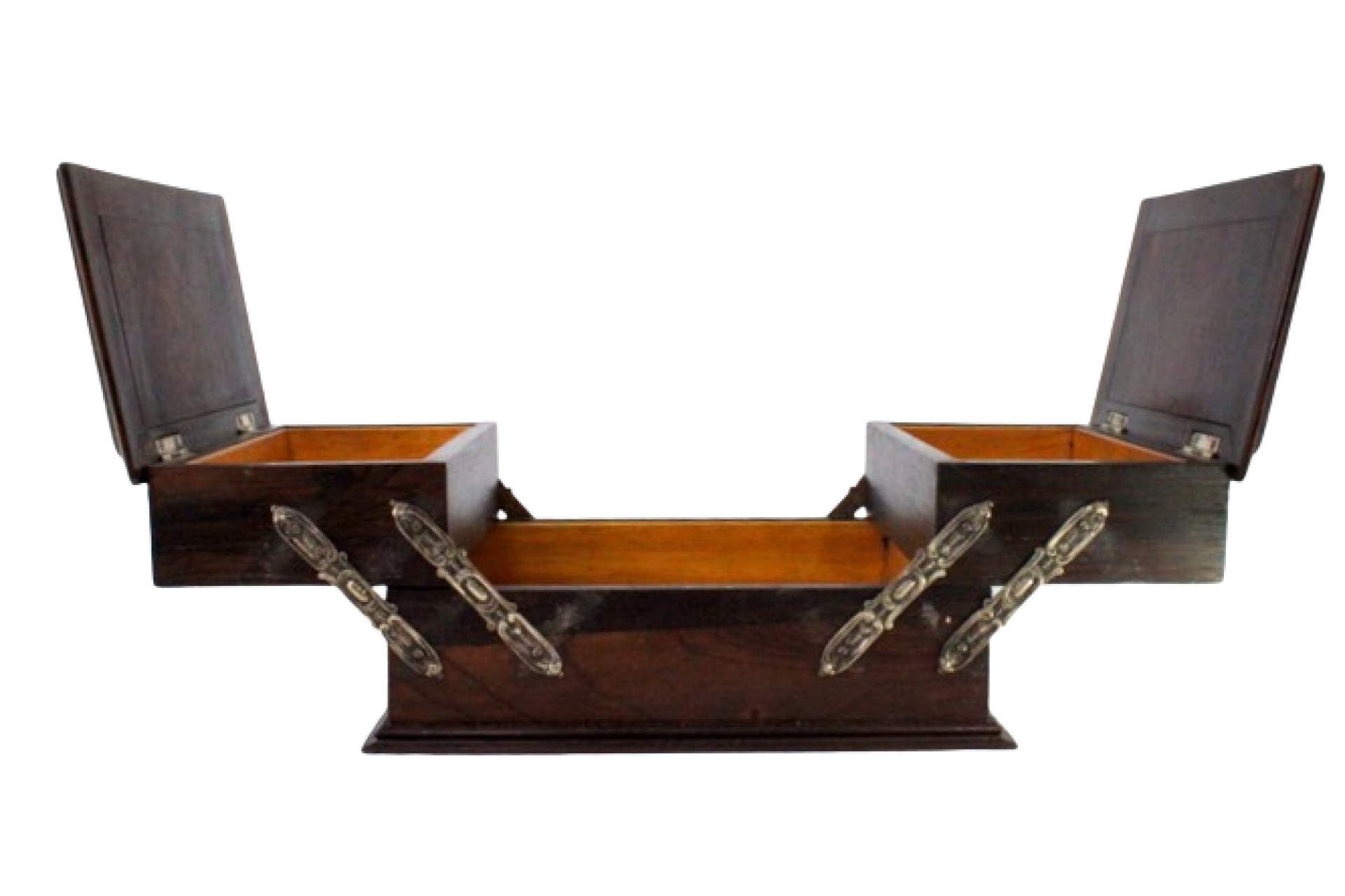 • Descrição: Caixa para jogo de cartas em madeira de pau santo com aplicações em prata e três divisões no interior.