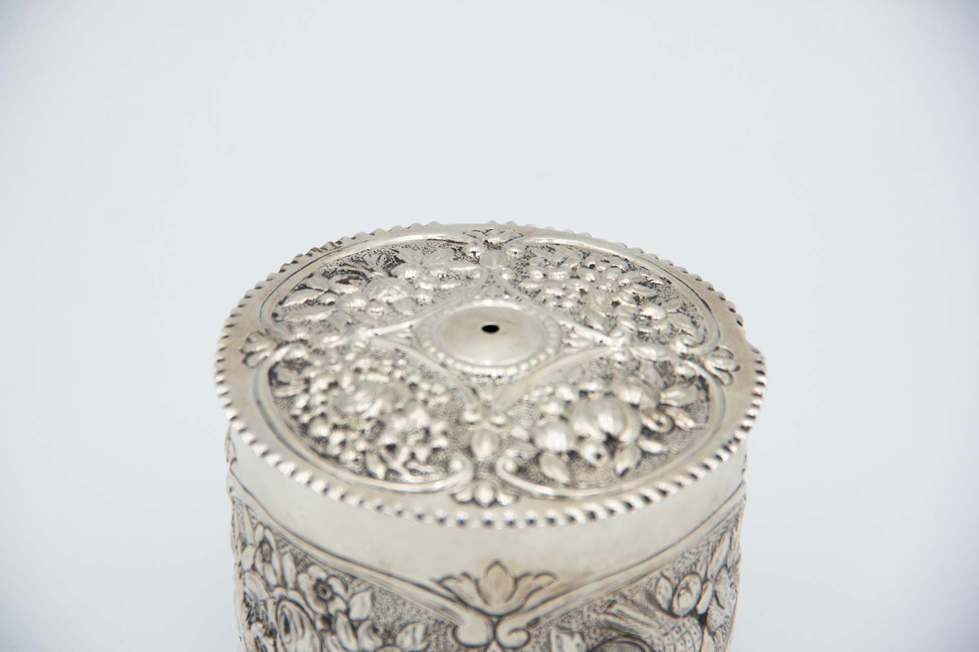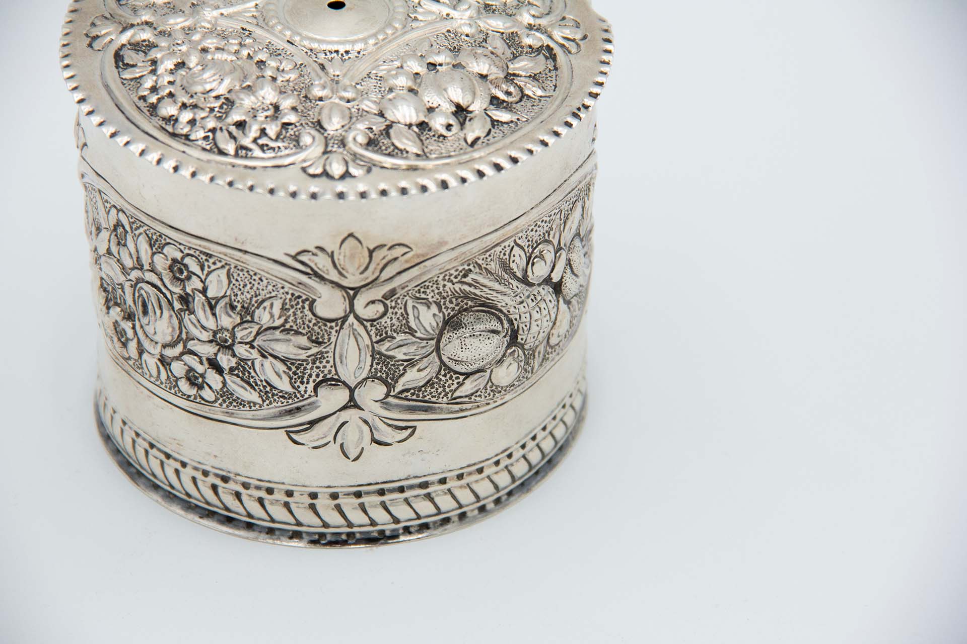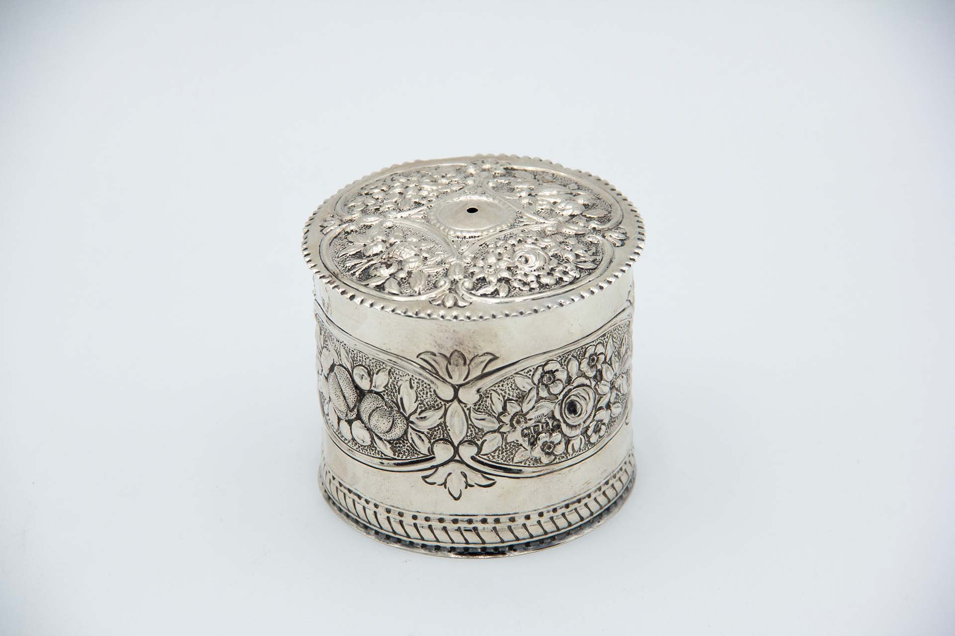 Caixa em prata para rolo de cordel ou lã com relevos alusivos a flores e frisos ondeados na tampa.