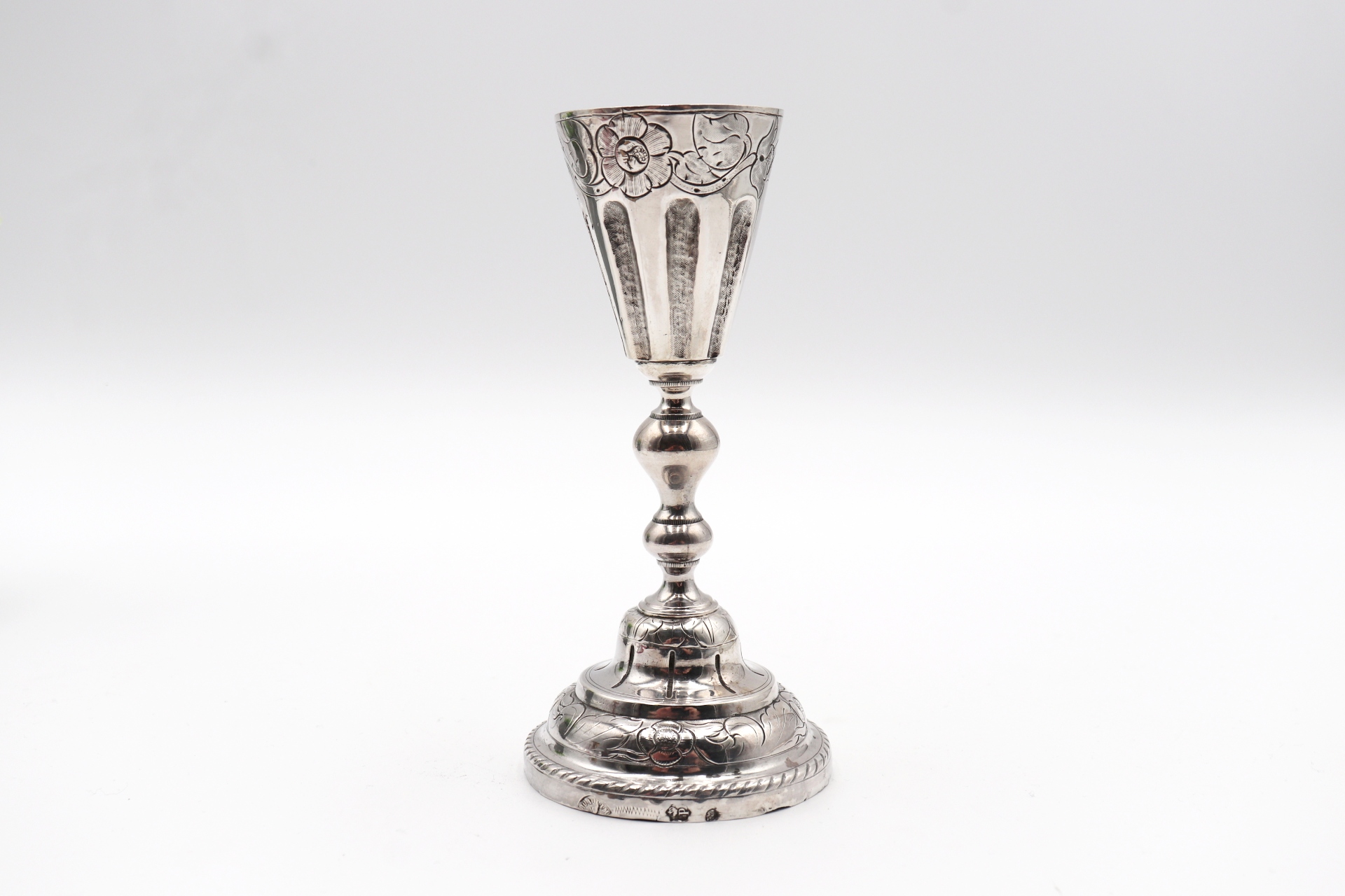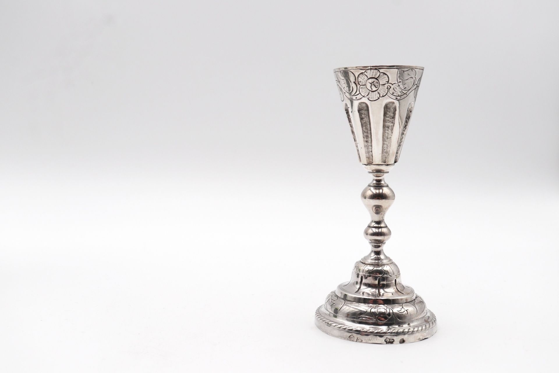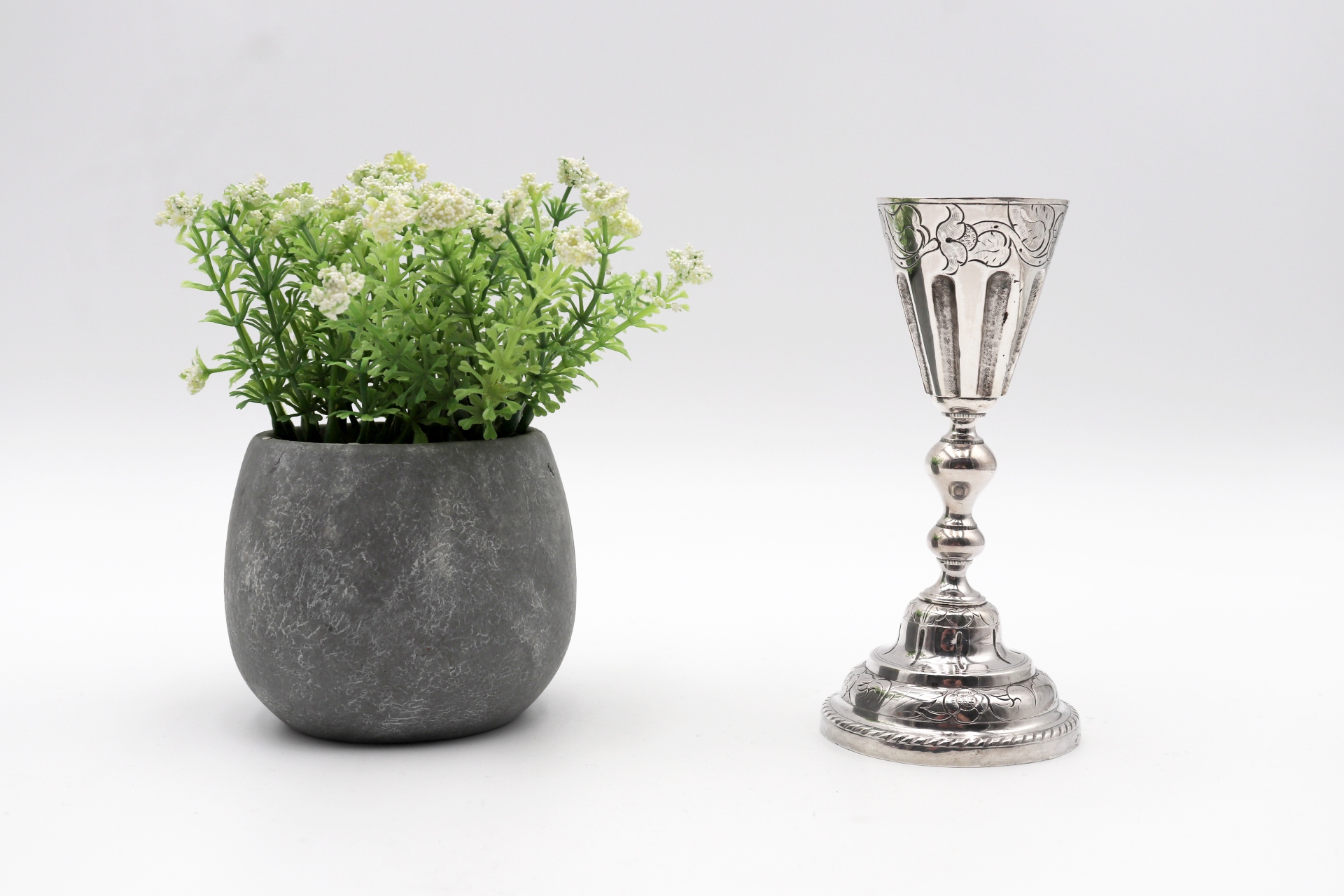 • Descrição: Cálice em prata canelada com motivos florais gravados no topo e na base de formato circular.