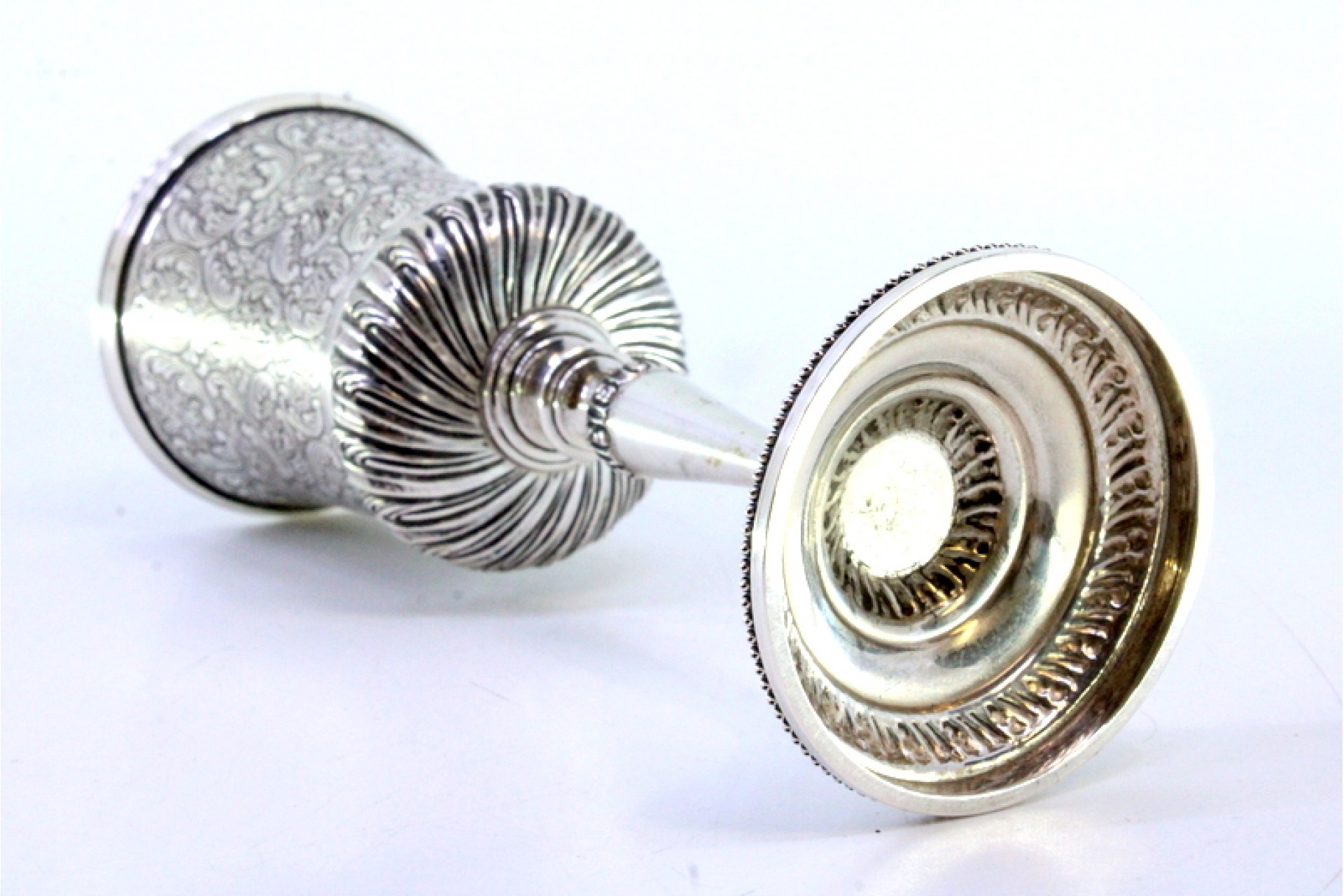 Cálice em prata cinzelada com relevos na envolvência e a base circular com frisos perlados.