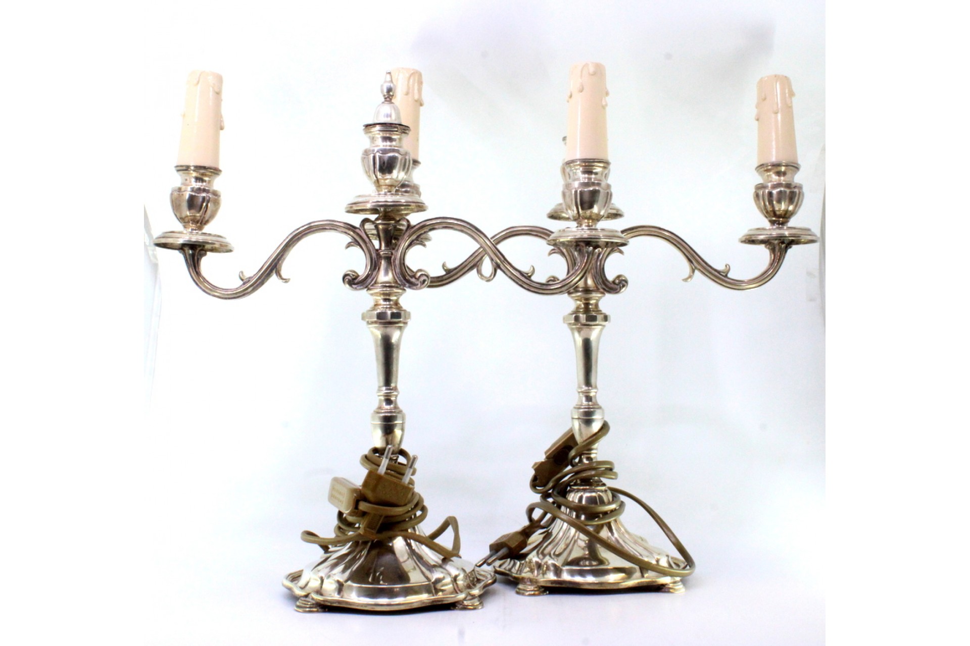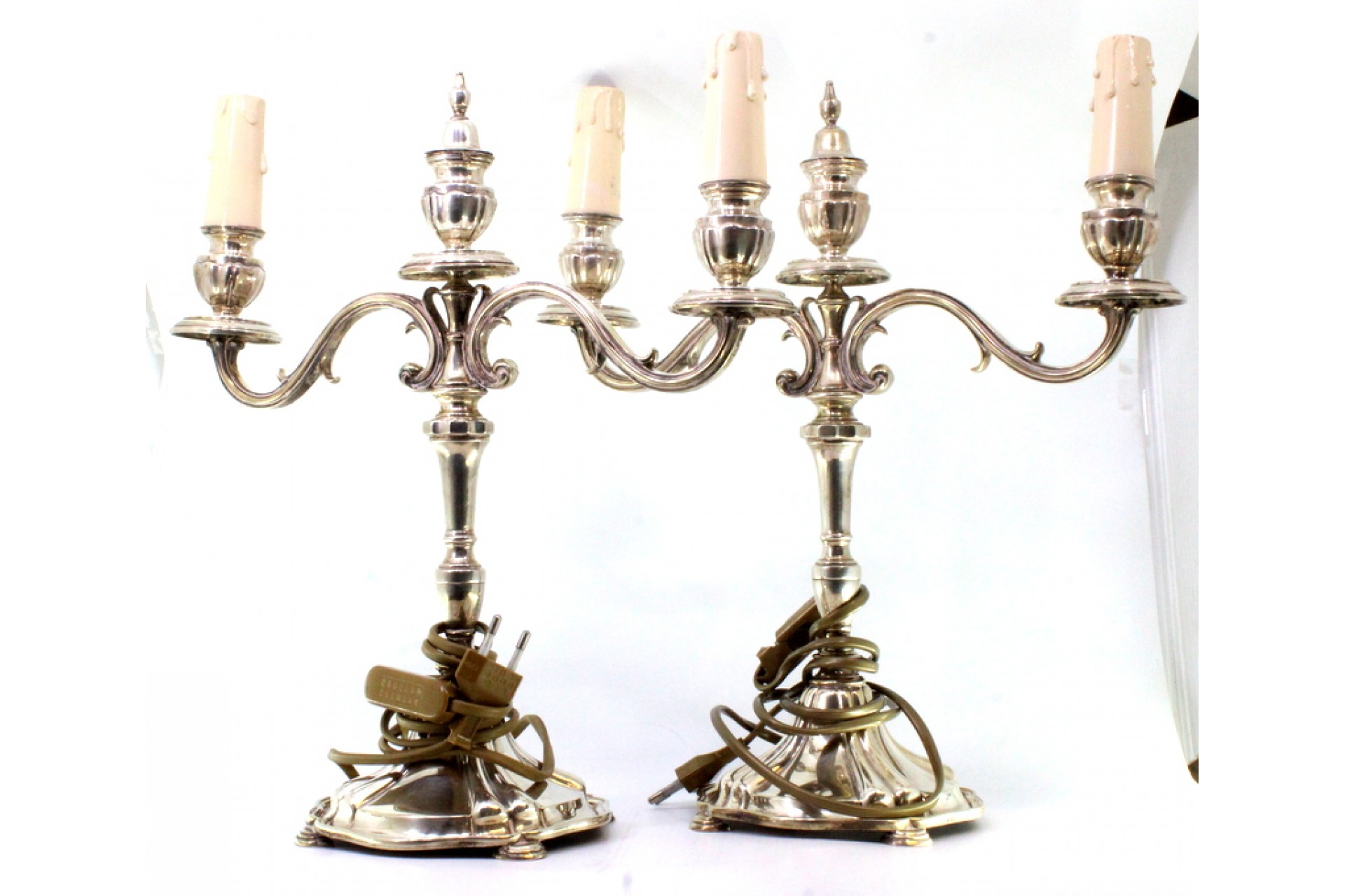 Candelabros de dois lumes em prata com relevos e aplicações, eletrificados