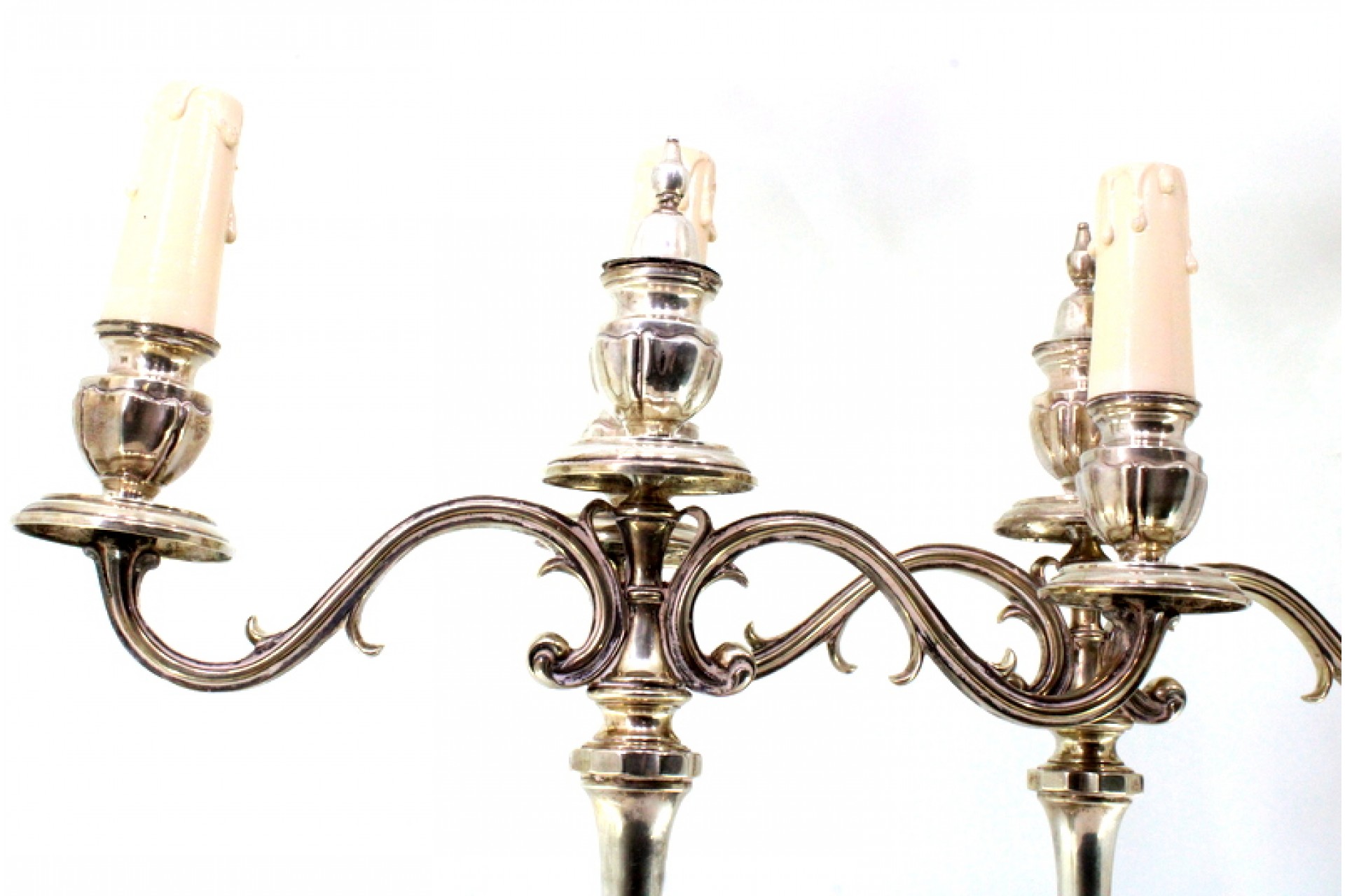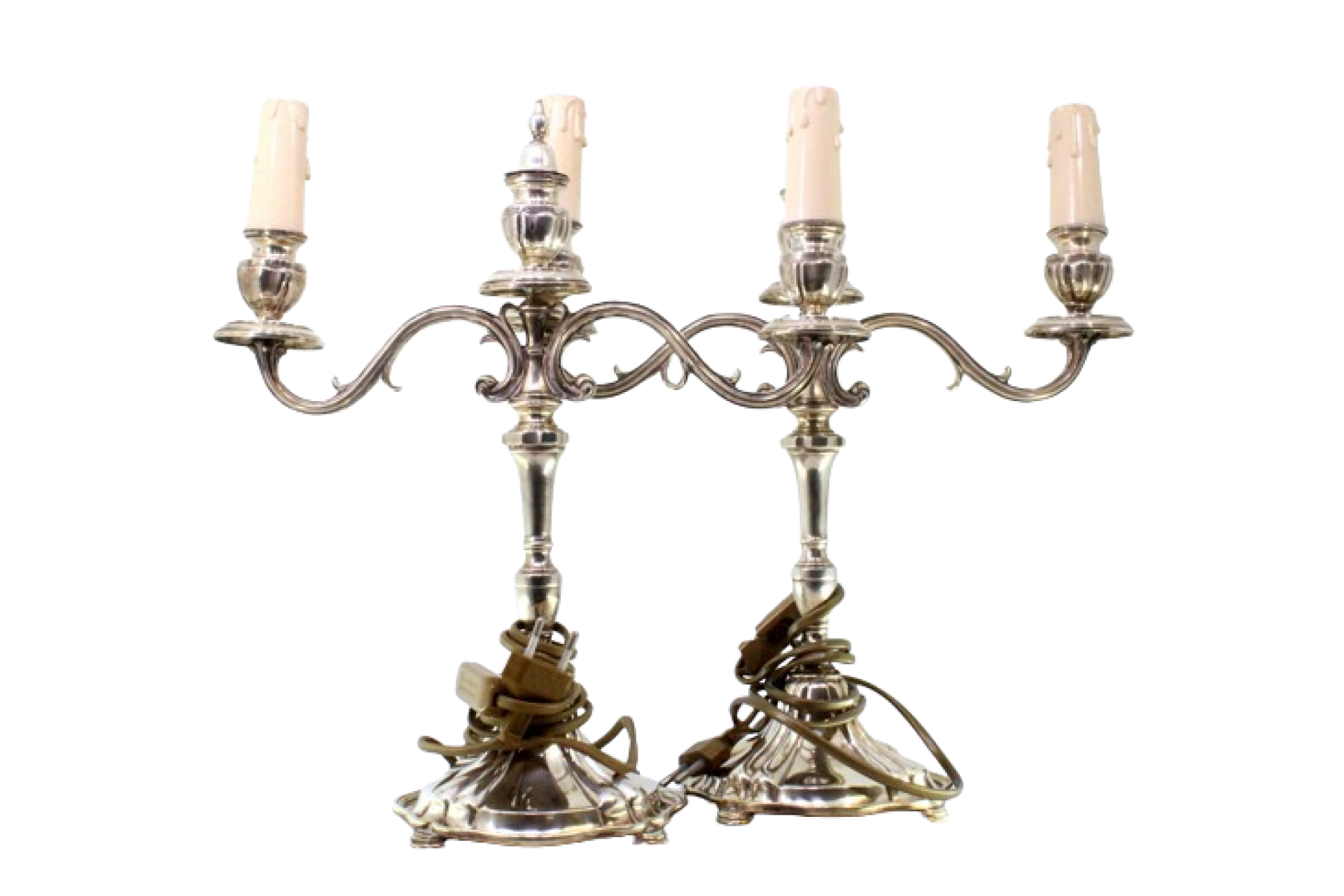 • Descrição: Candelabros de dois lumes em prata com relevos e aplicações, eletrificados com cabos.