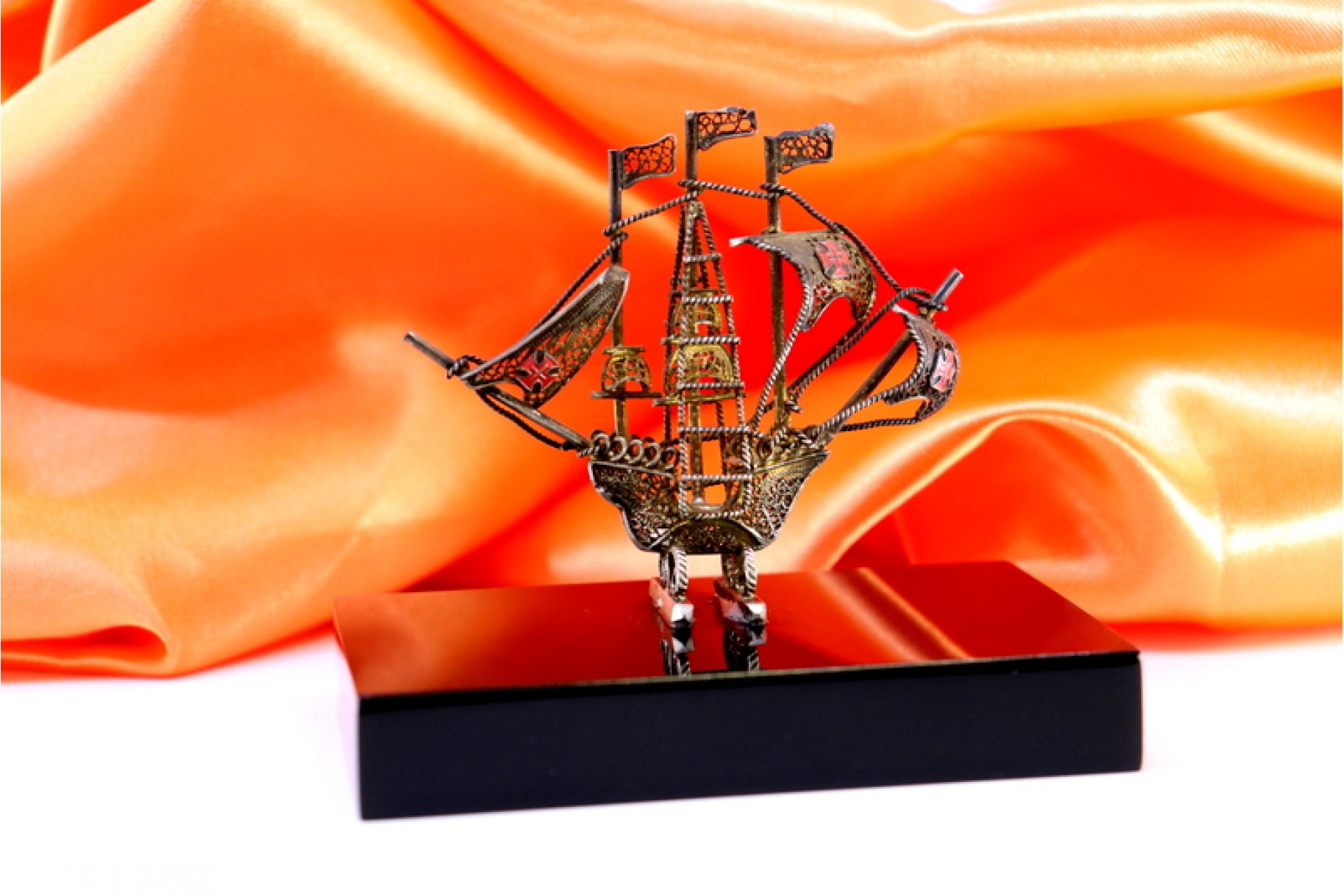 Caravela em miniatura em prata de filigrana com base em matéria sintética retang