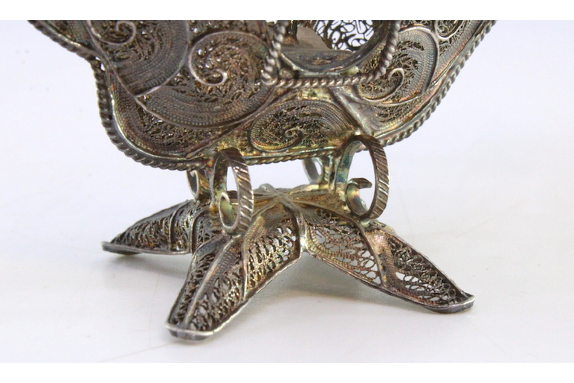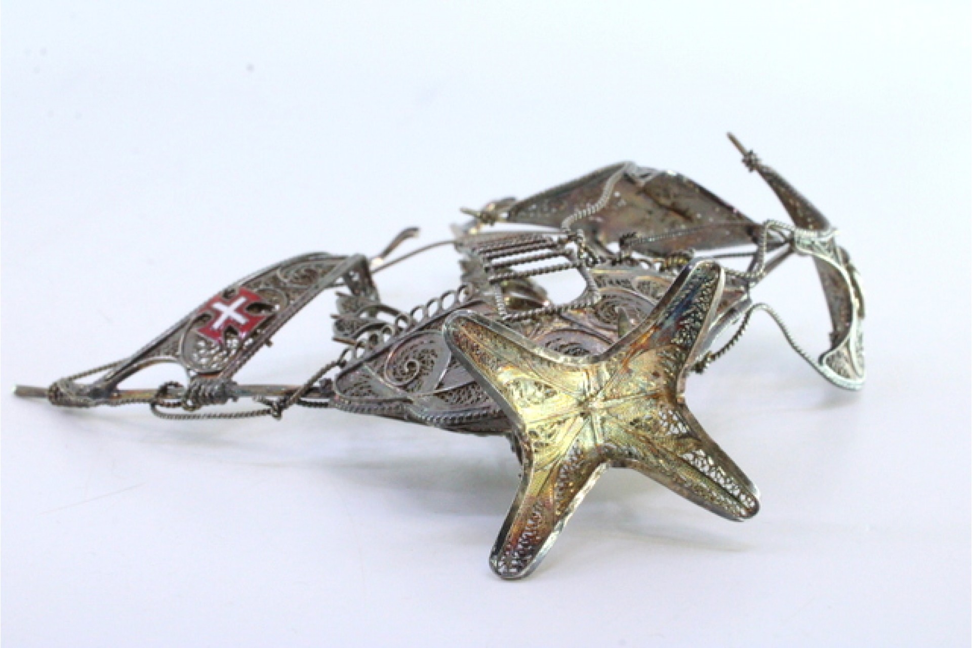 • Descrição: Caravela em prata de filigrana com três bandeiras e símbolos portugueses.