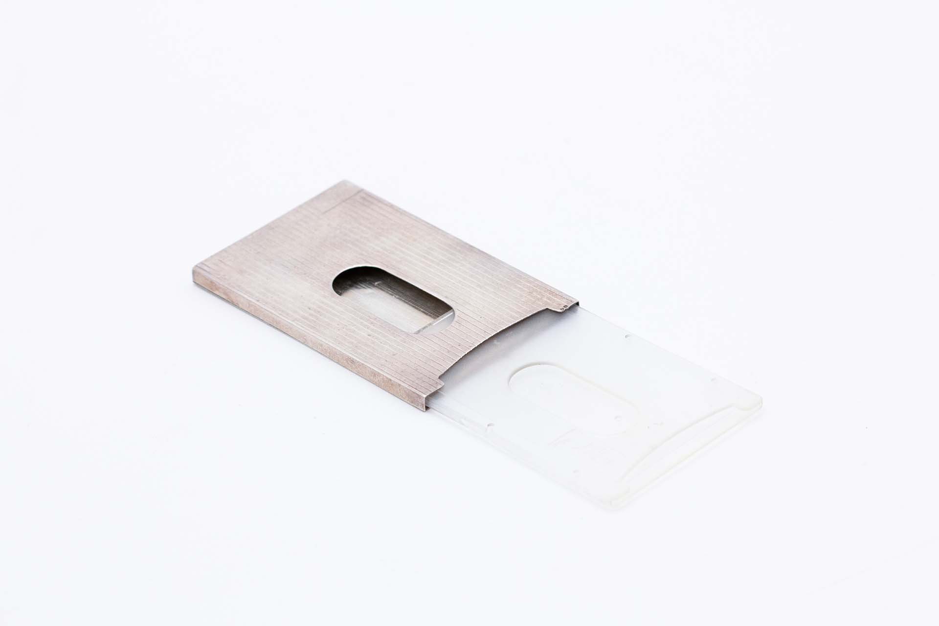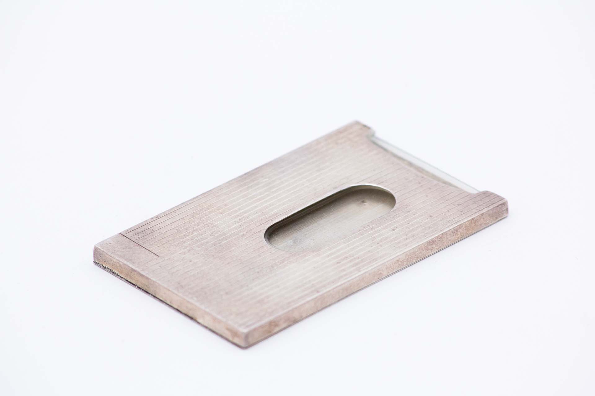 • Descrição: Cartoneira de prata com bandas caneladas ao alto, cartela para monograma e elemento de plástico no interior.